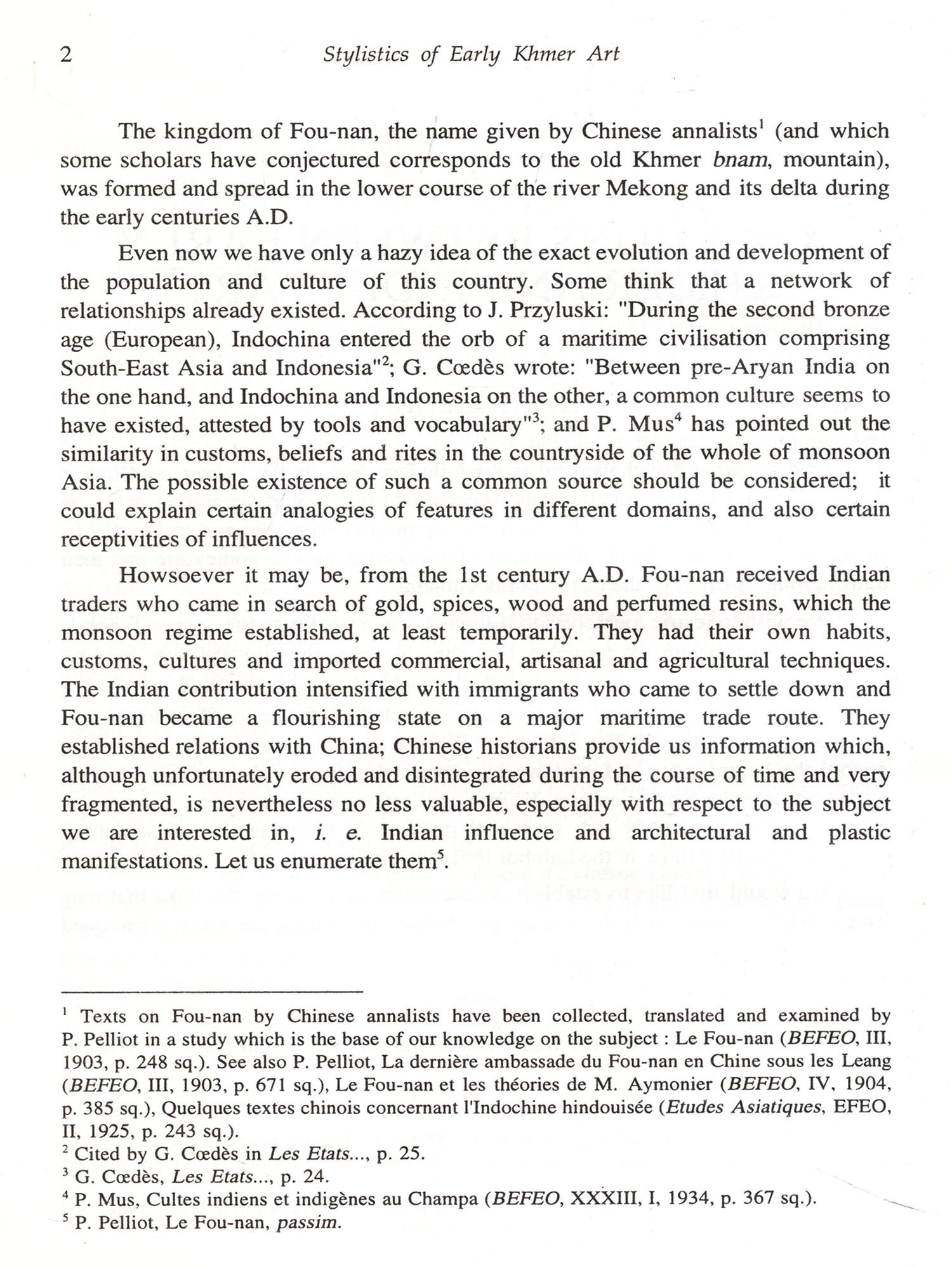 The works of Mireille Benisti are exemplary, from the point of view of refinement of methods. She has made stylistics of early Khmer and Indian art her life work. All her researchers and site explorations were conducted, over some thirty years, from the fifties to the seventies. All her publications were in French. Now, it is obvious that Indian and international research on Indian art is fast progressing and that the results appear almost exclusively in English. The works of Mireille Benisti have a due place in the present current.