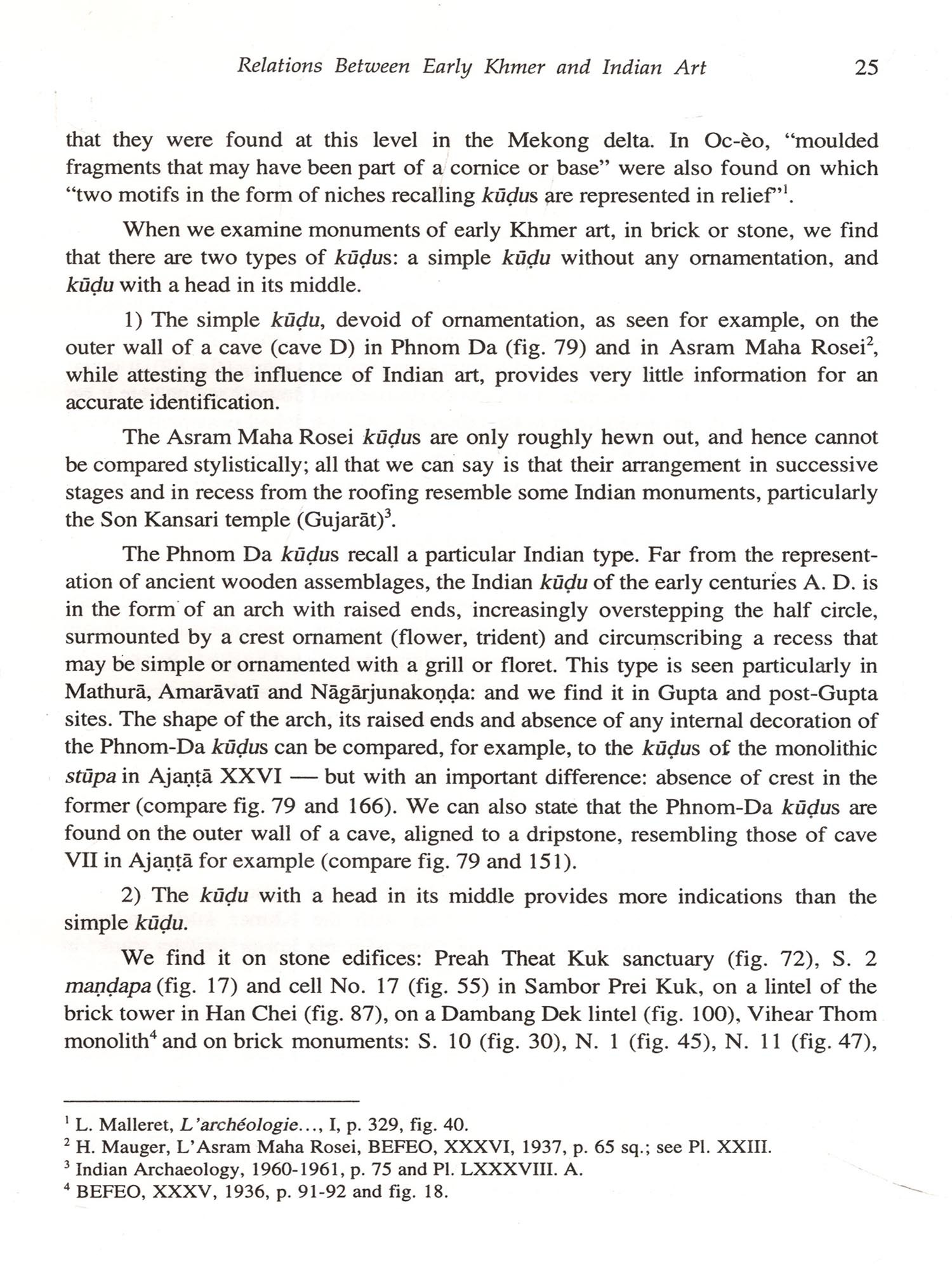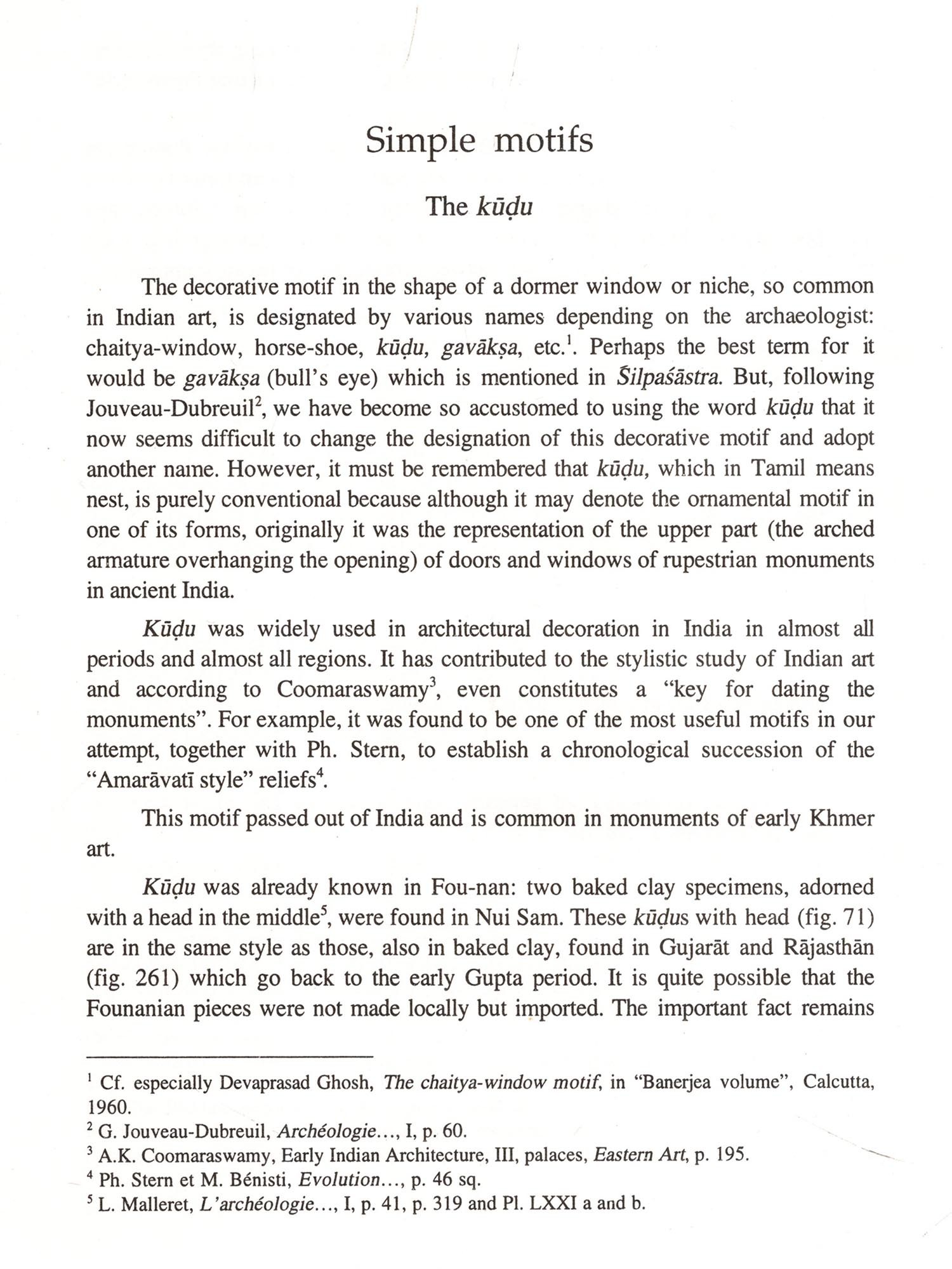 Madame Benisti held that art is a living entity and that it is always in a state of transformation. In this context, she has pointed out links and transitions between different styles, moments of evolution in which a particular style abandoned some characters and adopted the primitive aspects of new characters of a later style. Several articles contained in this volume bring to light moments of transition from one style to another. She has given precise definitions and analysis of decorative motifs the bezelband, the makara, the voluted leaf, the beaded garland, pendant, etc. her systematic survey of styles, along with detailed study of iconography, thus provides a solid foundation for a comprehensive study of Khmer art.