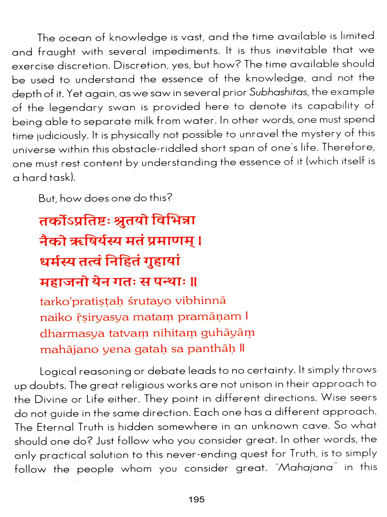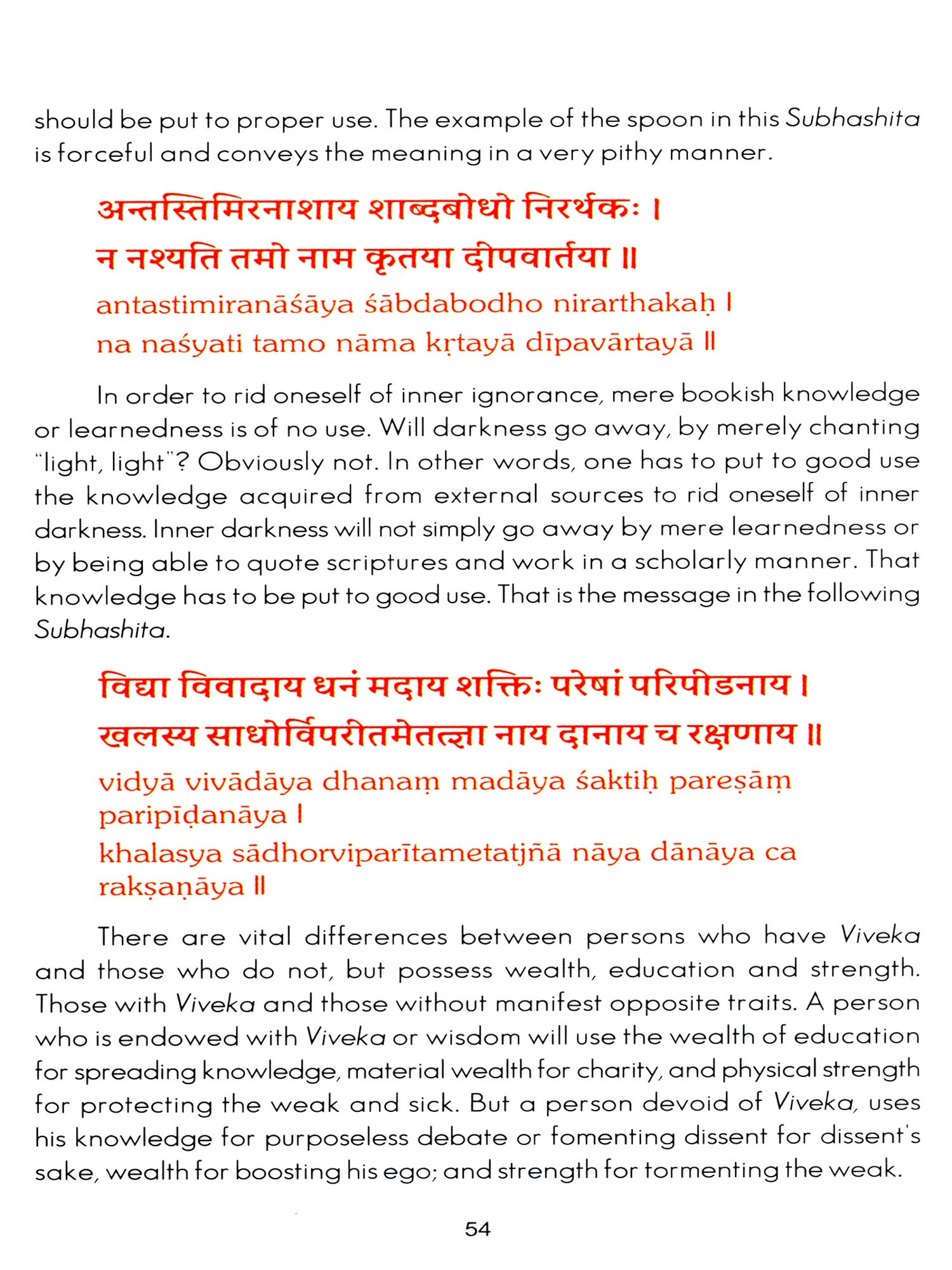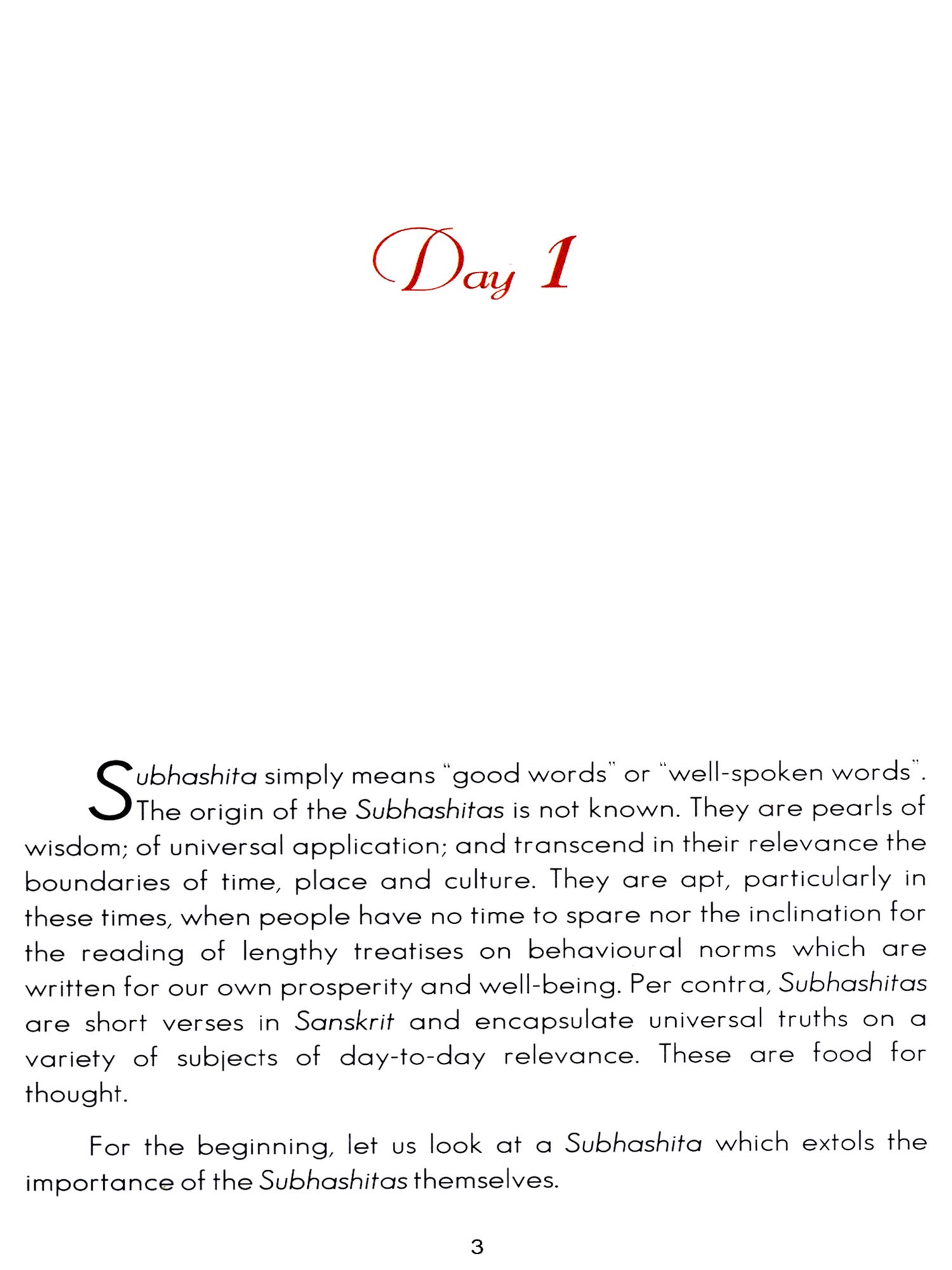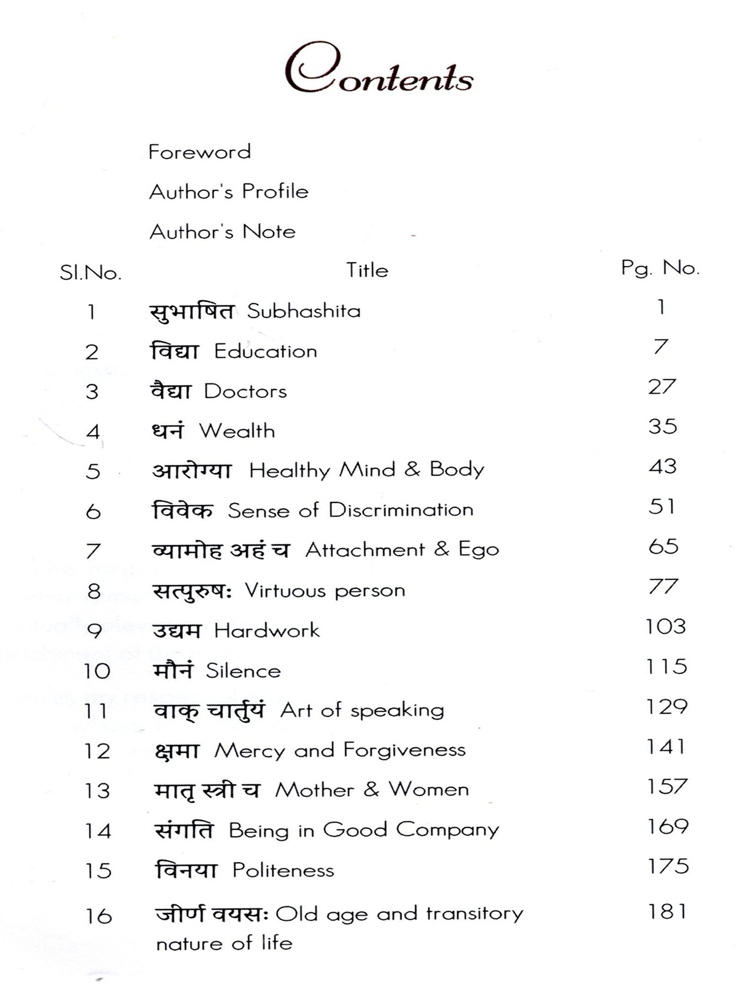 In the Indian tradition Subhashitas are such valuable storehouse of the wisdom of life's experiences. Generations have accepted the wisdom and validity of Subhashitas that reflect the distilled essence of human wisdom and experience.