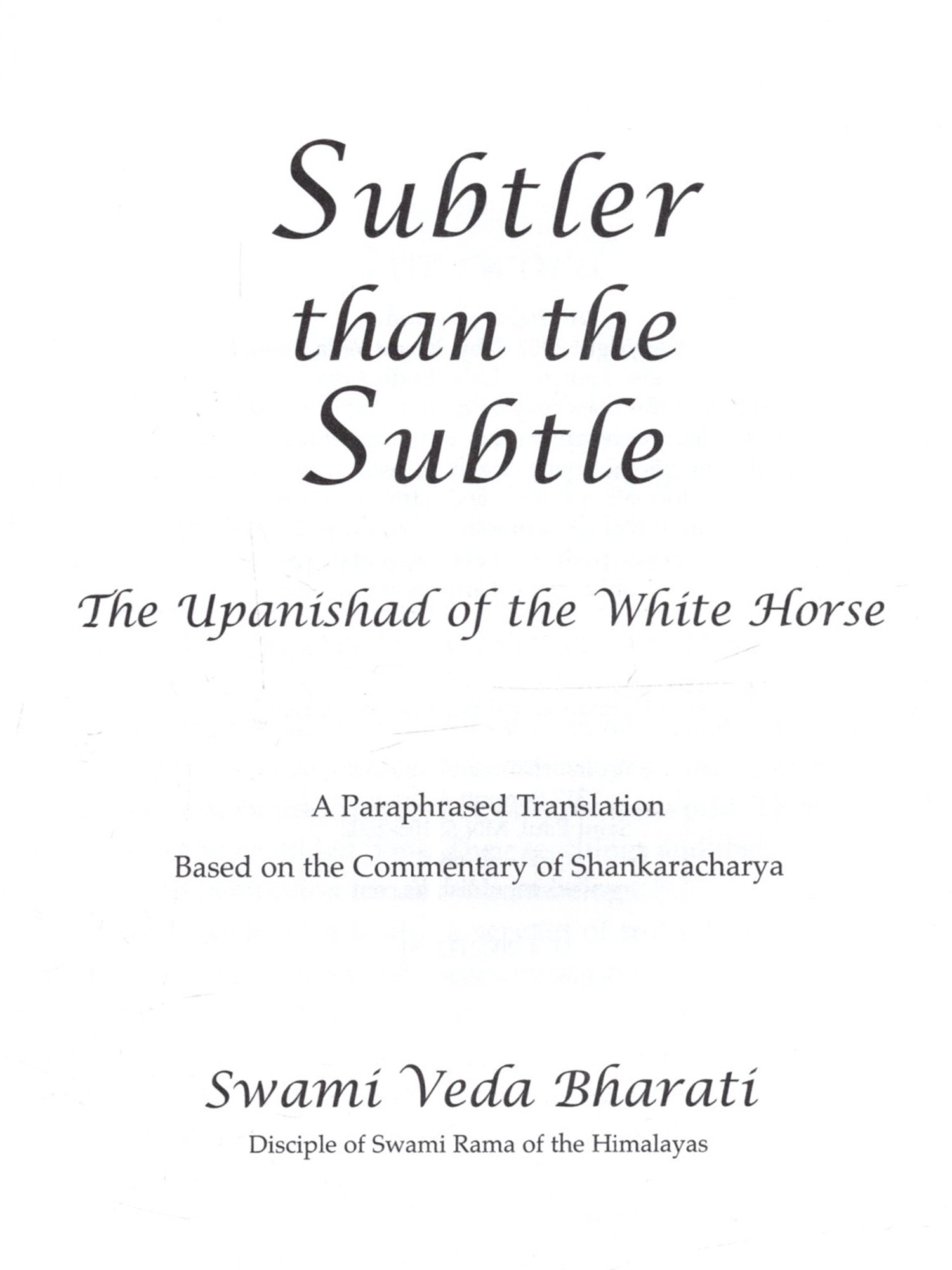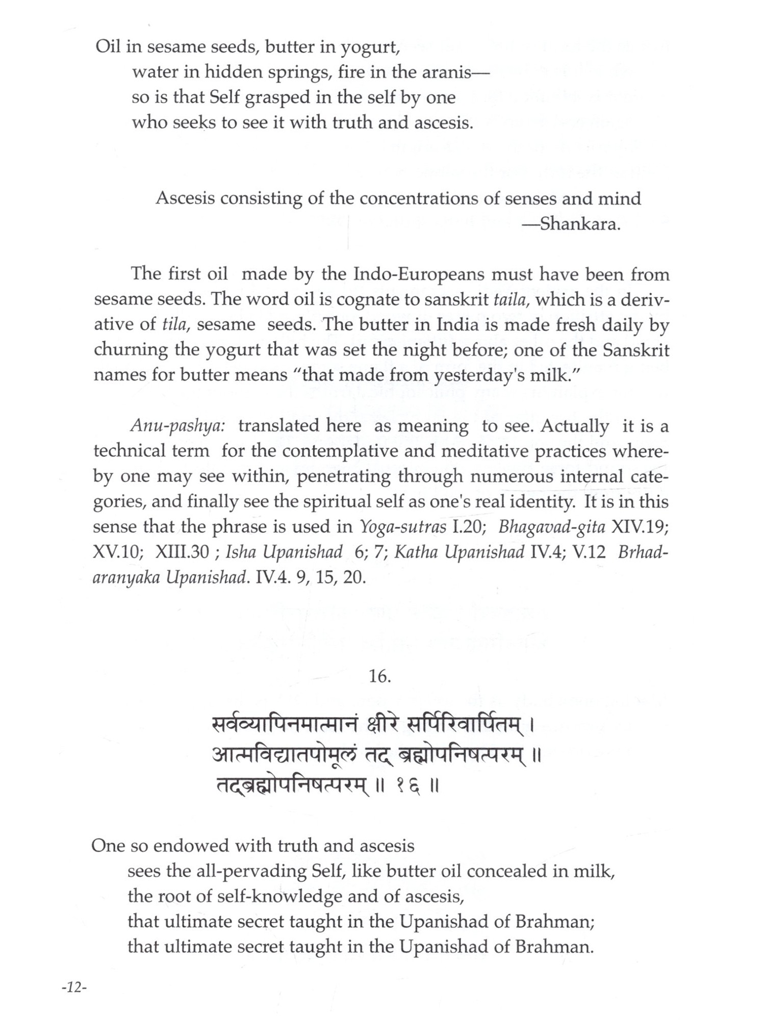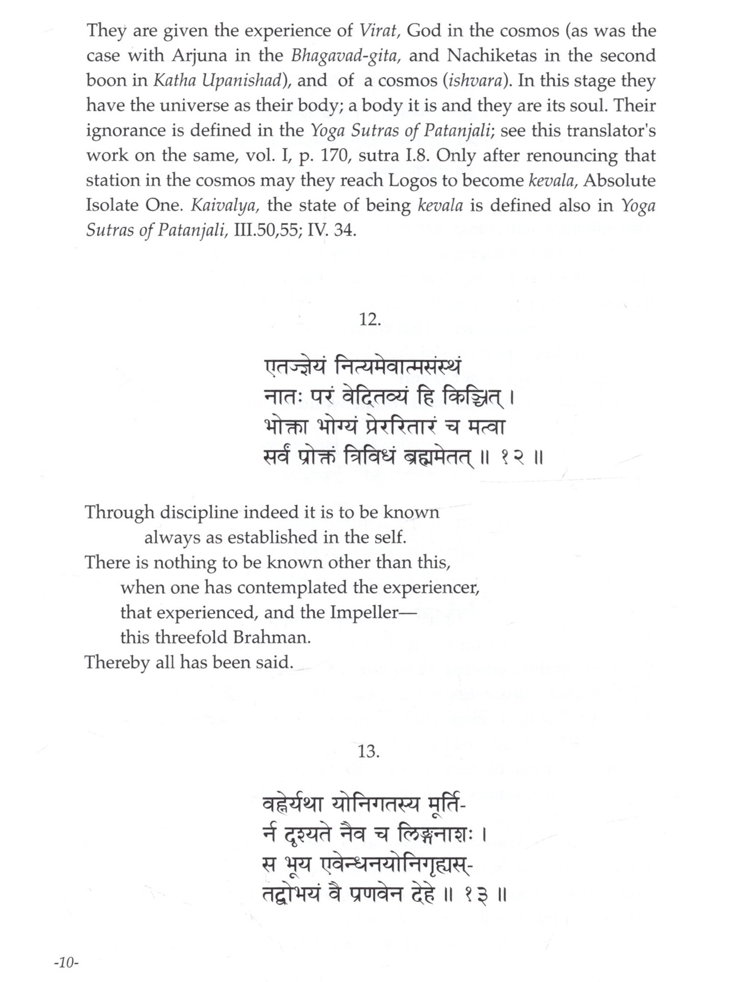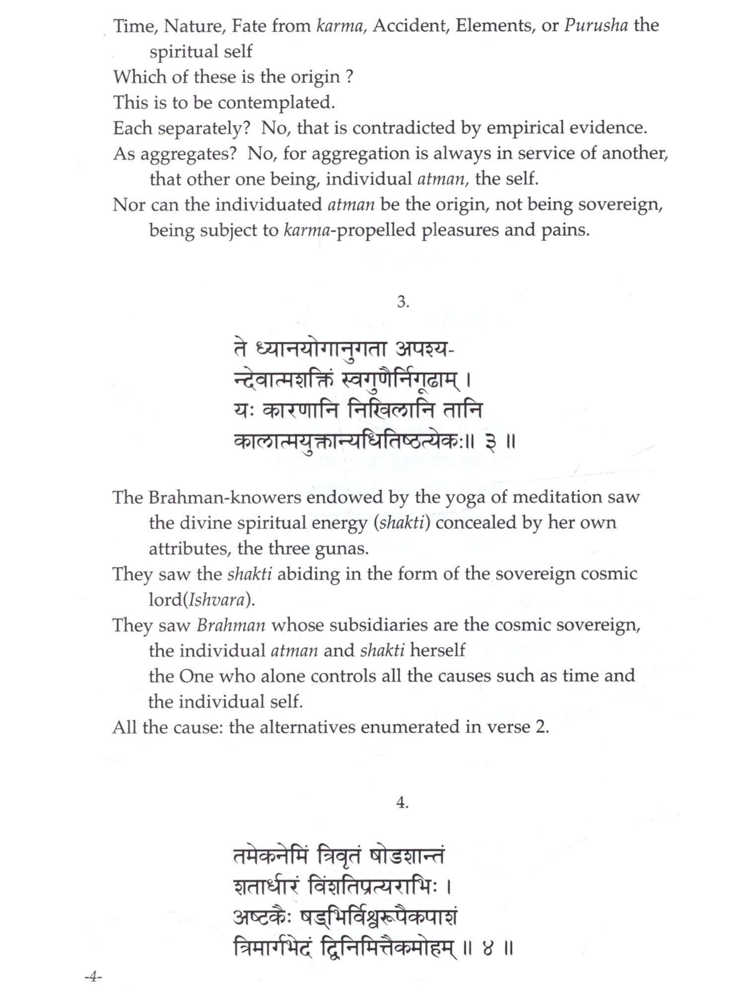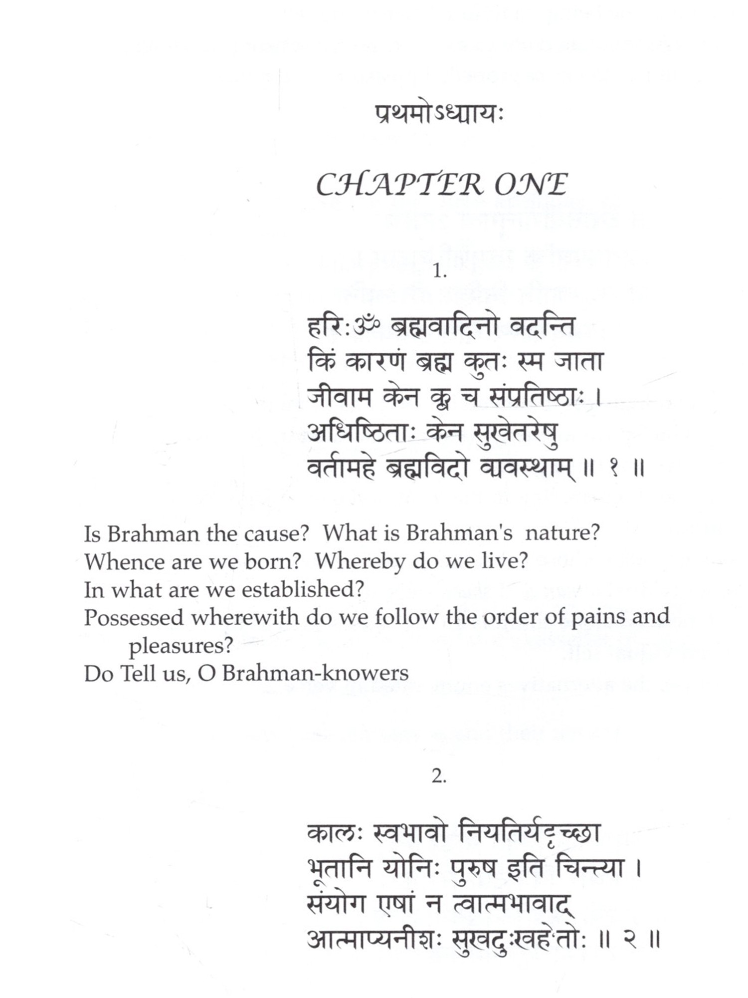 THE UPANISHAD OF A UNITARY REALIZATION The reading of all Upanishads begins with a shanti-patha, recitation of a and in interac tions. The peace is realized not merely through recitation but through the contemplation of the truth expressed in such a composition. However, the traditions have often become somewhat confused over time as various schools of teaching developed. According to Shankaracharya, the shanti-patha for this Upanishad is the Hymn of However, there is an Upanishad that cata-Perfection: purnam adah. logs various facts about the Upanishads. This, Muktika Upanishad, states that the shanti-patha for Shvetashvatara Upanishad is the Hymn of ... As we have based our notes about the Upanishad on the commentary by Shankaracharya, we have chosen the Hymn of Perfection as the shanti-patha. Harmony: saha nav avatu. All traditions agree that Shvetashvatara Upanishad belongs to Krishna Yajur-veda. The published collections include up to 208 Upanishads, and there are more in the form of unpublished manu-scripts; some of these are referred to in the extensive verse catalogs like that of Sadhale. Of these, ten or eleven are said to be the basic, authen-tic, Upanishads. Ten or eleven? That is where Shvetashvatara Upanishad comes in, the eleventh, somewhere in the borderline. Whether the com-mentary attributed to Shankaracharya is by the Adi-Shankaracharya or not is also doubted by the scholars. To us, the style and the philosophy look similar to that of the first Shankaracharya but these scholarly topics are better dealt with in academia rather than among the seekers of eternity The Upanishad consists of six chapters of uneven length totalling 113 verses. The style of the language is that of the late Upanishadic peri od, somewhat similar to that of Katha Upanishad. Some verses are direct quotations from the Vedic samhitas (the recited texts of the Veda); some in classical Sanskrit mixed with the Upanishadic and Vedic phrases; some in purely classical Sanskrit. Our purpose here is not to give lin-guistic analysis or to discuss a historical context but only to study the work as a guide to developing a spiritual life that would lead to the final enlightenment. This is the Upanishad of the Sage Shvetashvatara whose name per-haps means "he who owns a white mule." No historical explanation. can be found for the name as such. However, it does fall within the trend of the time when the sages came from diverse social back-grounds, offsprings of philosophers and kings; those like Satyakama Jabala, born of servant women; some like Mahidasa, the son of Itara, were children of slave women. Some, like Sayugvan Raikva, chose to live under a cart, others, like Yajnavalkya received the reward of a thousand heads of cattle when the king was satisfied with the answer to a philosophical question. Like one of the highly enlightened teachers of the Kashmir Shaiva tradition who plied a horse cart in Delhi in 1950's, one can just imagine the sage of the Upanishad under present study going about riding a white mule. Wisdom in those days dwelt without confinement to social boundaries. Society then was full of philosophical curiosity but not for the sake of simply satisfying an intellectual urge. From the very dawn of the his-tory of India, the seeking for brahma-vidya, the science of Brahman-real-ization, has been the paramount concern of large segments of popula-tions. All kinds of questions are asked and answered in many different ways, finally leading to the rejection of all that falls below Infinity and acceptance of that whereby one "may become immortal." The question may be asked as to which school of philosophy this particular Upanishad belongs. Like Katha and Maitrayani Upanishads and the Bhagavad-gita, Shvetashvatara Upanishad is syncretic.