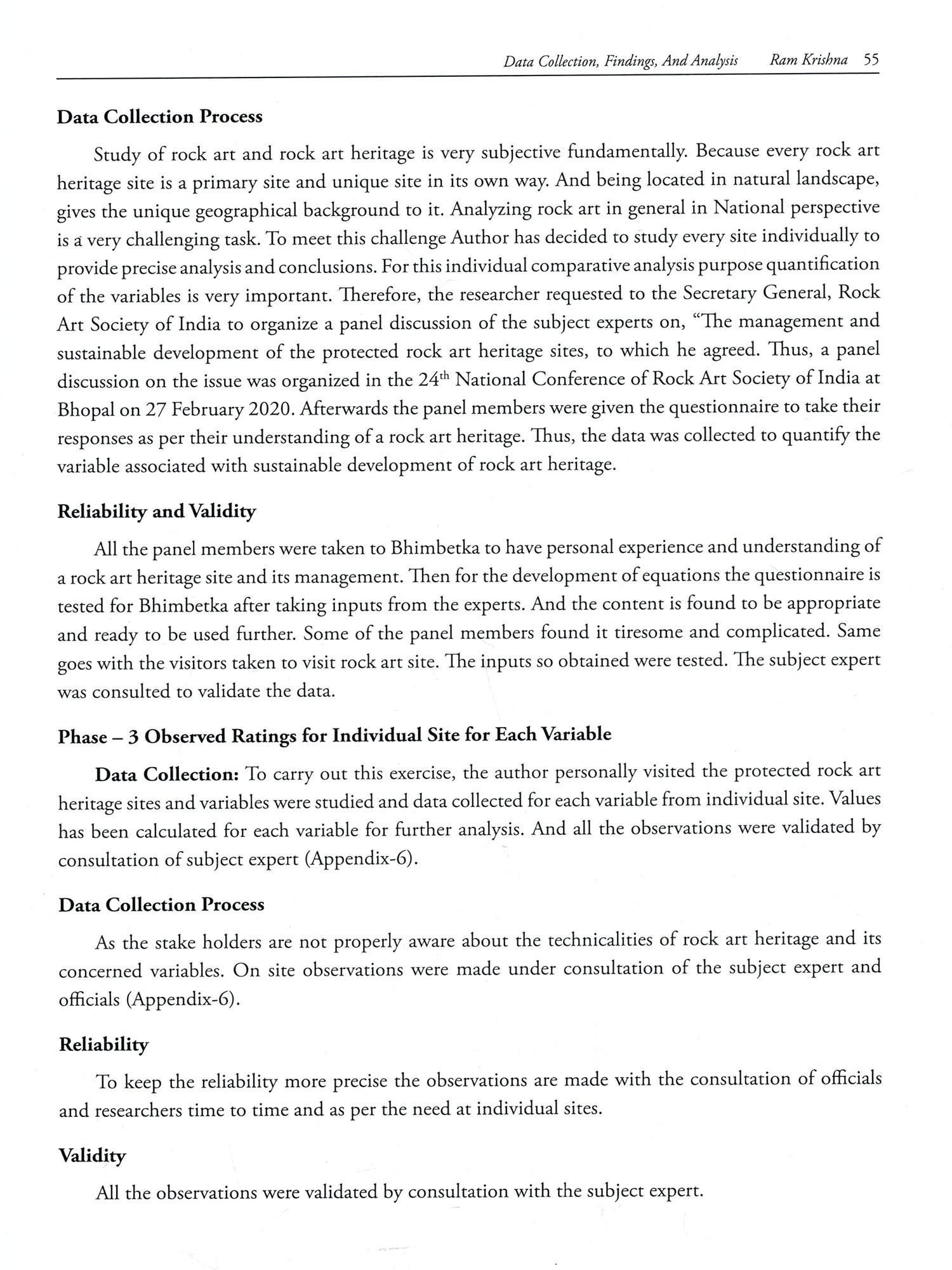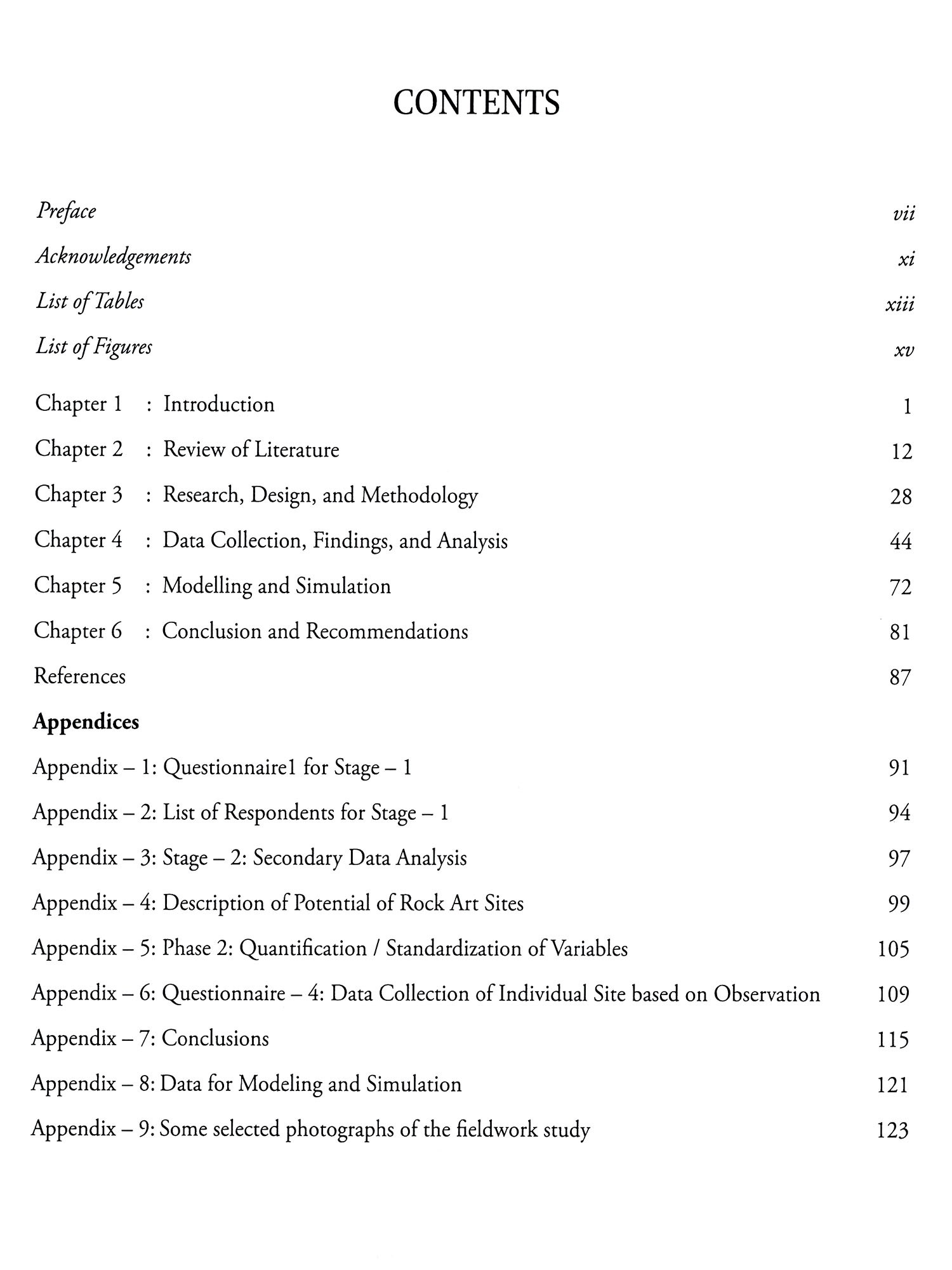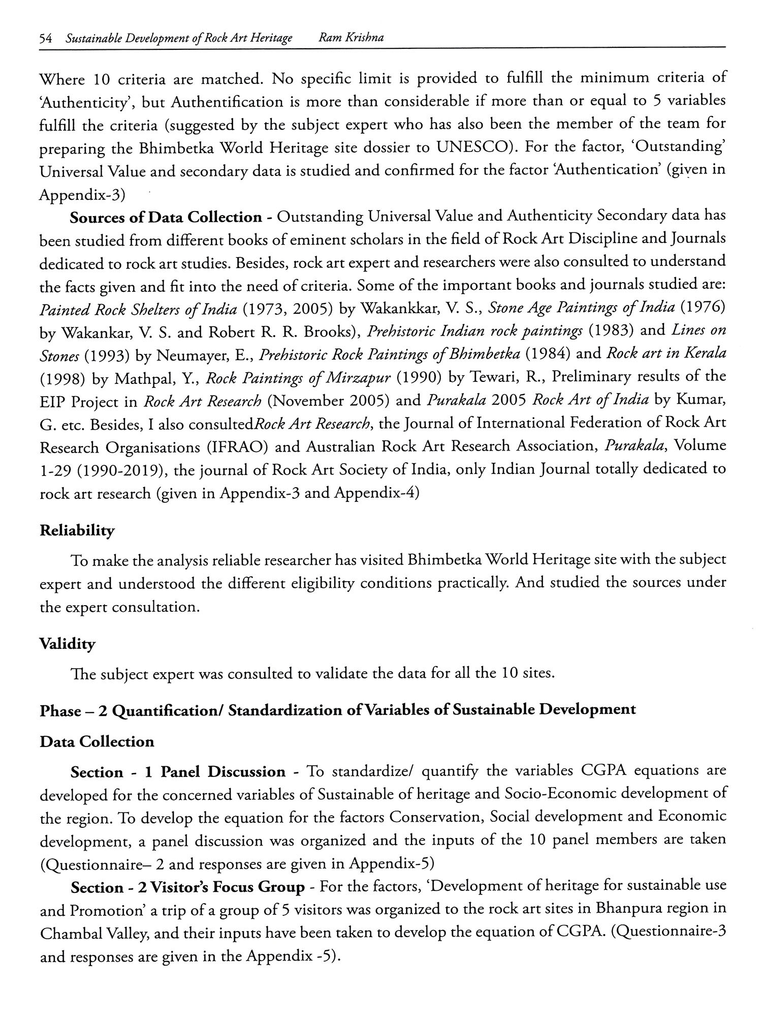 The research on sustainable development and promotion of rock art heritage has been an enriching journey, made possible through the support, encouragement, and invaluable contributions of a number of eminent scholars and organizations I am heartily thankful to all of them. 1 extend my deepest heartfelt gratitude to Prof. Giriraj Kumar, President, Rock Art Society of India (RASI), for granting me access to the library of Rock Art Society of India (RASI) and for facilitating a panel discussion on, "Sustainable Development of Rock Art Heritage Sites Challenges, Plans, and Strategies" in the 24 National Conference of RASI at Bhopal in February 2020. His consultation and guidance were indispensable during my fieldwork and research journey, allowing me to connect deeply with the subject matter. I would also like to express my profound appreciation to Prof. Sanjay Bhushan for his unwavering guidance, patience, and insightful teachings throughout this research. I am equally grateful to Prof. Sanjeev Swami, Head of the Department of Management, Faculty of Social Sciences, Dayalbagh Educational Institute. Agra, U.P. for his mentorship and support at every stage of my research, particularly during the challenging moments.