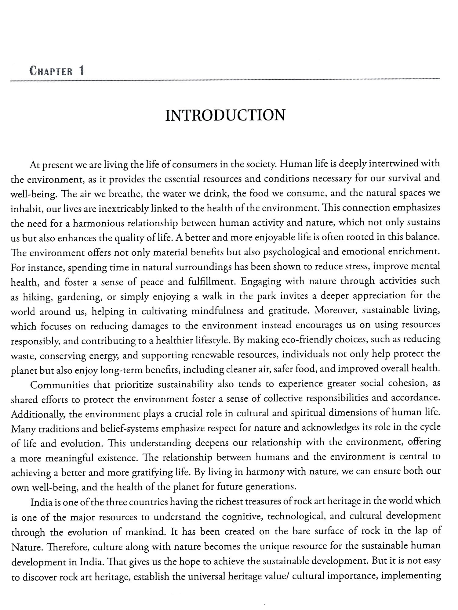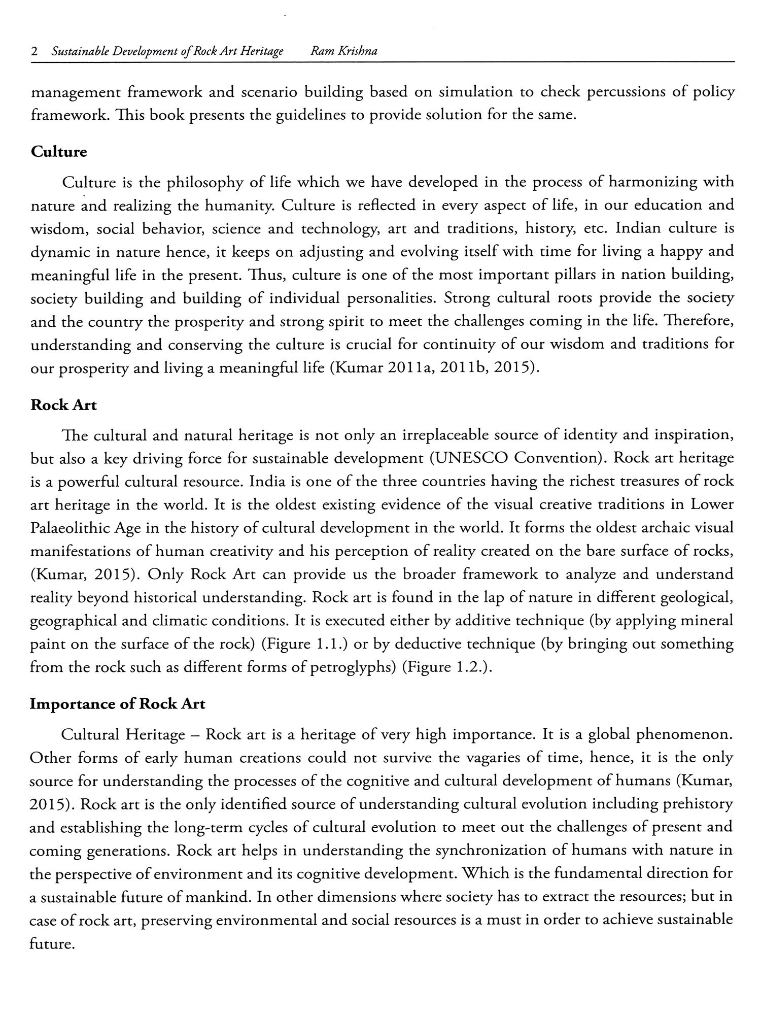 lndia is one of the three countries having the richest treasures of rock art heritage in the world. Rock art, created on the bare surface of the rock, is the only source for understanding the technological cognitive, intellectual, and cultural development of early men. The present bonk entitled as, Sub development of rock art heritage: An applied systems approach, provides a practical approach to achieve sustainable development of the rock art heritage sites, moving beyond theoretical concepts. It presents a framework for identifying the universal value of rock art heritage sites, addressing socio-economic challenges, standardizing site management practices, and simulating real-life scenarios for successful outcomes. With over three decades of experience in rock art, both directly and indirectly. I have come to realize that rock art offers the simplest codes for living in harmony with nature, a lesson that is not only timeless but also extraordinary.