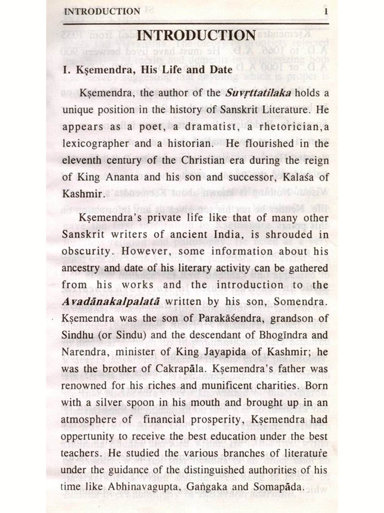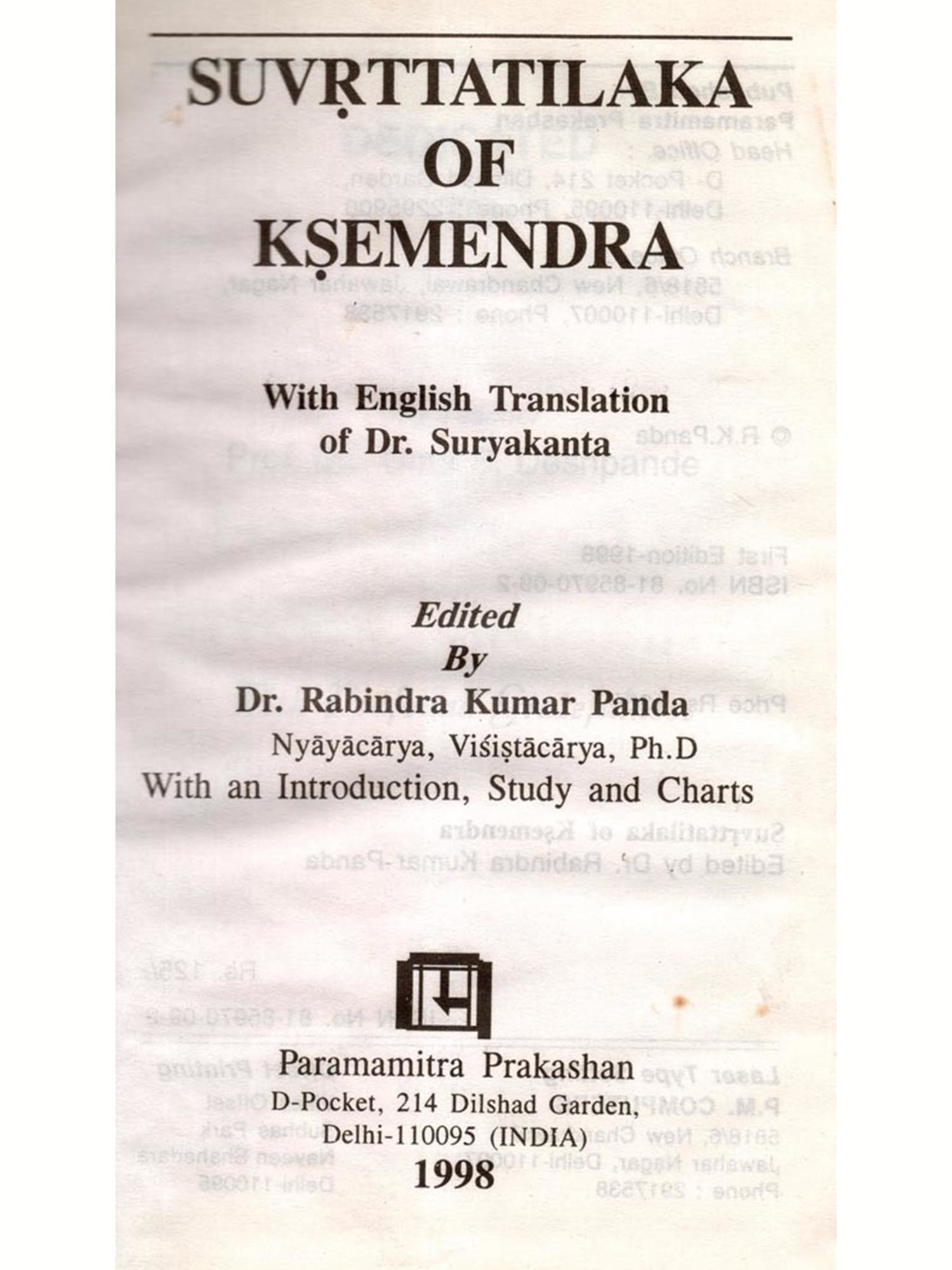 The English translation of Suvṛttatilaka by Dr. Suryakanta published under the title Kşemendra Studies, as volume 91 of the Poona Oriental Series by Oriental Book Agency in 1954 has been directly reproduced. Dr. Suryakanta's work is very important in the sense that it provides a detailed study of the Suvṛttatilaka with its English translation for the first time in the English language. With regard to the translation of the Suvṛttatilaka Dr. Suryakanta says: "I may add that to render them into English has been by no means an easy task. Every translator has his limitations depending on the nature of the work he translates. As a matter of fact no translation can adequately reflect the original author's mind. Translation is at best a 'shadow', Rhythm, word order.