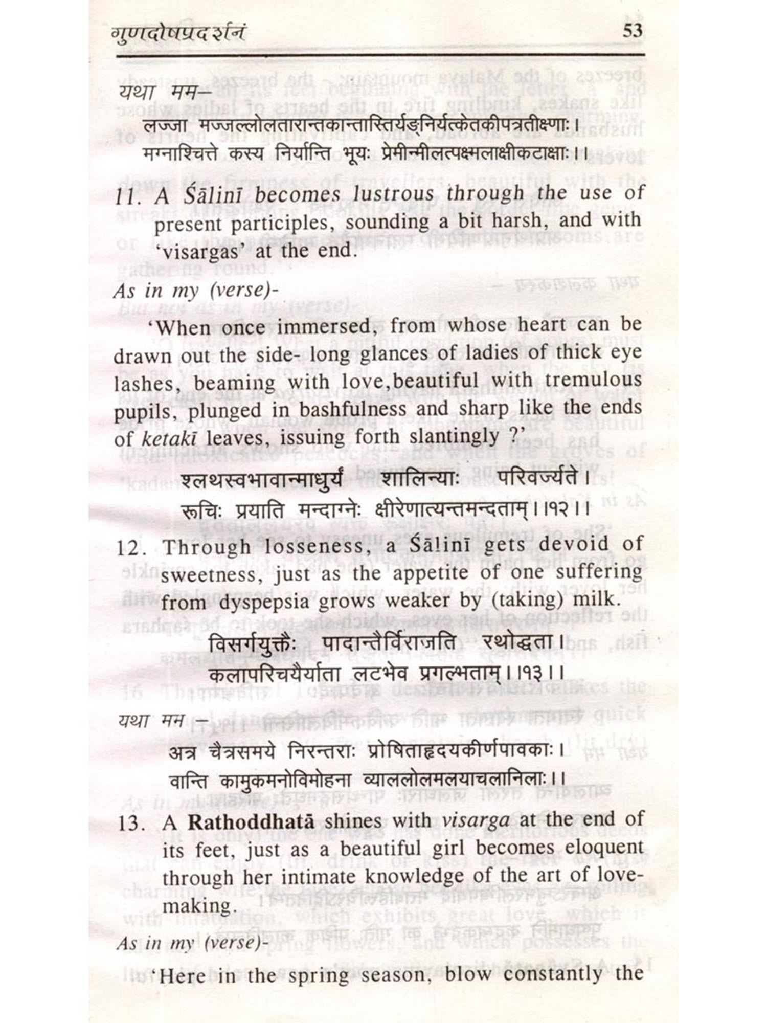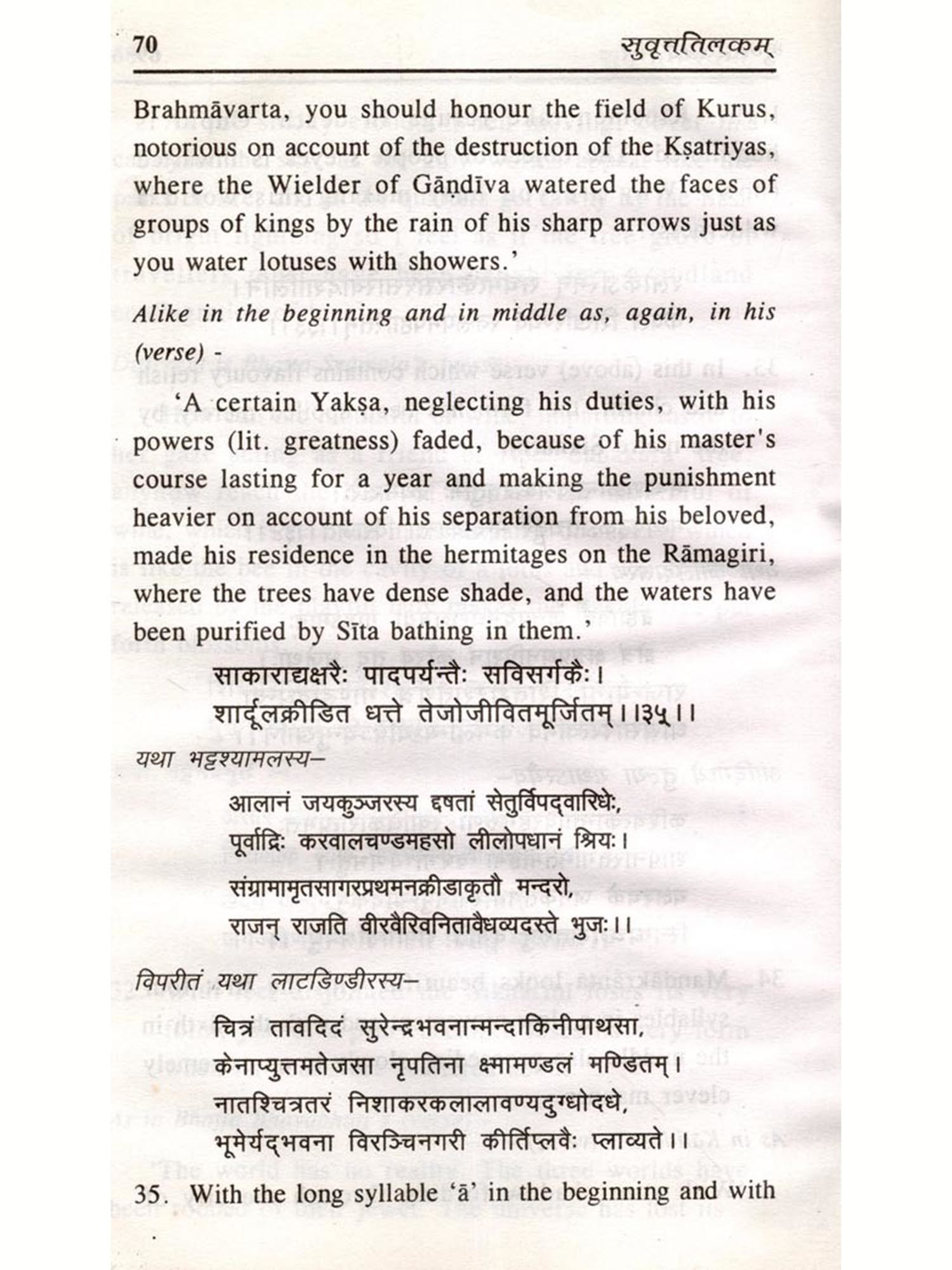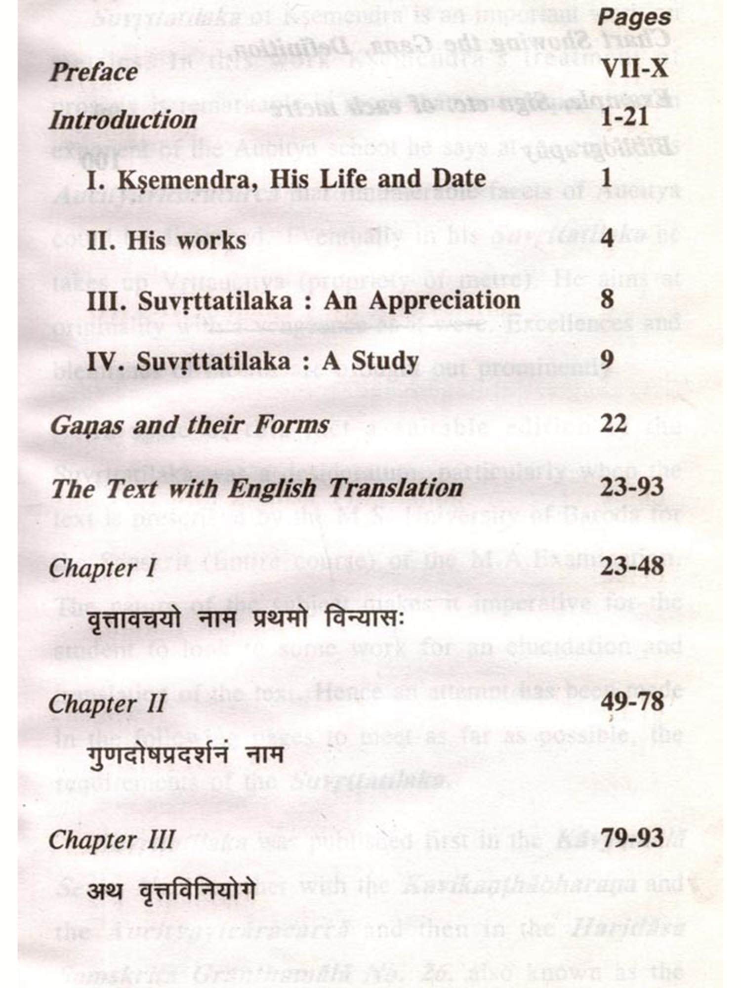 In spite of this fact a suitable edition of the Suvrttatilaka was a desideratum, particularly when the text is prescribed by the M.S. University of Baroda for the Sanskrit (Entire course) of the M.A.Examination. The nature of the subject makes it imperative for the student to look to some work for an elucidation and translation of the text. Hence an attempt has been made in the following pages to meet as far as possible, the requirements of the Suvṛttatilaka.