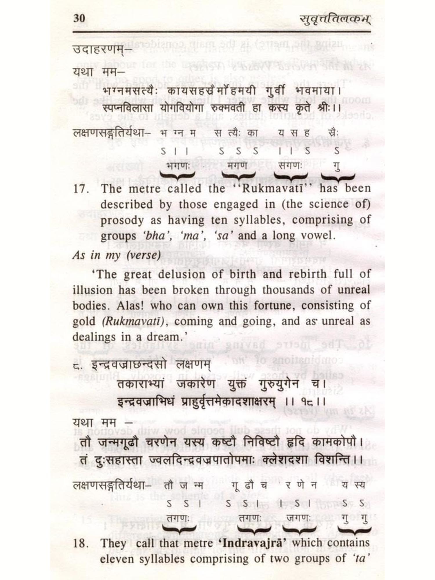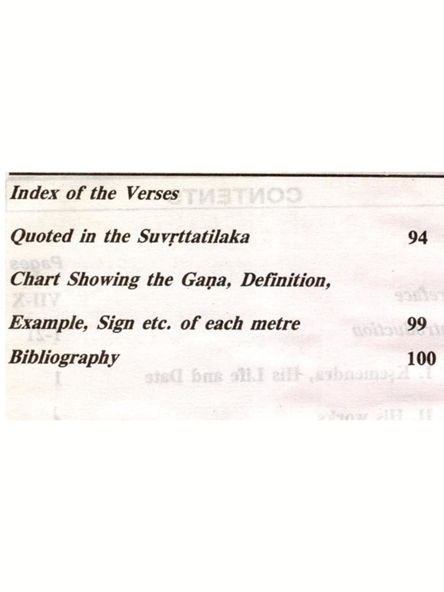 Suvṛttatilaka was published first in the Kavyamala Series No.2 together with the Kavikanthabharaņa and the Aucityavicaracarca and then in the Haridasa Samskrita Granthamala No. 26, also known as the Chowkhamba Sanskrit Series in 1933. The latter edition is unfortunately defective. Another edition with the Sanskrit commentary Prabha and a Hindi commentary Vibha edited by Pt. Vraja Mohana Jha was published by the Chowkhamba Sanskrit Series Office as Haridas Sanskrit Series No. 276 in 1968. The Text of the present edition is based on the above work. However, the editor has tried to make necessary corrections and to bring a text as authentic as possible.