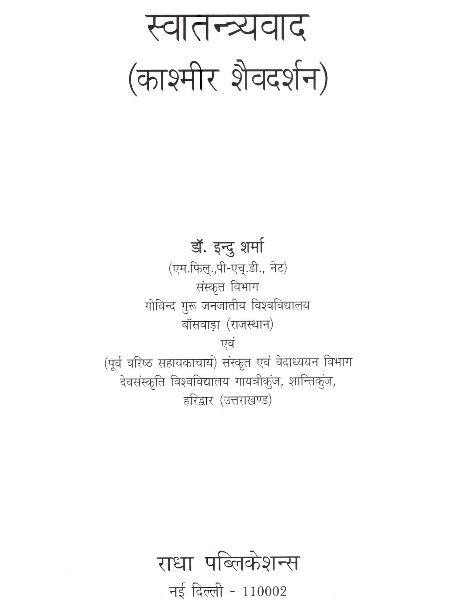 डॉ. इन्दु शर्मा जन्म तिथि 19 जनवरी 1986 शैक्षिक योग्यता एम फिल्, पी-एच.डी. नेट (यू.जी.सी.) संस्कृत प्रभाकर (संगीत गायन)। शिक्षण अनुभव वरिष्ठ सहायक आचार्या के पद पर, संस्कृत एवं वेदाध्ययन विभाग, देव संस्कृति विश्वविद्यालय, गायत्रीकुंज, शांतिकुंज, हरिद्वार (उत्तराखंड)। सम्प्रति- संस्कृत विभाग, गोविन्द गुरु जनजातीय वि. वि. बाँसवाड़ा, (राजस्थान)। सम्प्रति-विजिटिंग फैकल्टी संस्कृत एवं वेदाध्ययन विभाग, देव संस्कृति विश्वविद्यालय, गायत्रीकुंज, शांतिकुंज, हरिद्वार (उत्तराखंड)। आपने अपनी सारस्वत यात्रा में काश्मीर शैवदर्शन को अपनी साधना का केन्द्र बनाते हुए अनवरत अपनी लेखनी को गति प्रदान की है। तथा प्रत्यभिज्ञाविमर्श एवं स्वातन्त्र्यवाद नामक दो पुस्तके इस विशेष विषय क्षेत्र को समर्पित की। काश्मीर शैवदर्शन को विद्वानों के मध्यम प्रचलित एवं प्रसारित करने में प्रयासरत आप अनेक शोध-पत्रों का भी वाचन एवं प्रकाशन राष्ट्रीय एवं अन्तर्राष्ट्रीय स्तर पर कर रही है। आपके आगम, निगम 'दर्शन', साहित्य, नाट्य, कला, वेंद, उपनिषद् आदि विषयों पर आदघृत चौवीस शोधपत्र राष्ट्रीय एवं अन्तर्राष्ट्रीय शोध-पत्रिकाओं में प्रकाशित हो चुके है। इसी के साथ आपने कार्यशालाओं एवं परिसंवादों में भी अपनी प्रतिभागिता अंकित की है। आप MHRD के NME-ICT प्रोजक्ट (द्वारा CEC नई दिल्ली) के UGC मॉडल पाठ्यक्रम के आधार पर विषय विशेषज्ञ के रूप मे सात व्याख्यान "Video Programme के माध्यम से भी दे चुकी है। आपके निर्देशन में विविध शोध-विषयों पर शोध कार्य भी हो चुके हैं। परमशिव की कृपा से आपकी लेखनी सम्प्रति एक और "काश्मीर शैवदर्शन" पर आधारित पुस्तक पर कार्य कर रही है।
