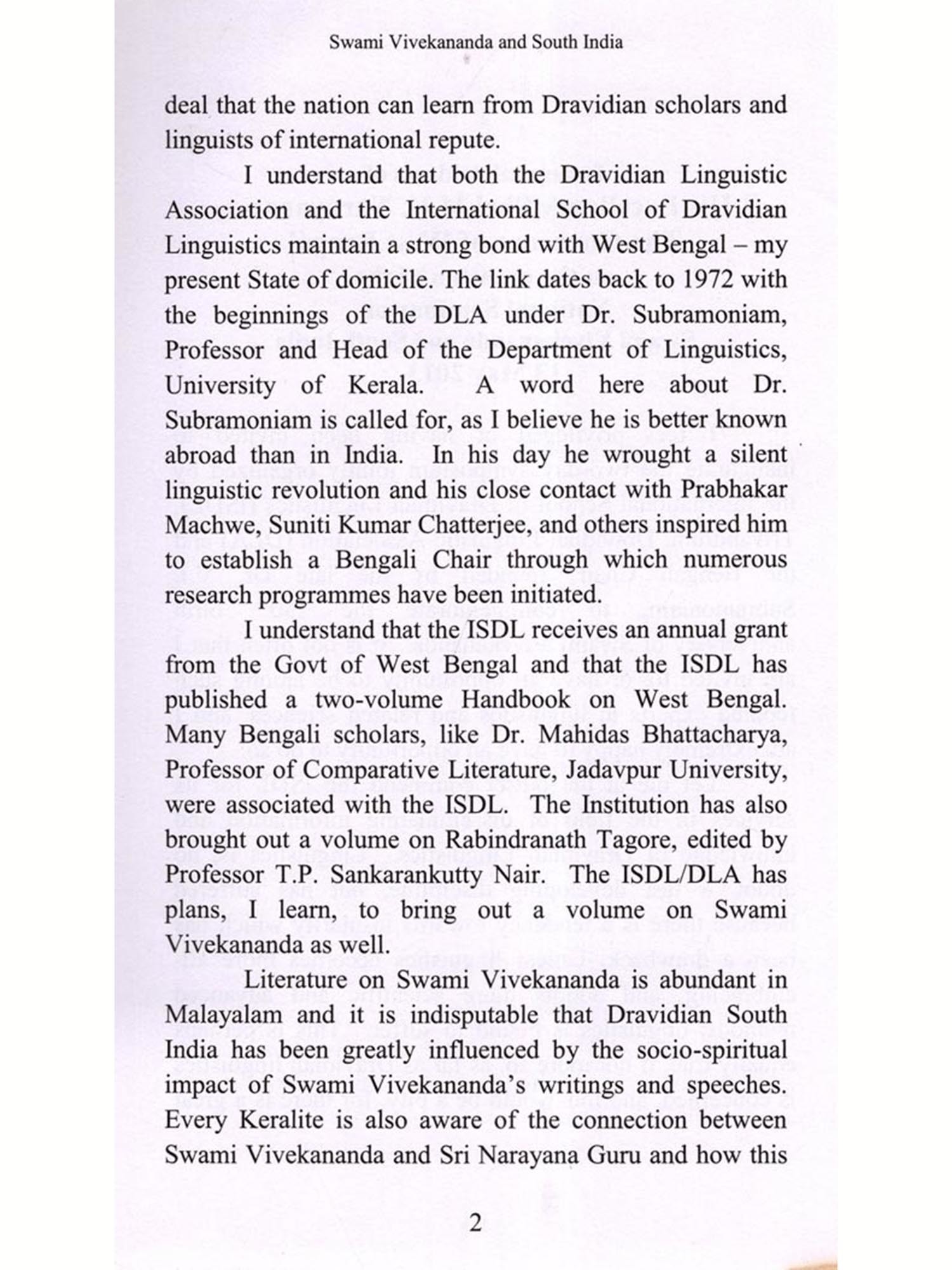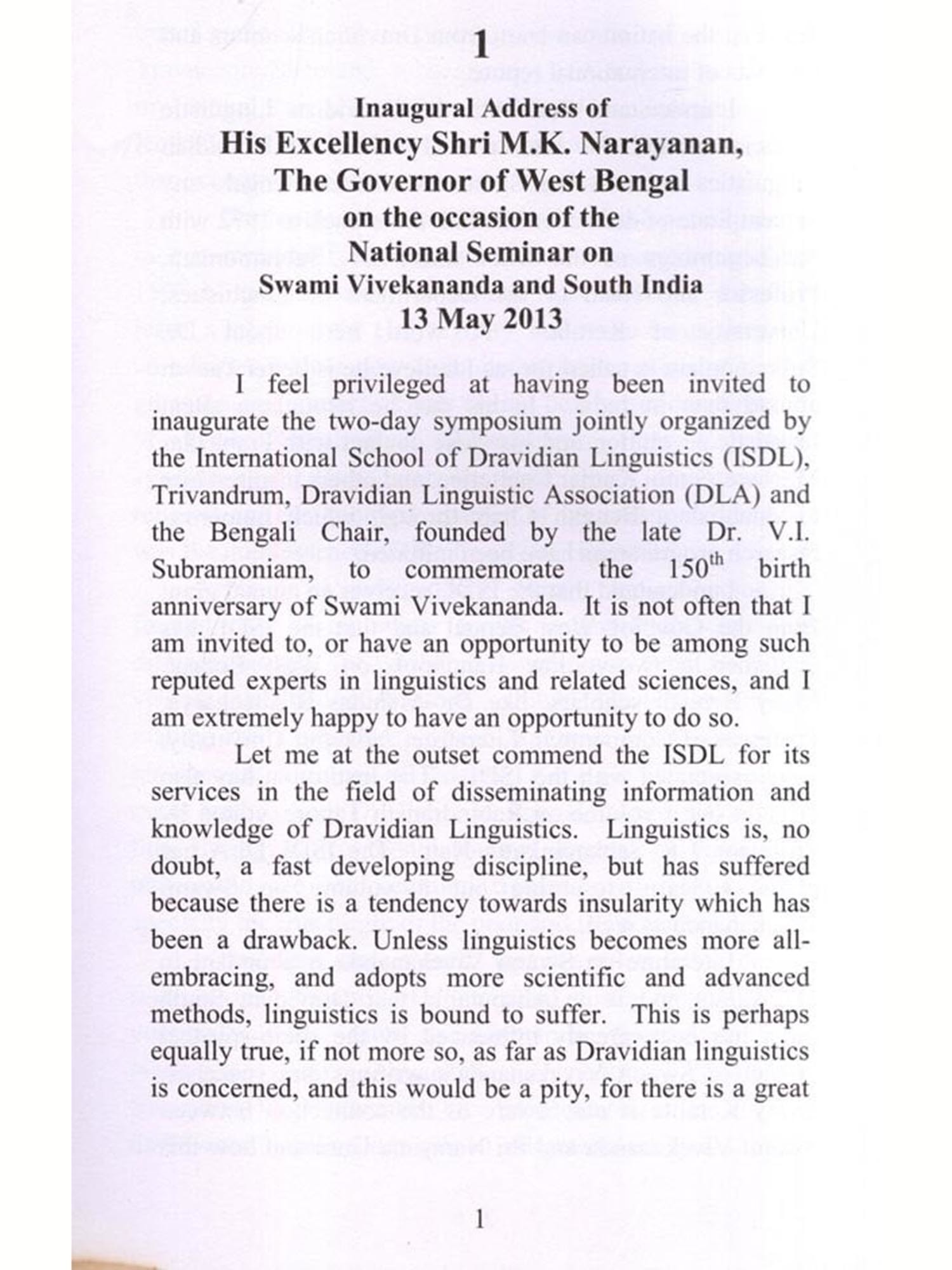 Swami Vivekananda is the patriot saint of Modern India, whose 150th Birth Day is being celebrated throughout the year all over the world. The great Swamiji was no narrow sectarian and his teachings will appeal equally to all persons who value truth for its own sake irrespective of their religious denomination. Swami Vivekananda belongs to West Bengal especially to Kolkata, but he does not belong to West Bengal alone, he belongs to the world. It is considered that Swamiji is the country's spiritual Ambassador. So there is no wonder that such a great person's 150th birth day is celebrated throughout the year and throughout the world. International School of Dravidian Linguistics has decided to celebrate Swamiji's 150th birth day. By collaborating ISDL's Bengali Unit, ISDL conducted two days' Seminar. This seminar was inaugurated by Sri. M.K. Narayanan, Swami Hon'ble Governor of West Bengal. Tattwarupananda, Adhyaksha, Sri Ramakrishna Asramam, Thiruvananthapuram participated in the valedictory function by delivering his blessings speech.