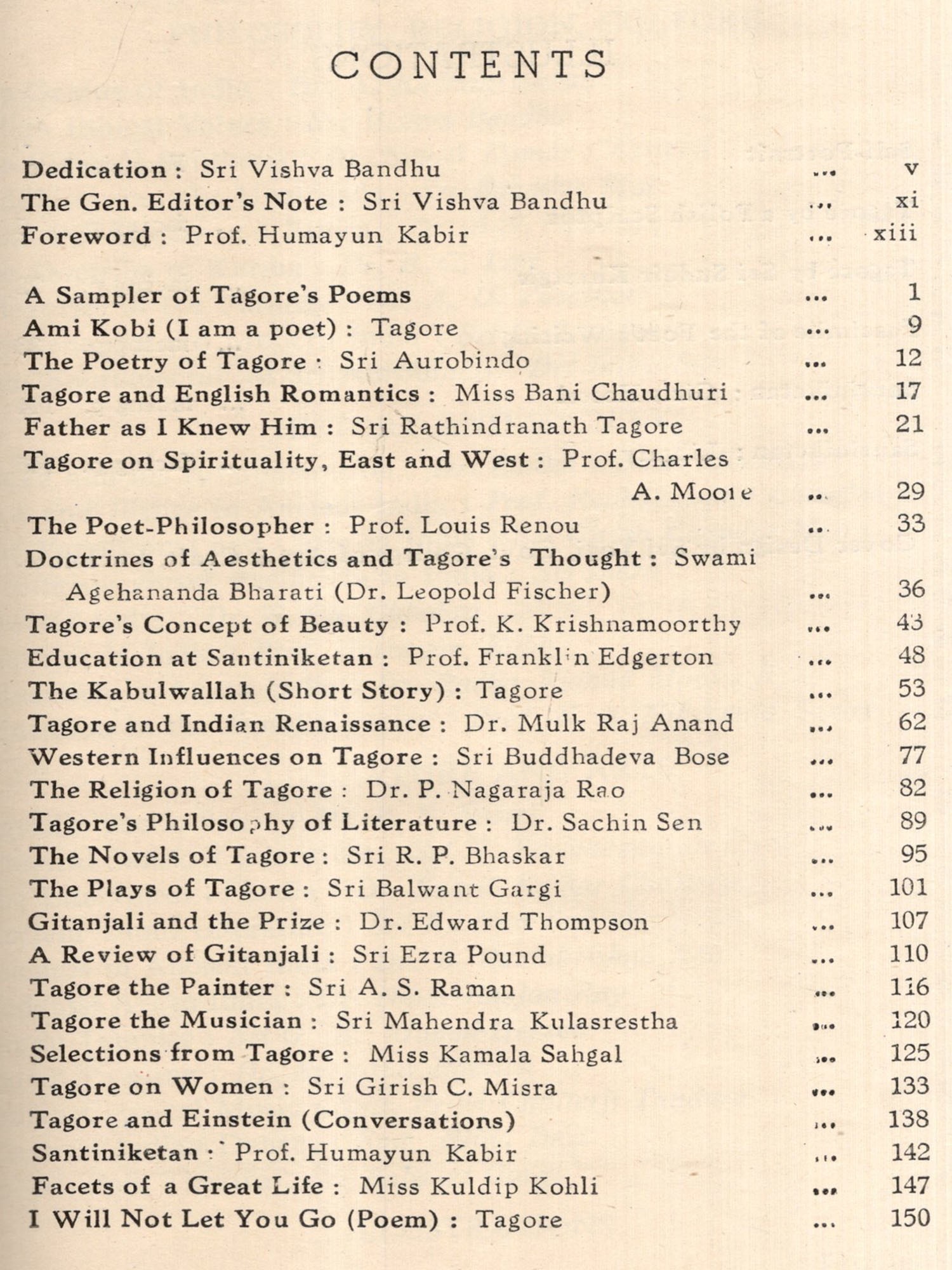 I CONGRATULATE the Vishveshvaranand Vedic Research Institute for bringing out a TAGORE CENTENARY VOLUME in honour of one of the greatest sons of India. The volume is divided into two sections, of which the first deals with the many aspects of Tagore's manifold genius and includes some selections from his writings. The second section appropriately enough deals with aspects of Indian culture, for perhaps no one else has so fully represented Indian culture in all its richness and diversity and few have worked so devotedly for integrating its values with the demands of the modern world of science and technology.
