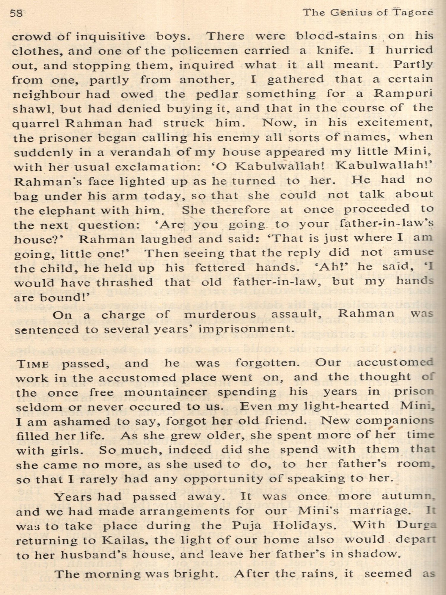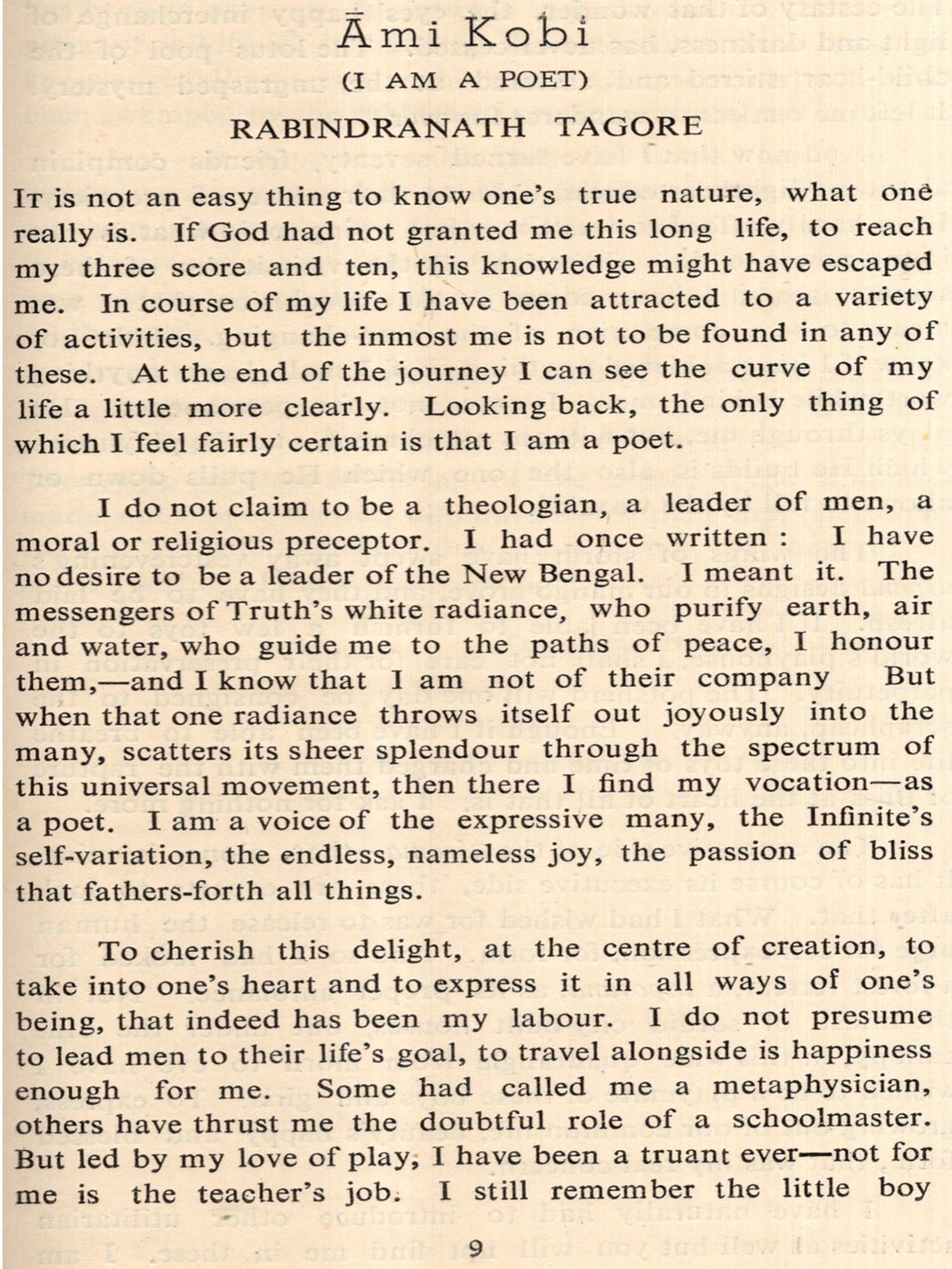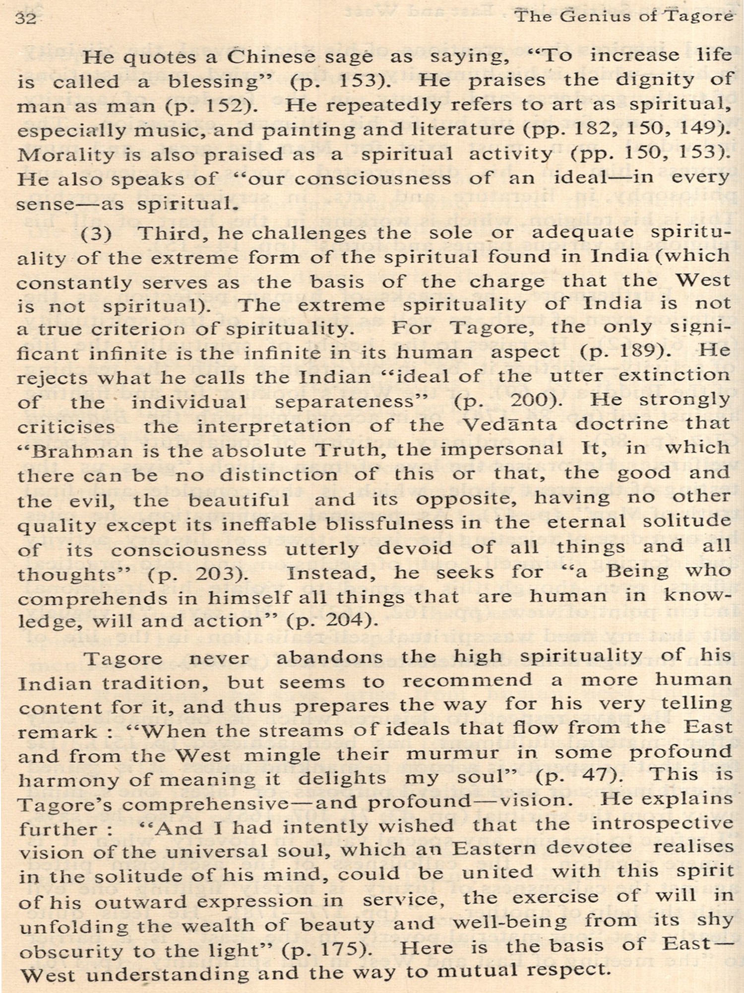 TAGORE was fortunate in both the time and the place of his birth. The advent of the West had disturbed the placid waters of Indian life and a new awakening was seeping throughout the land. Its initial impact had dazzled the Indian mind and so impressed some of the early reformers that they at times seemed to be blind imitators of the West. By the time Tagore was born, the first uncritical admiration for the West had worn off and there was a more balanced appraisal of the values of the West. Simultaneously, there was increased knowledge of and regard for the values of the East. The place of his birth was equally opportune. Bengal had felt the impact of the West earlier and more vividly than perhaps any other part of India, and in Bengal the stirrings of new life were most marked in Calcutta. The meeting of East and West on India's shores was thus for Tagore both a fact and an ideal.