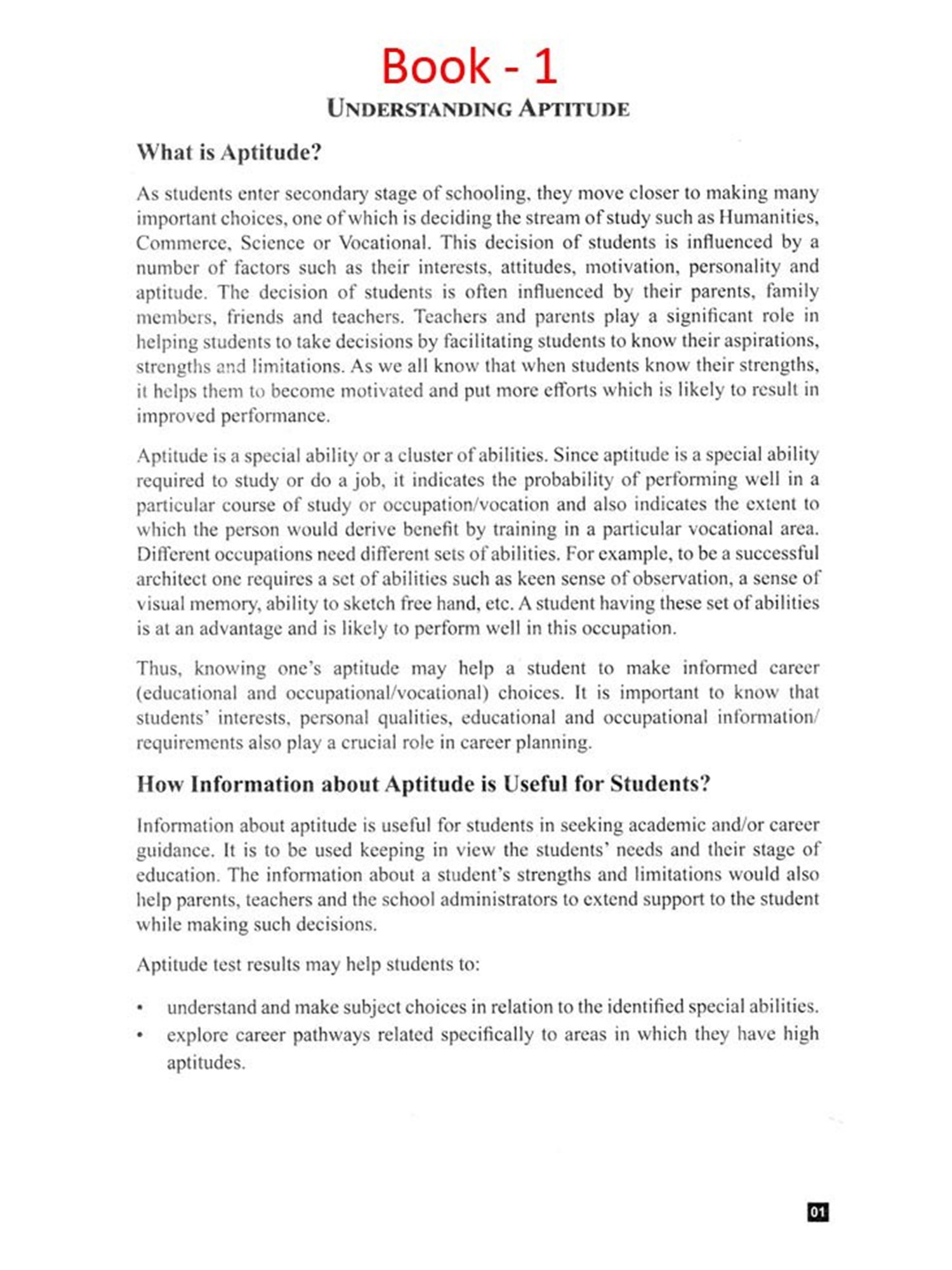 Individuals differ from each other in terms of their physical characteristics, wach as, height, weight and so on, as well as, in their psychological dimensions, such as ability, interest, aptitude, personality, motivation and emotions. Aptitude is one such peychological dimension which refers to the ability to acquire skill or knowledge in a particular area. The information related to aptitude at secondary stage can guide the student, parents and the school to take decisions regarding a student's educational and career-related choices. It may also motivate students to broaden their horizon about the world of work.