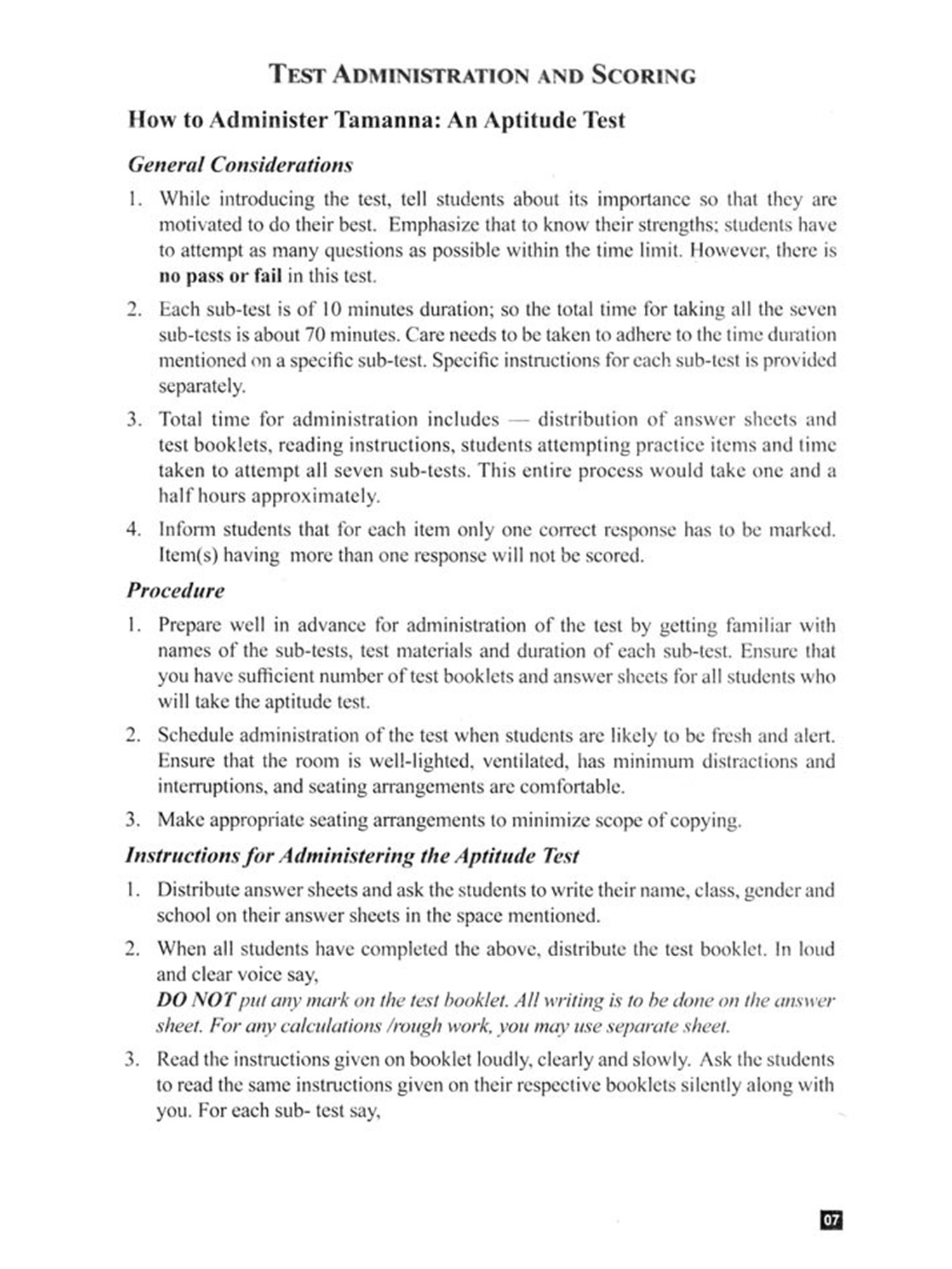 To facilitate schools in helping students make informed career choices NCERT has developed Tamanna: An Aptitude Test for Senior School Students (Classes IX and X). The test comprises a Technical Manual which gives details of construction and standardisation of the test, technical information on the aptitude test, scoring and norms, and interpretation of scores. The Test Booklet contains items on the seven dimensions measured in the aptitude test, ie. Language Aptitude (LA), Abstract Reasoning (AR), Verbal Reasoning (VR), Mechanical Reasoning (MR), Numerical Aptitude (NA), Spatial Aptitude (SA), and Perceptual Aptitude (PA). The Guide for Teachers and Parents consists of the features of the aptitude test, test administration and scoring, and understanding the meaning of test scores.