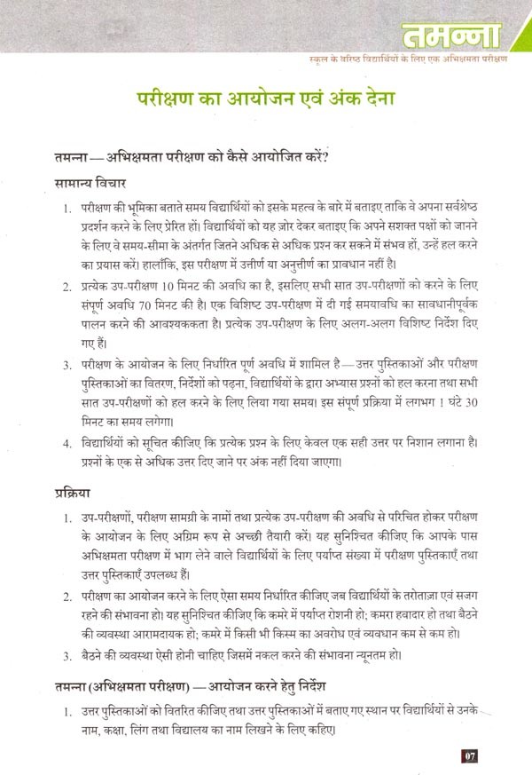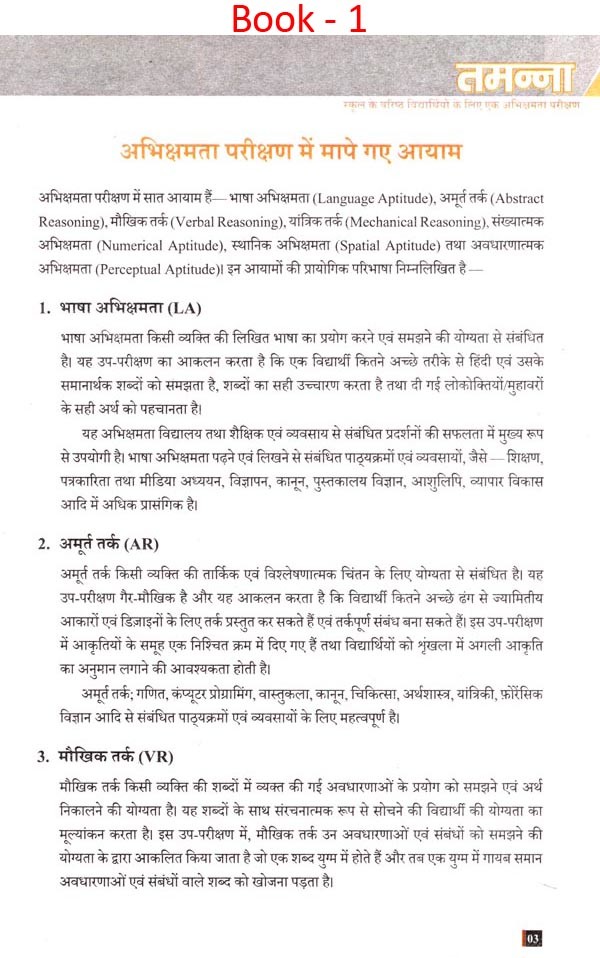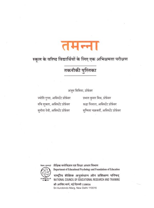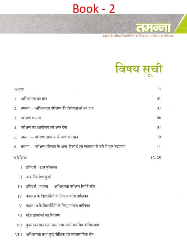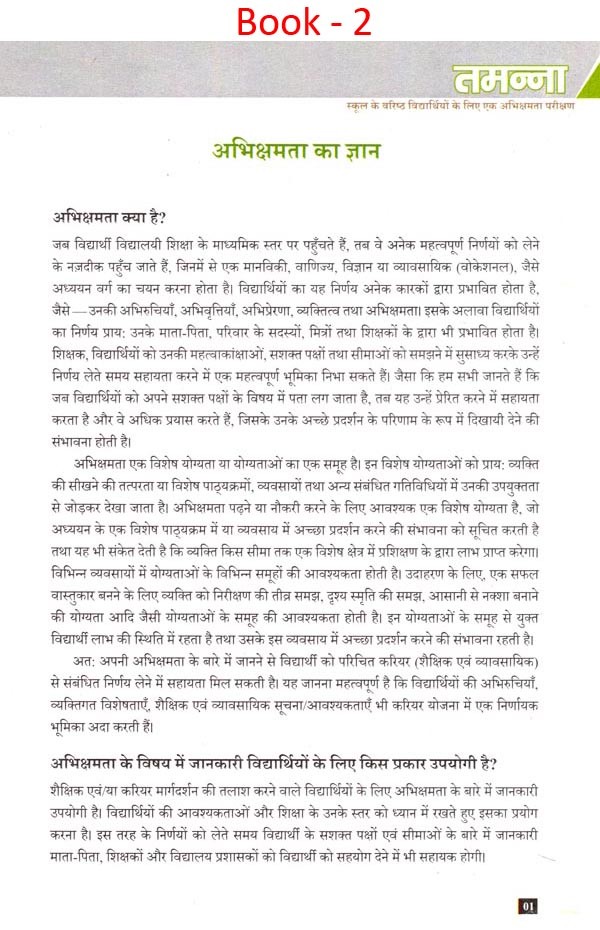 विद्यार्थियों को सुपरिचित करियर निर्णयों में सहायता देने हेतु विद्यालयों को सुसाध्य बनाने के लिए राष्ट्रीय शैक्षिक अनुसंधान एवं प्रशिक्षण परिषद् ने 'तमन्ना स्कूल के वरिष्ठ विद्यार्थियों हेतु एक अभिक्षमता परीक्षण (कक्षा 9 एवं 10 के लिए) विकसित किया है। इस परीक्षण में एक तकनीकी पुस्तिका, एक परीक्षण पुस्तिका और शिक्षकों एवं अभिभावकों के लिए दिशानिर्देश शामिल है। तकनीकी पुस्तिका परीक्षण की संरचना एवं मानकीकरण, अभिक्षमता परीक्षण के बारे में तकनीकी जानकारी, अंक निर्धारण एवं मानदंड तथा अंकों की उचित व्याख्या के बारे में विस्तृत विवरण प्रदान करती है। परीक्षण पुस्तिका में अभिक्षमता परीक्षण में मापे गए सात आयामों भाषा अभिक्षमता (LA), अमूर्त तर्क (AR), मौखिक तर्क (VR), यांत्रिक तर्क (MR), संख्यात्मक अभिक्षमता (NA), स्थानिक अभिक्षमता (SA), तथा अवधारणात्मक अभिक्षमता (PA) से संबंधित विषय समाहित हैं। शिक्षकों एवं अभिभावकों के लिए दिशानिर्देश में अभिक्षमता परीक्षण की विशेषताएँ, परीक्षण का आयोजन एवं अंक निर्धारण तथा परीक्षण प्राप्तांकों के अर्थ को समझना शामिल है।