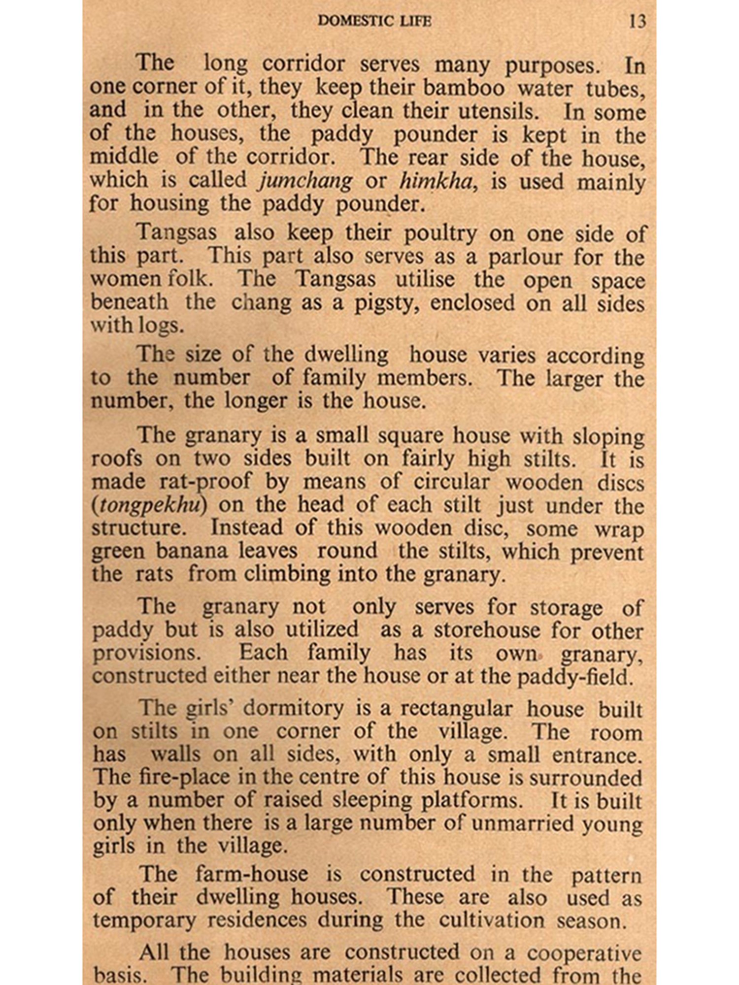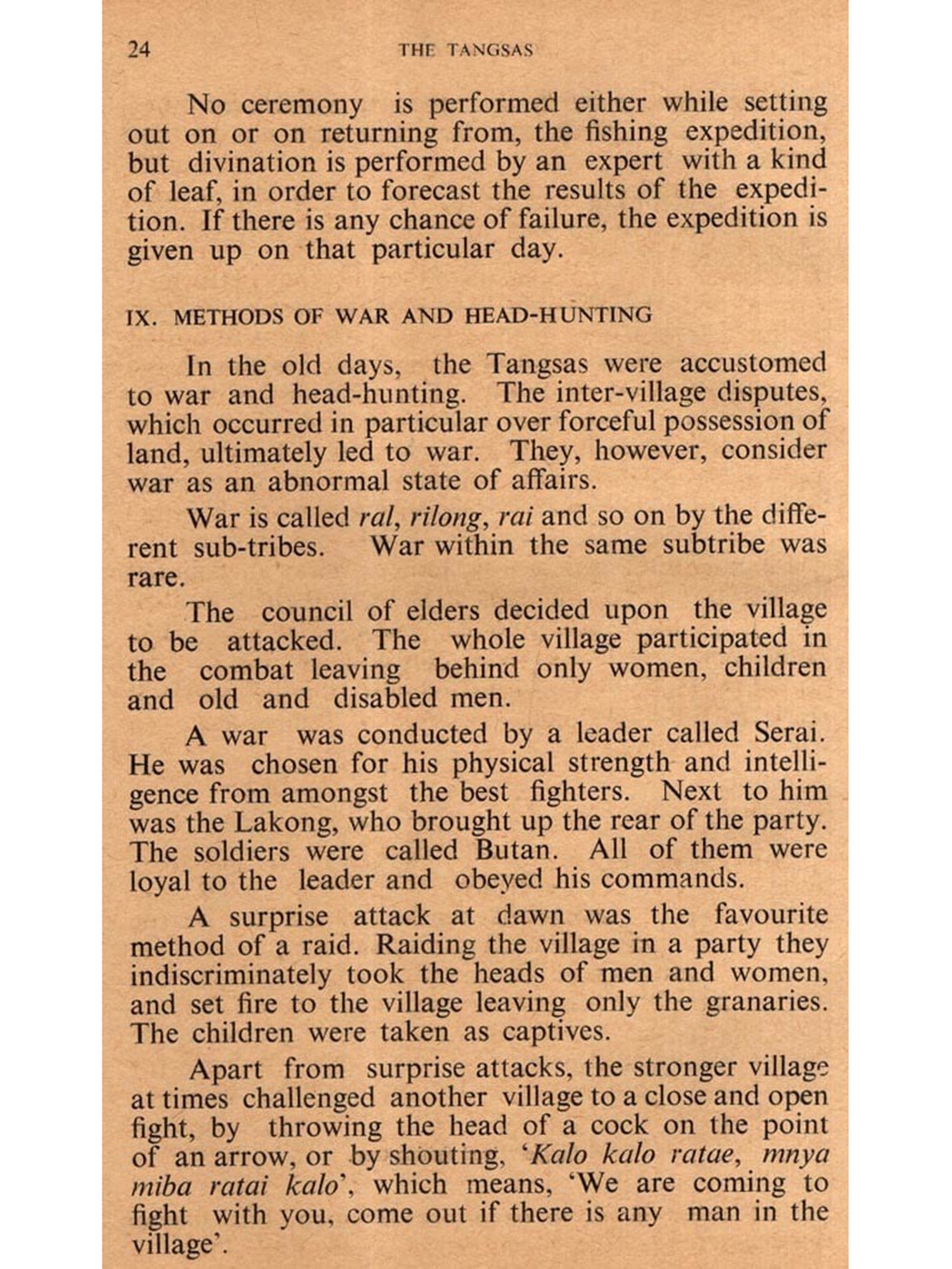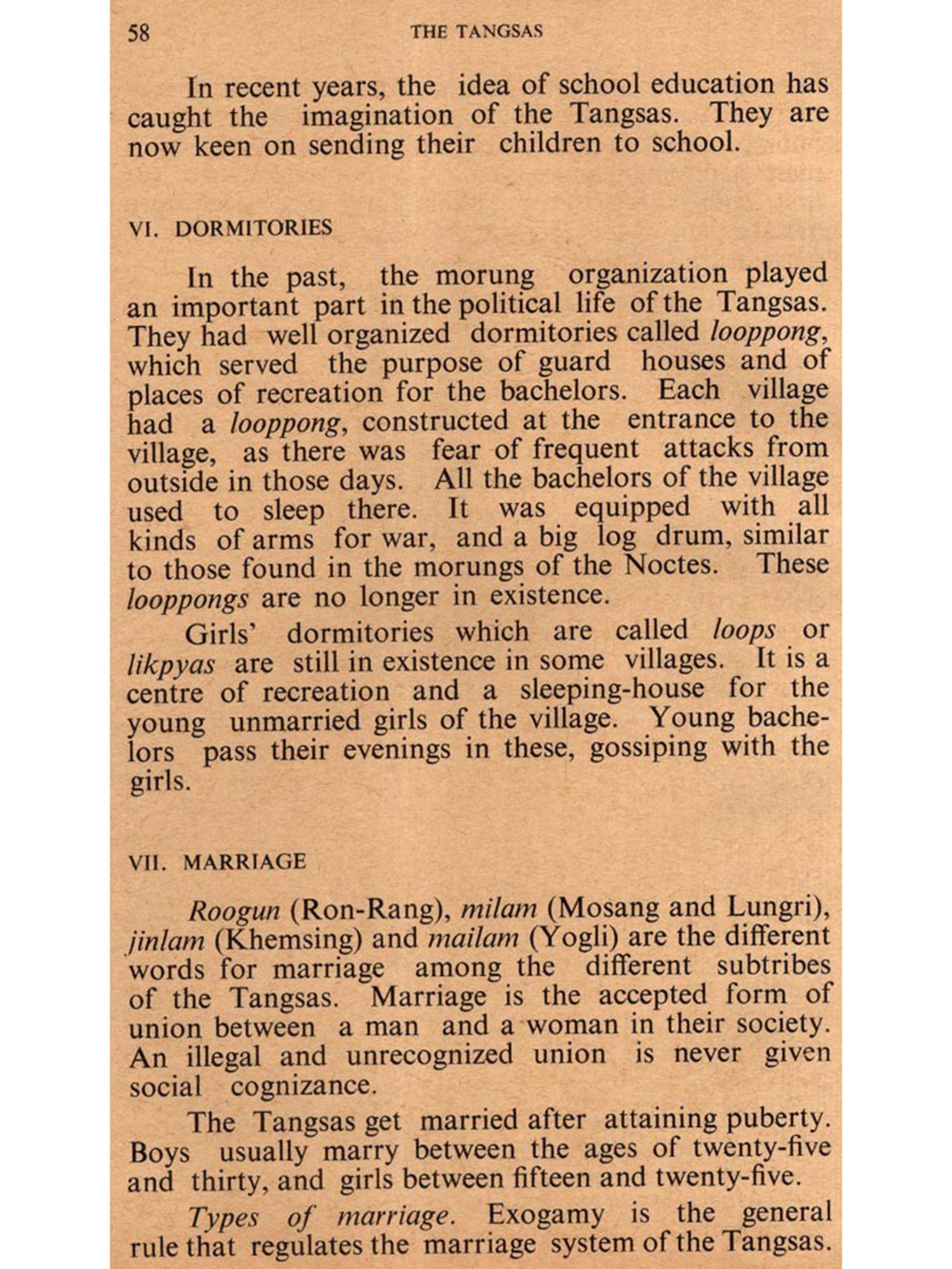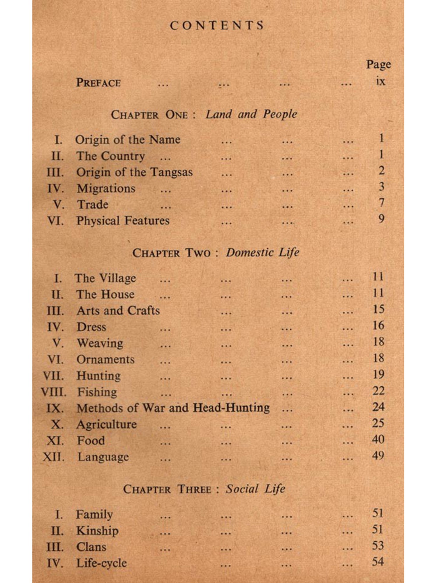In April of 1957, the Assistant Research Officers were directed by the Administration to collect in-formation each on one of the tribes of the Divisions they are posted in and to arrange them in booklets for the use primarily of the officers of the Administration. In compliance with this, I carried out investigations among the Tangsas of Tirap Frontier Division and this booklet is the result.