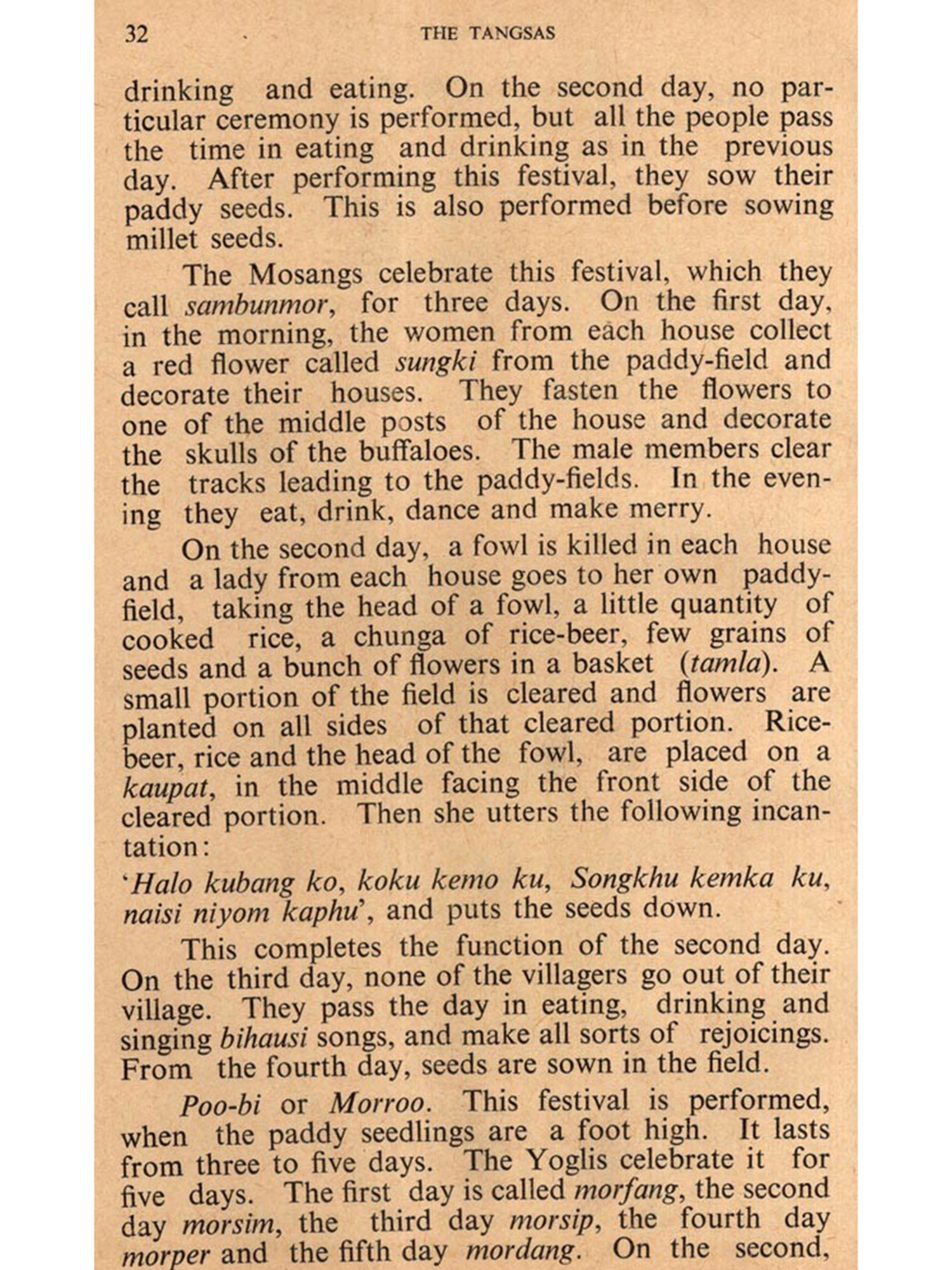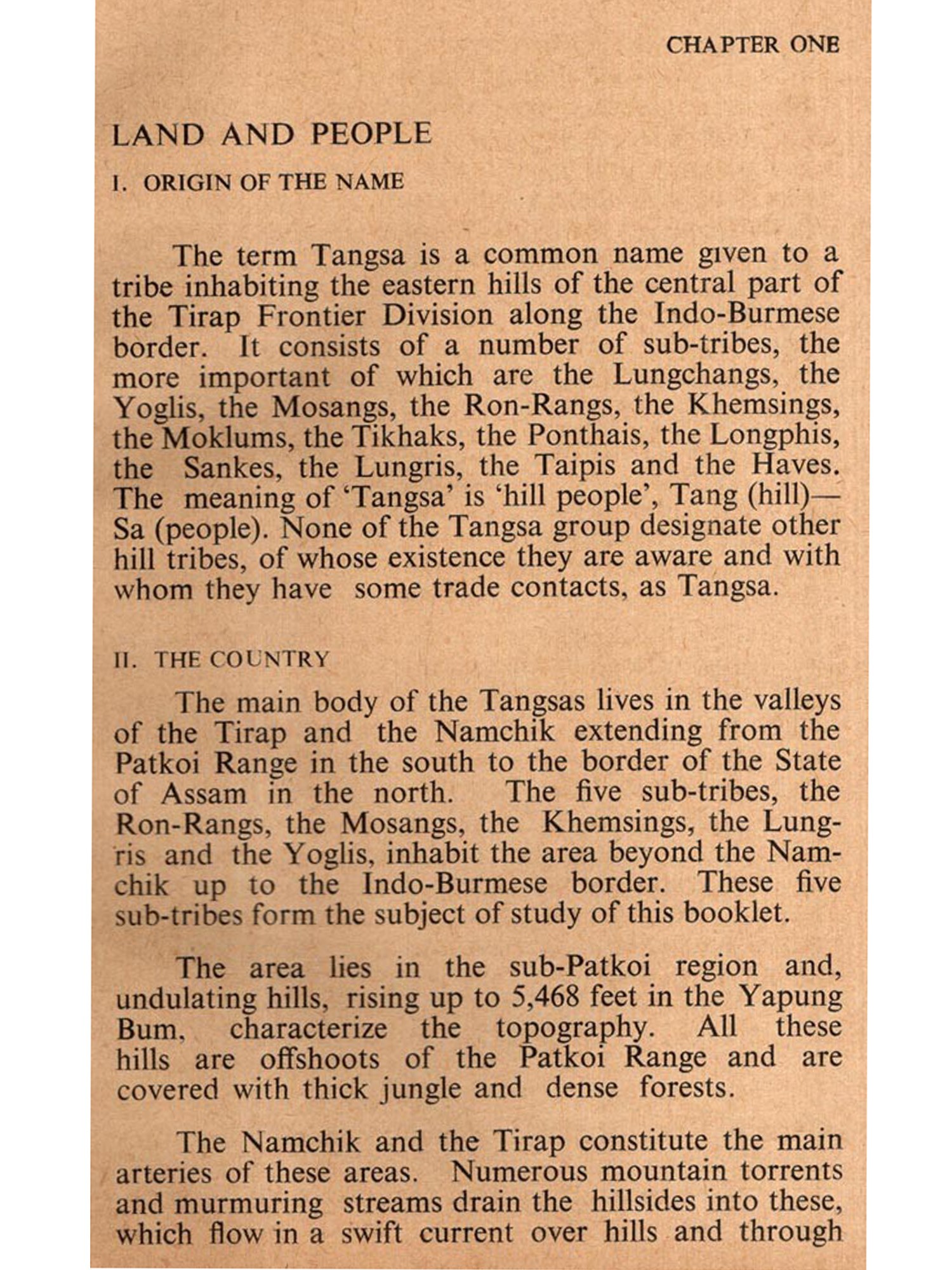 The Tangsas are a large tribe comprising a number of subtribes. They inhabit a very difficult terrain in the central part of the Division along the Indo-Burmese border. Within the time at my disposal-it was not possible for me to cover the entire area, Moreover, the composite culture of this tribe taken as a whole is a very complex one. Each subtribe inhabiting these hills, segregated in scattered valleys and hill sides, has developed individual characteristics which offer a bewildering diversity within a framework of overall uniformity. So, a booklet comprehensive even though not exhaustive on the Tangsas, embodying all the different aspects of their social, economic, religious and political life, as they obtain in the various sub-tribes, would require pro-longed and patient field research and study, which were not possible for me within the stipulated period. I was thus only able to carry out my investigations among the RonRangs, Khemsings, Mosangs, Lungris and Yoglis, who inhabit the valley watered by the Namchik and the Tirap, the two main rivers of this Division. So, the present study is restricted to these five sub-tribes only.