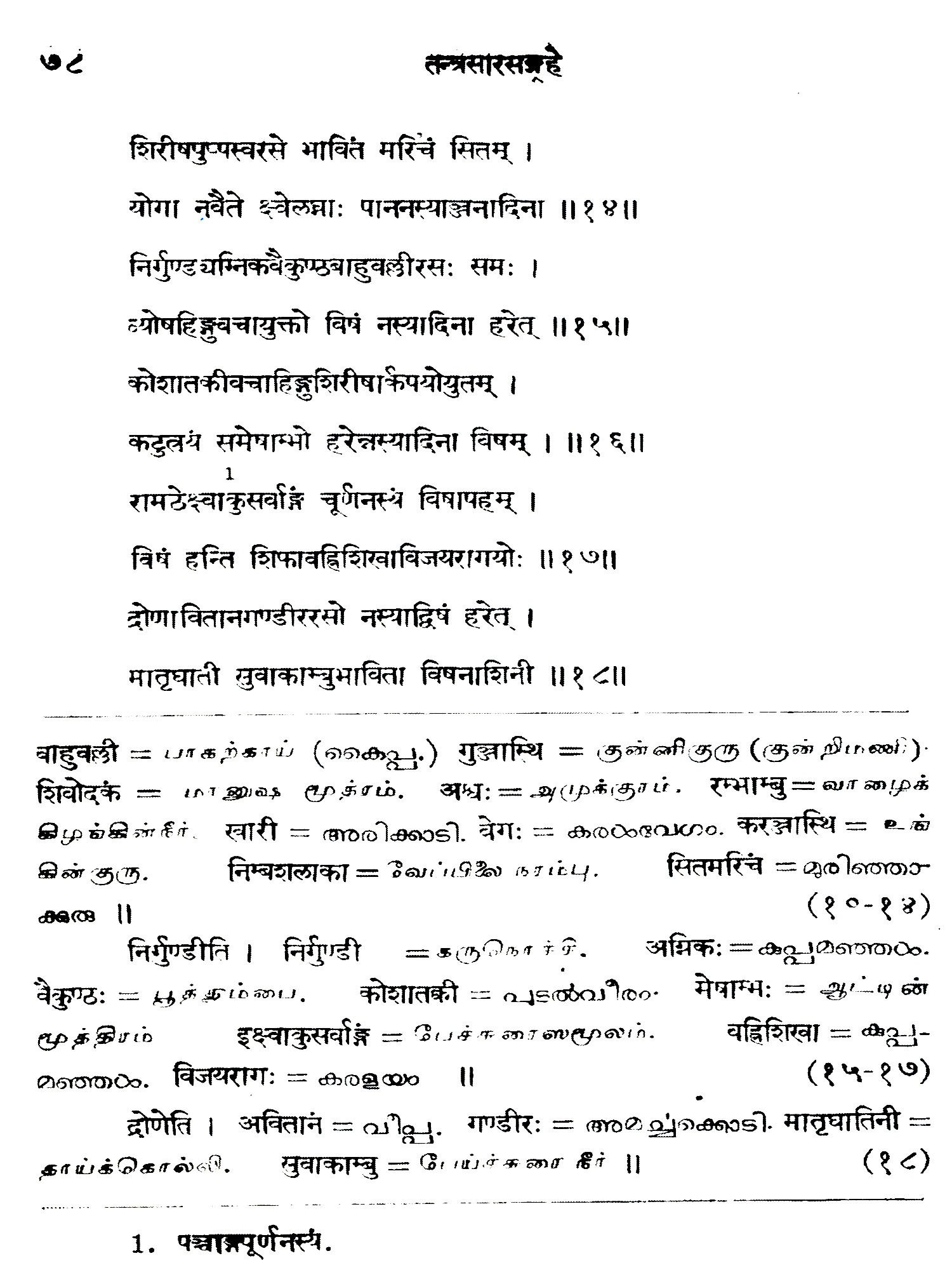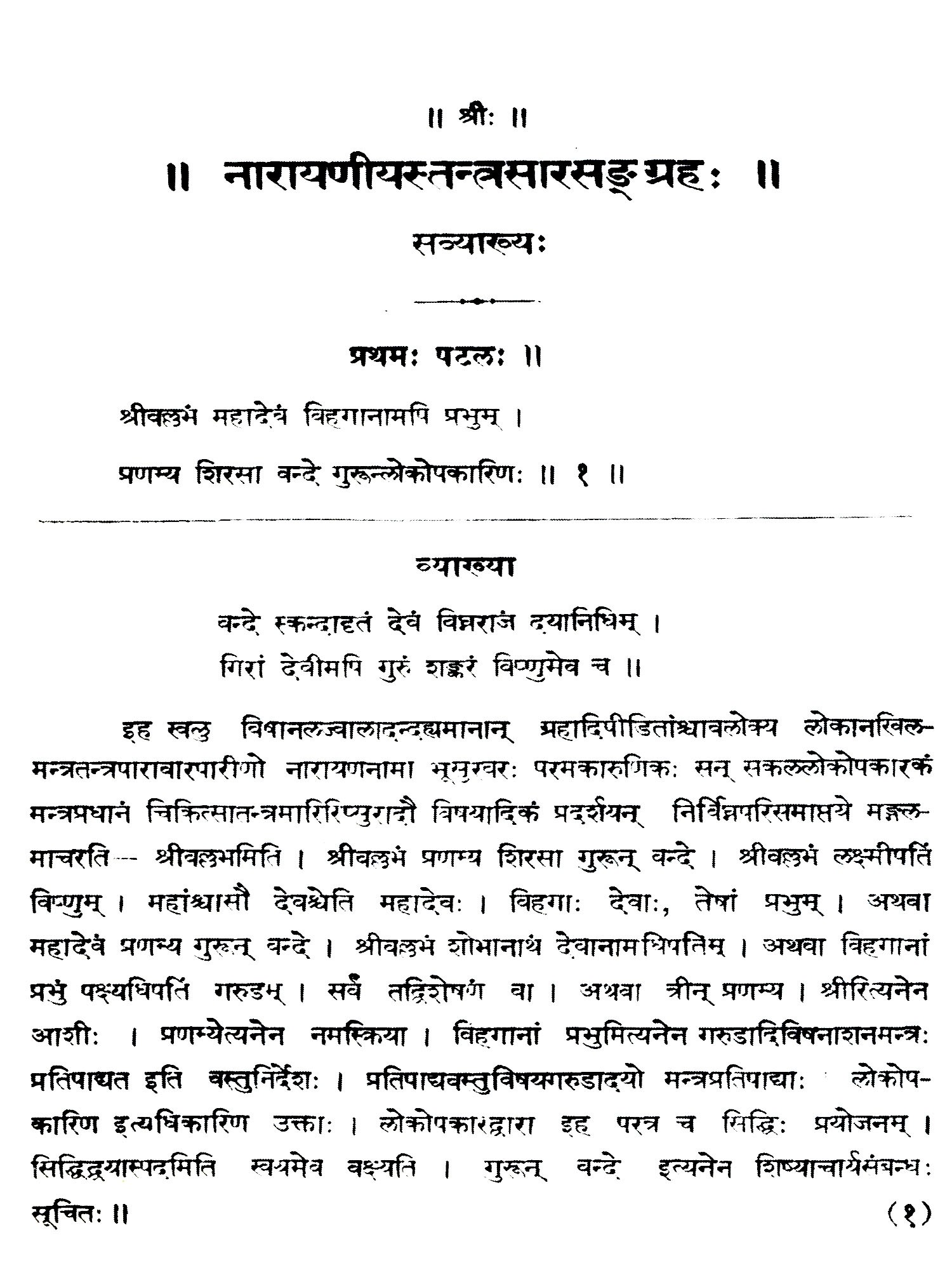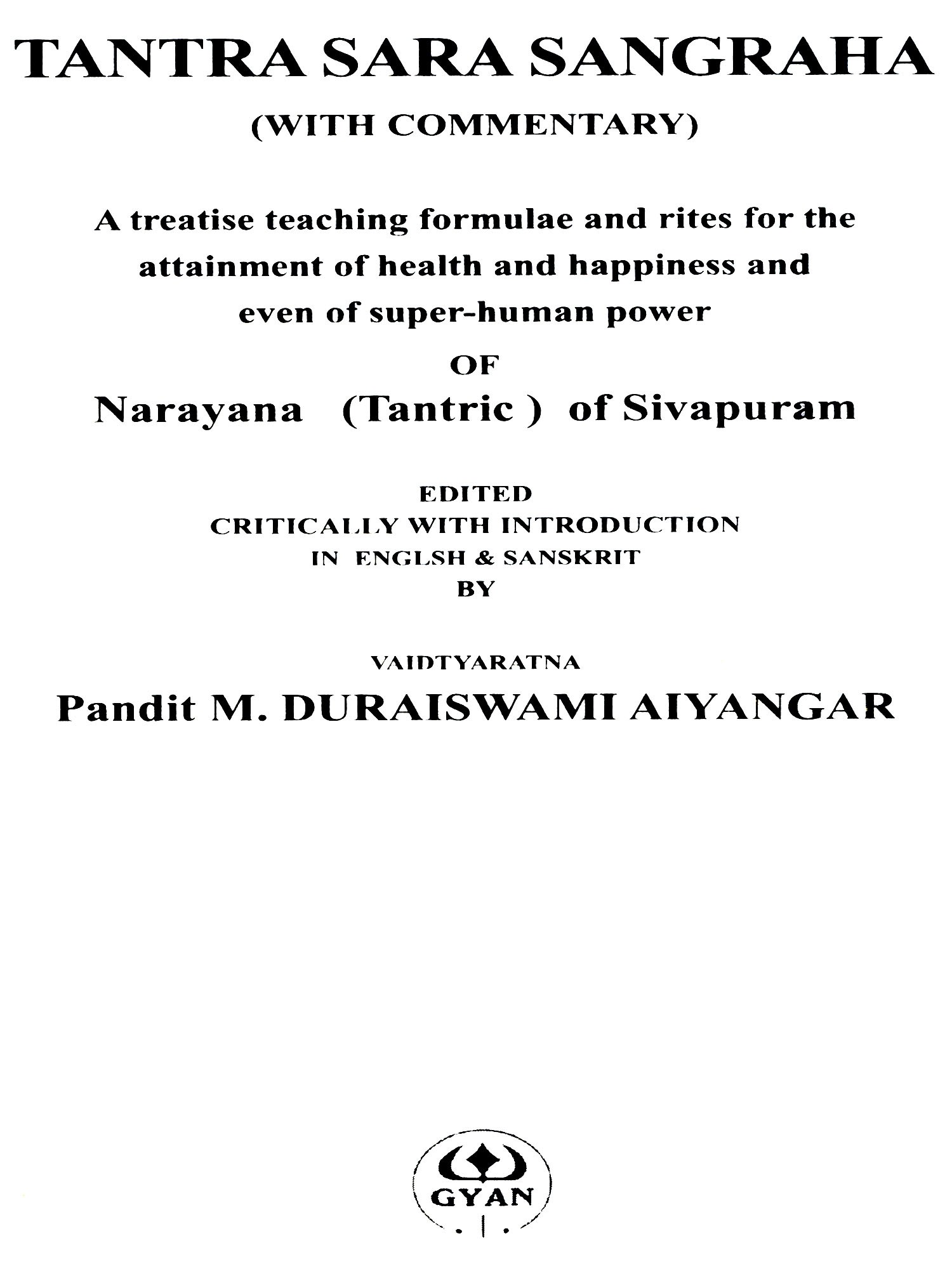 This is a Tantrika work. The subjects dealt with in this work are swiftly fading away in most parts of the country. But in the region of Kerala, Mantra Sastra and Agada Tantra (Toxicology) are still in vogue where many people are interested in learning and practising the traditional lines of these arts. Tantric remedial principles and medicine are not contrary to each other but according to Arsic viewpoints they are concomitant. A. Tantra comprises five subjects the creation, the destruction, the worship of the Gods, the attainment of all objects and magical rites. The author of this work describes all these subjects except the first. This work on such varied Tantrika topics was written some years ago (15th or 16th Century A. D.) with a view to revive these fainting ancient arts by one scholar Narayana who is considered to be one of the top-ranking men well versed in these subjects in Kerala.