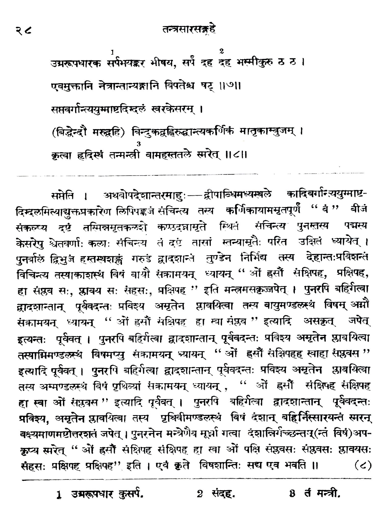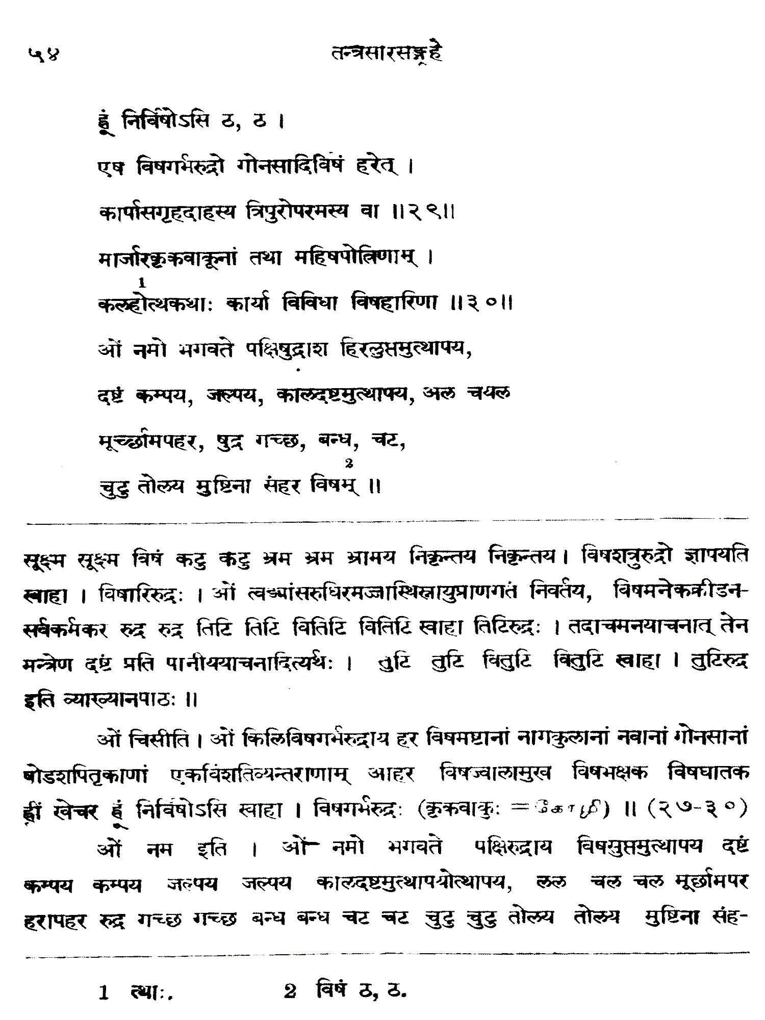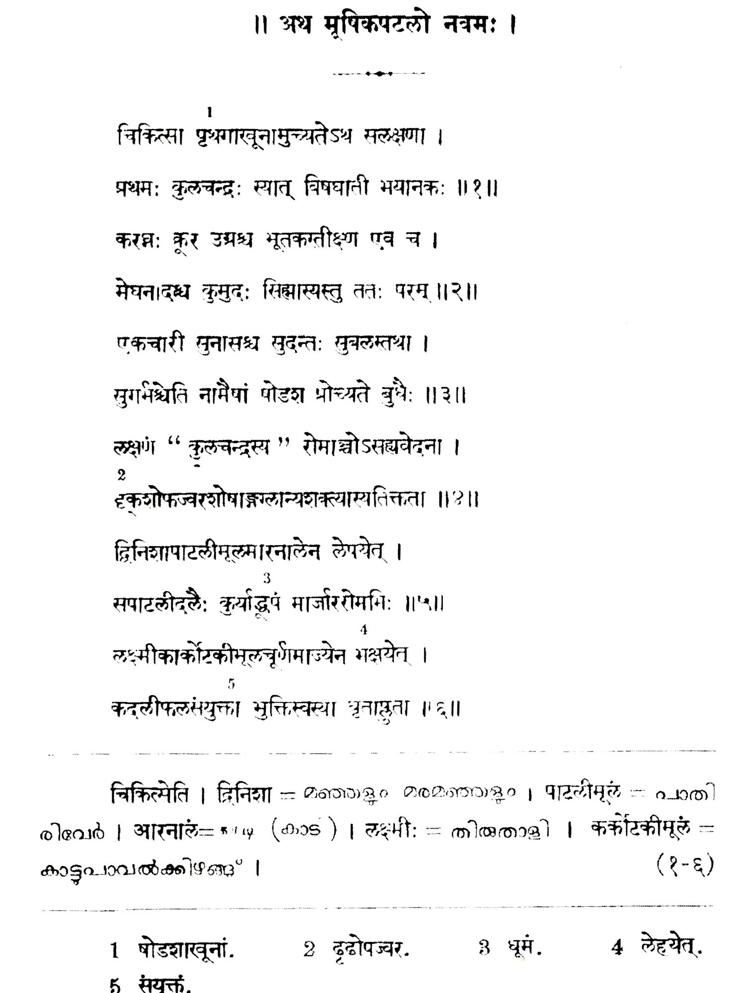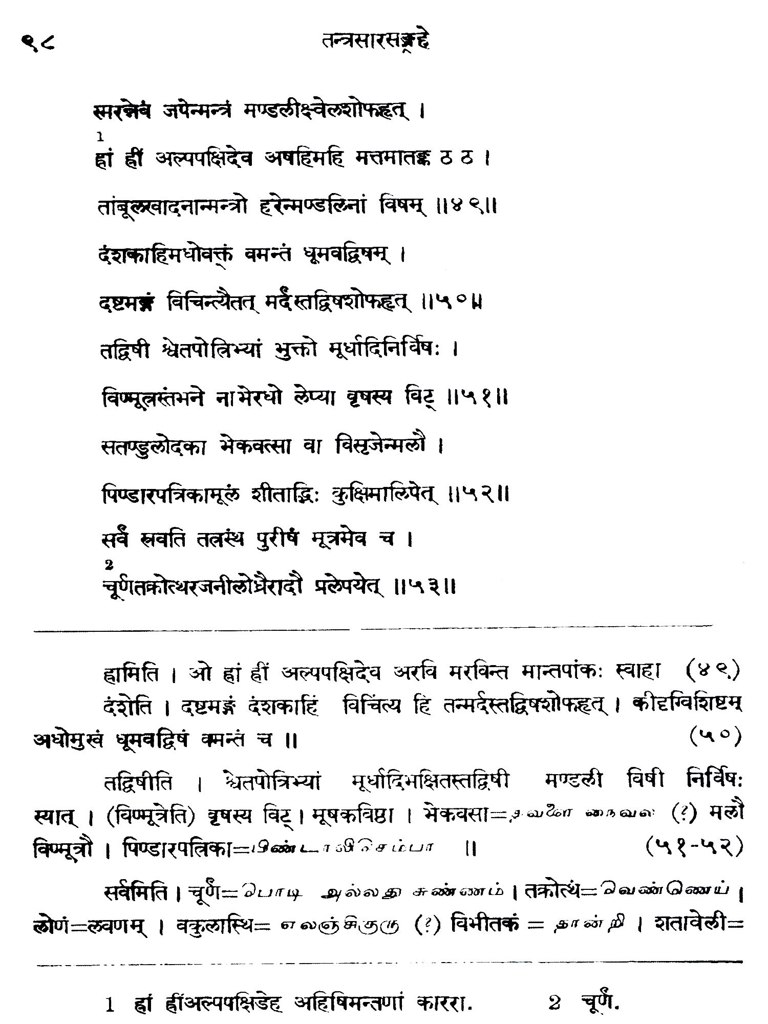 This is a Tantrika work. The subjects dealt with in this work are swiftly fading away in most parts of the country. But in the region of Kerala, Mantra Sastra and Agada Tantra (Toxicology) are still in vogue where many people are interested in learning and practising the traditional lines of these arts. Tantric remedial principles and medicine are not contrary to each other but according to Arsic viewpoints they are concomitant. A. Tantra comprises five subjects the creation, the destruction, the worship of the Gods, the attainment of all objects and magical rites. The author of this work describes all these subjects except the first. This work on such varied Tantrika topics was written some years ago (15th or 16th Century A. D.) with a view to revive these fainting ancient arts by one scholar Narayana who is considered to be one of the top-ranking men well versed in these subjects in Kerala.