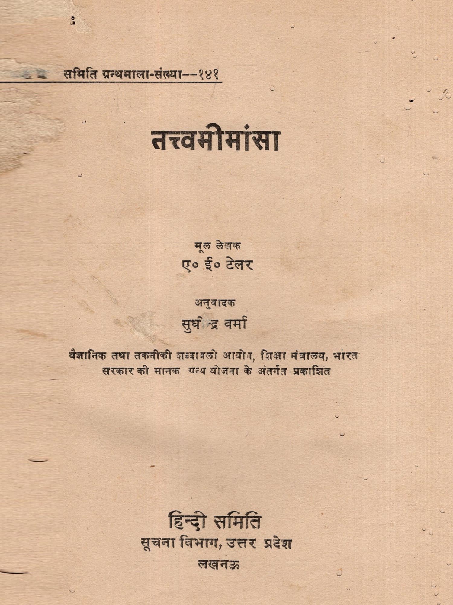 तत्त्वमीमांसा नामक पुस्तक हिन्दी समिति, सूचना विभाग, उत्तर प्रदेश द्वारा प्रस्तुत की जा रही है। इसके मूल लेखक श्री ए० ई० टेलर और अनुवादक श्री सुबीन्द्र बर्मा है। आशा है कि भारत सरकार द्वारा मानक ग्रन्थों के प्रकाशन सम्बन्धी इस प्रयास का सभी क्षेत्रों में स्वागत किया जायगा ।