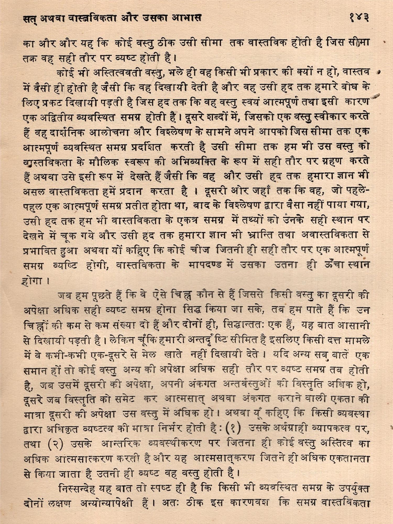 सत्य और आभास की पहचान करानेवाली वैज्ञानिक परीक्षा को तत्त्वमीमांसा की संजा दी गयी है। तत्त्वमीमांसा यह जानना चाहती है कि वास्तविक अस्तित्व अथवा सत्य का अभिप्राय क्या है। वह यह भी जानना चाहती है कि विश्व-प्रपंच से सम्वन्धित विविध वैज्ञानिक अबवा अवैज्ञानिक सिद्धान्त किस सीमा तक सत्य के सामान्य उक्षणों के अनुकूल हैं। जहाँ तक सत्य की खोज का सम्बन्ध है, धर्म और कल्पना-साहित्य दोनों का लक्ष्य आभास से परे जाकर उसमें निहित सत्य से परिचित होना है। तत्त्व-मीमांसा का भी यही लक्ष्य है। किन्तु भावना और पद्धति के विचार से वह धर्म और कल्पना-साहित्य दोनों से भिन्न है क्योंकि वह अस्तित्व अथवा सत्य का विवेचन शुद्ध वैज्ञानिक दृष्टि से करती है। इस विवेचन से बौद्धिक संतोष प्राप्त होता है।