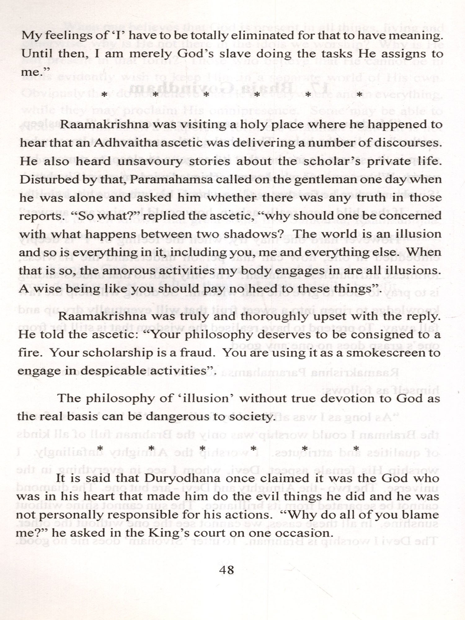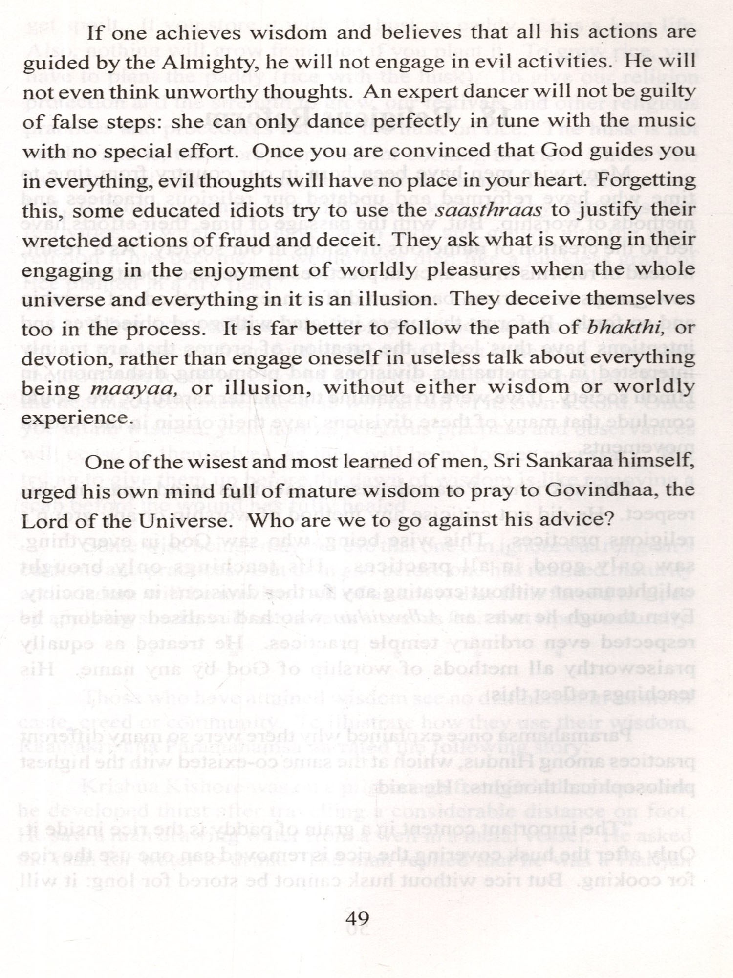 Knowledge of saasthraas is different from bhakthi or devotion. One could learn by heart sacred texts and be able to recite them, but that is not the same as leading a life of dharma (truth) and detachment. The learning of a person who has not attained mental maturity and true wisdom is worthless. Only when one’s external behaviour is guided by internal mental maturity can one be said to have realised wisdom. The teachings of Raamakrishna Paramahamsa will help one attain true wisdom.