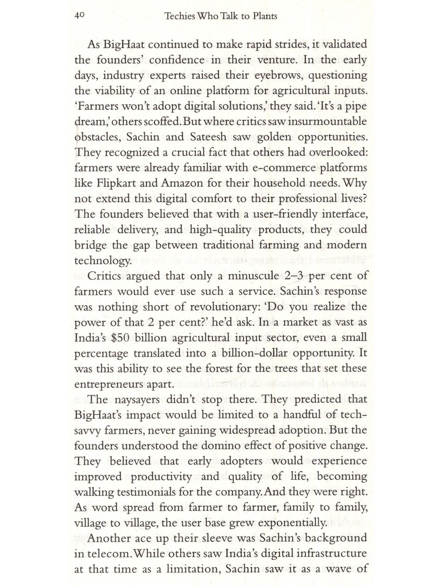 THE UNTOLD STORY OF HOW TECHNOLOGY AND ENTREPRENEURSHIP ARE TRANSFORMING INDIAN AGRICULTURE A quiet revolution is unfolding in urban India and transforming the rural heartland. Led by entrepreneurs who swap office chairs for muddy boots, spending months in remote villages to earn the trust of farmers and understand problems at the grassroots level, this transformation is bringing groundbreaking solutions to age-old agricultural challenges. From Al-powered crop monitoring to blockchain-powered supply chains. Indian agri-tech startups are innovating at a fast pace, merging tradition and technology to redefine the future of farming Whether you're an aspiring entrepreneur, an investor, or a curious reader. Techies Who Talk to Plants offers valuable insights into how businesses can create meaningful social impact. Through real-world stories of resilience and creativity. Shah M.M. highlights the grit and passion driving Indian agri-tech, which seems poised to change not only the nation's agricultural landscape but also global farming practices.