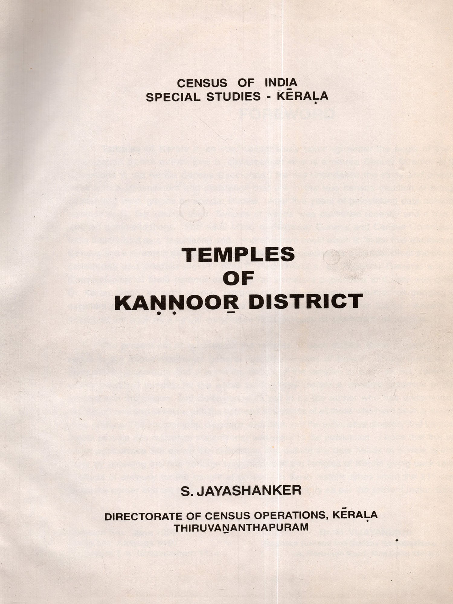 The background of taking up this exhaustive study needs little elaboration. The Census Organization of India undertook a study on Temples of Madras State as an ancillary study of the 1961 census. This study evoked keen interest among scholars, the Government and statutory bodies of Kerala etc. Late Sree R. Vasudeva Poduval a renowned Archaeologist, requested the Registrar General. India (late Sree A. Chandrasekhar) as early as 1969 to launch a study on temples of Kerala similar to the one that was conducted in Madras state and the latter readily agreed to this suggestion. But the study could not be taken up due to heavy pressure of work in connection with the 1971 census. In 1973. the Travancore Devaswom Board also came up with a similar request but the backlog of census work of 1971 census stood in the way in launching the study. In 1979 the Advisor to the Government of Kerala on Temples and Traditional Arts again requested the Director of Census Operations to commence the study. But again some unforeseen. circumstances prevented the organization from taking up the study. However, in May 1990, the Government of Kerala again requested the Census Directorate to take up a detailed survey on Temples of Kerala and the Registrar General (Sree A.R. Nanda LA.S.) directed to commence the survey In June 1991.