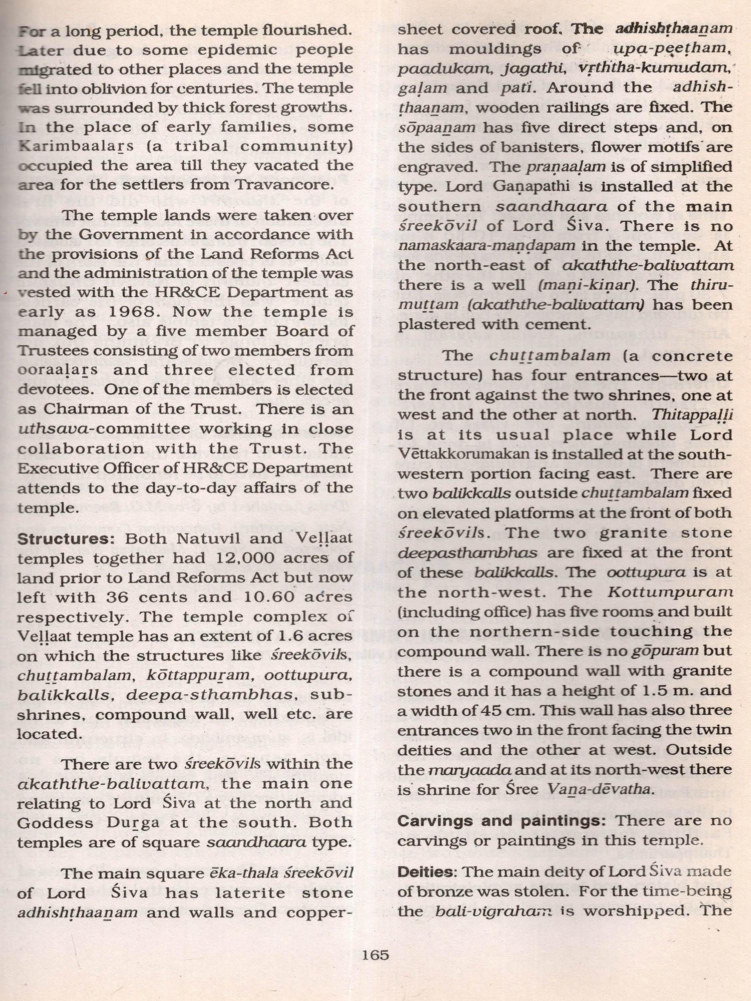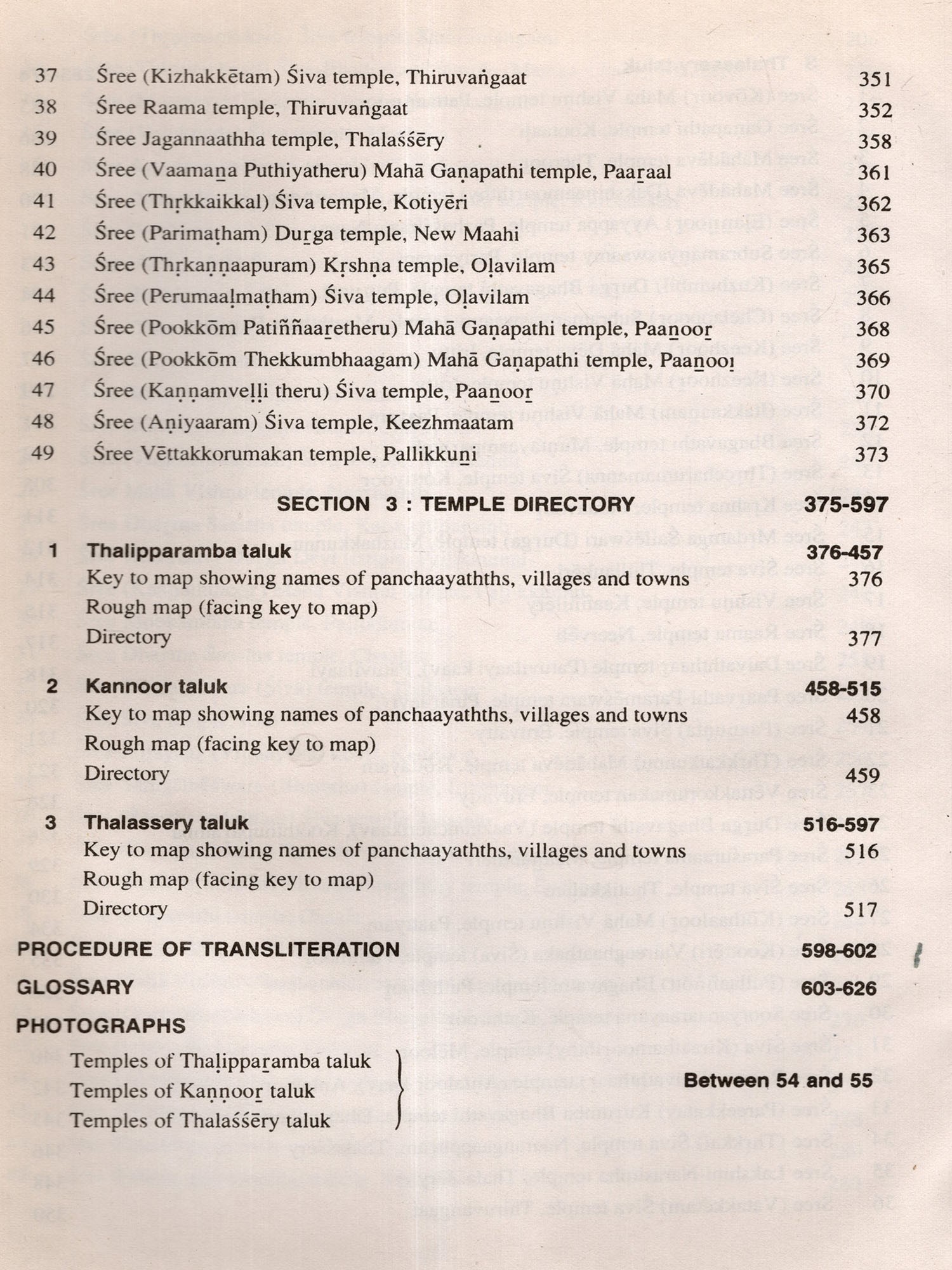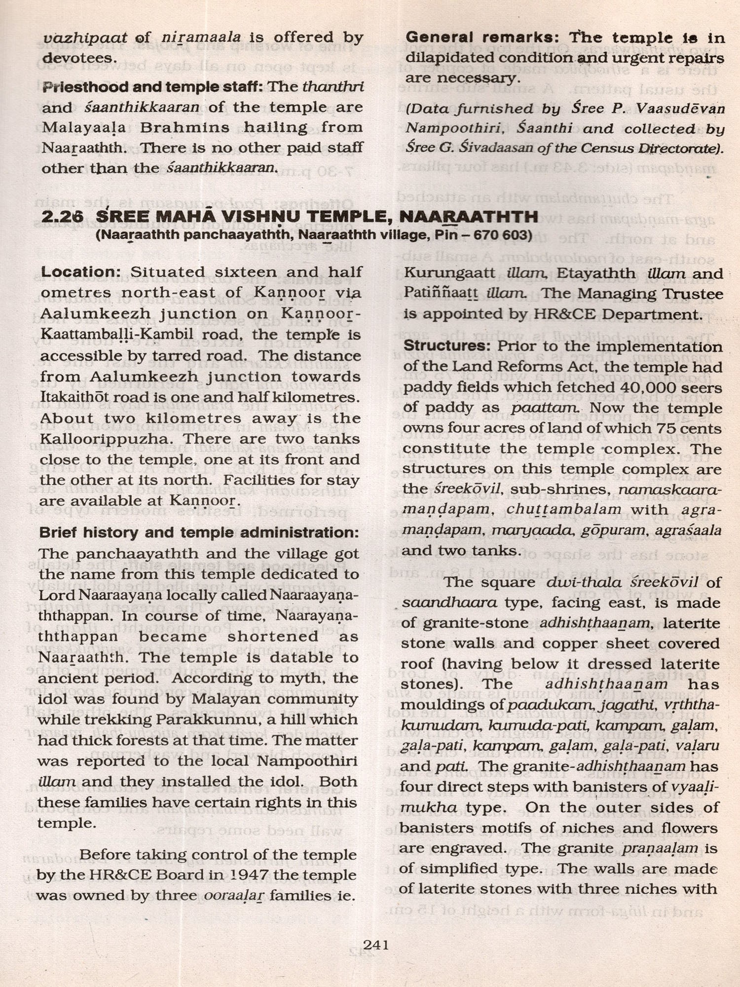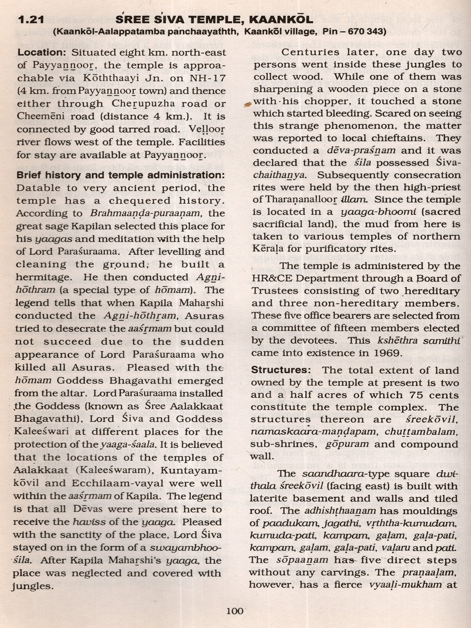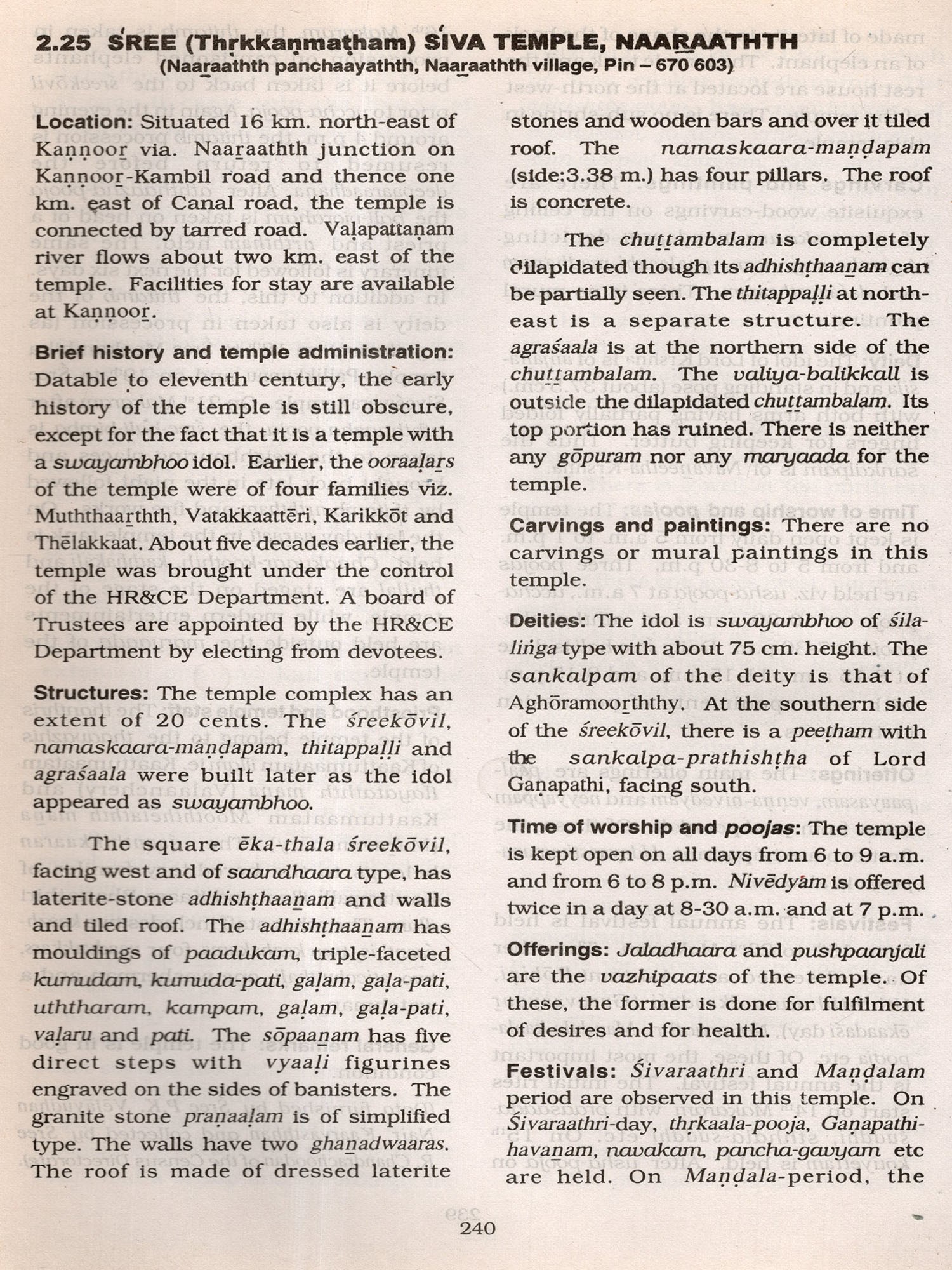 The procedure for the collection of data for the survey deserves special mention The staff deputed for this study was directed to visit all panchaayathths, village offices and note down the names and location of all temples. They were then directed to visit all such temples located in every nook and corner of the panchaayathth, some of which situated even in dense forests and in areas inaccessible by roads, apart from making local enquiries on any possible omissions. These visits and enquiries helped them to prepare a directory (presented as Section 3) of all temples open to public and collect data regarding the name, location, principal deity, antiquity, structural type of main sreekovil. time of worship and poojas, uthsavam/festival besides detalls on ownership/management. Further based on certain criteria ie., all the temples having swayambhoo (self-revealed) Idols and other important temples depending on number of praakaaras, architectural excellence, number of poojas, antiquity and number of worshippers were selected for detailed study. It may be said that great care has been taken to include almost all important temples based on these criteria and the data so collected through a separate detailed schedule are presented in Section 2 of this volume. In this context it is to be noted that every effort was made to cover all important temples. This does not mean that other temples are unimportant. But the more prominent ones based on the above mentioned specified criteria were given due weightage. Section 1 gives an overall review on temples of Karnnoor district with a backdrop on geographical setting, historical and other aspects.