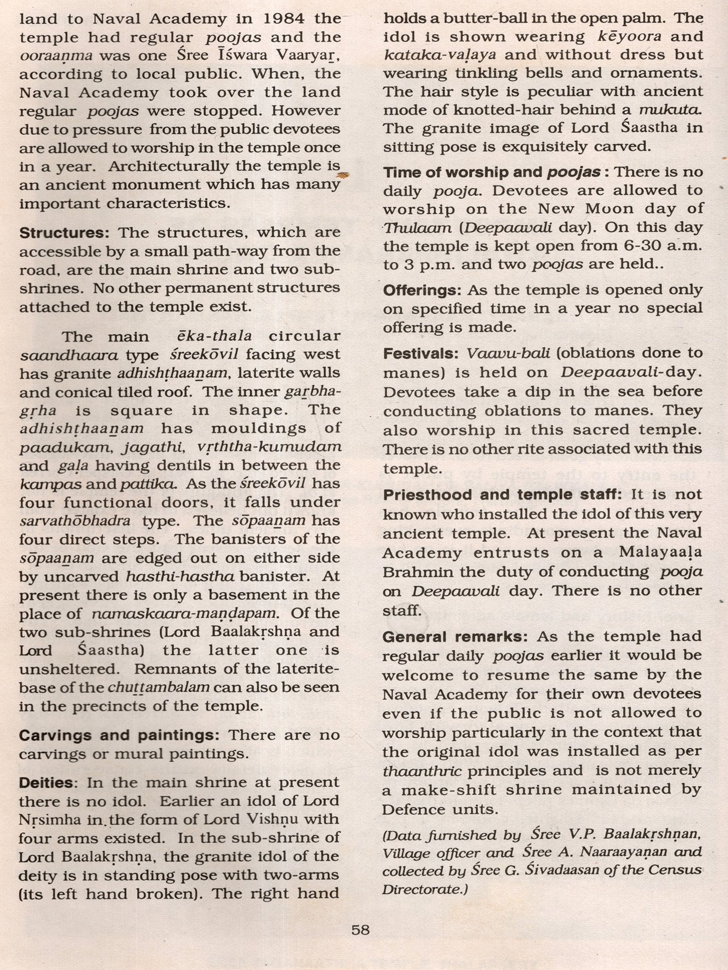 For canvassing the data a schedule was designed in consultation with thanthris. silpis etc., besides incorporating the valuable suggestions given by Sree A.R. Nanda. I.A.S. (former Registrar General, India), late Dr. K. P. Ittaman (former Deputy Registrar General. India) and late Sree K.C. Narayana Kurup (former Deputy Director of Census Operations. Madras). The schedules were printed in September 1991 and the work commenced.