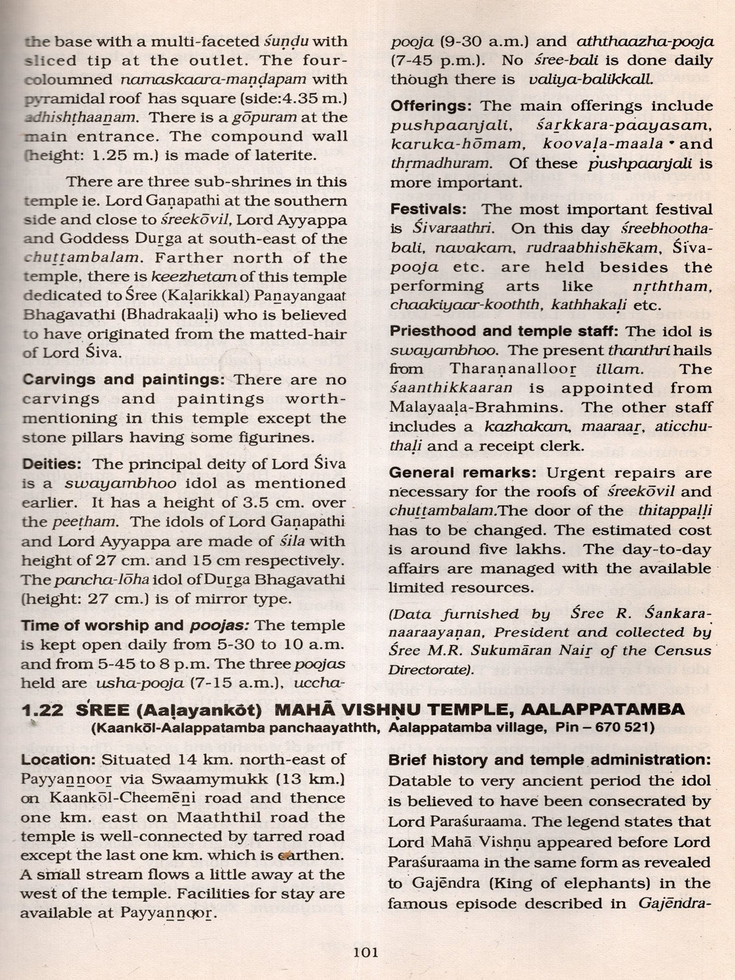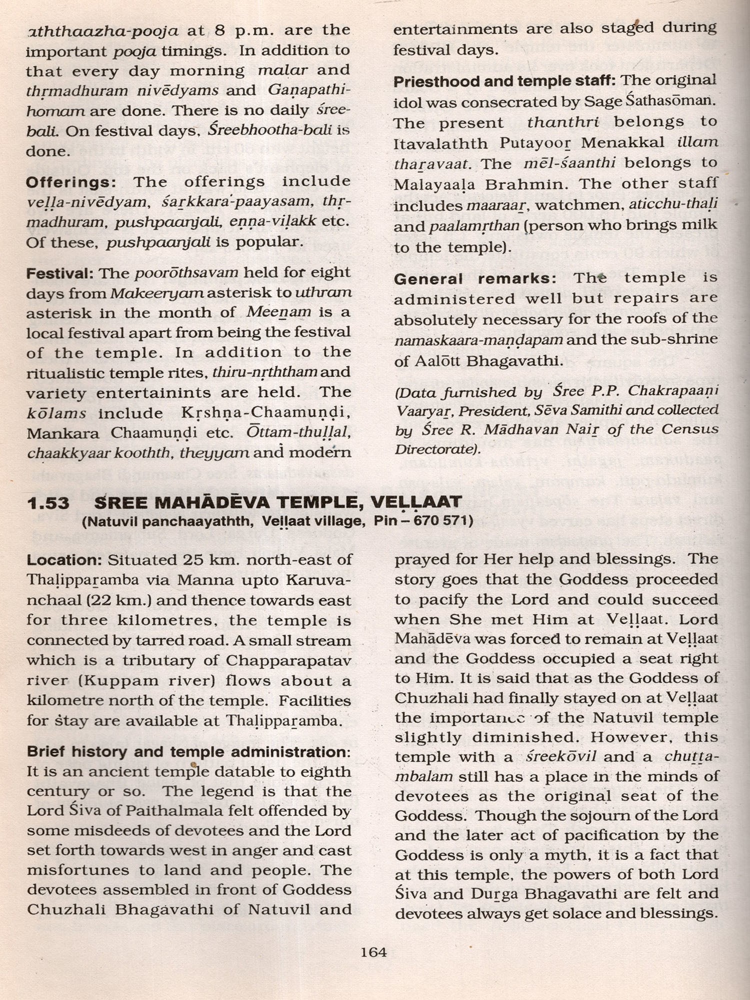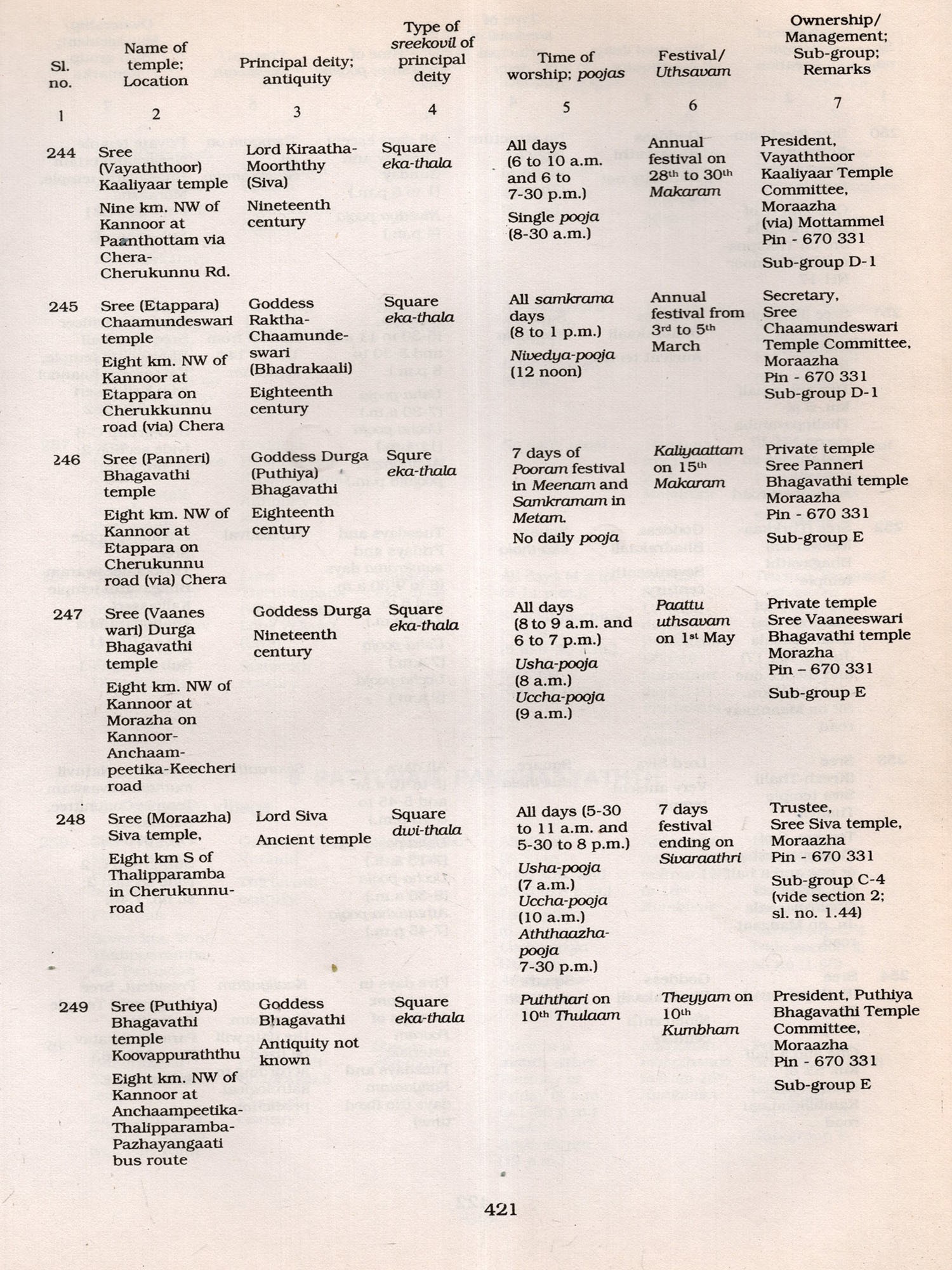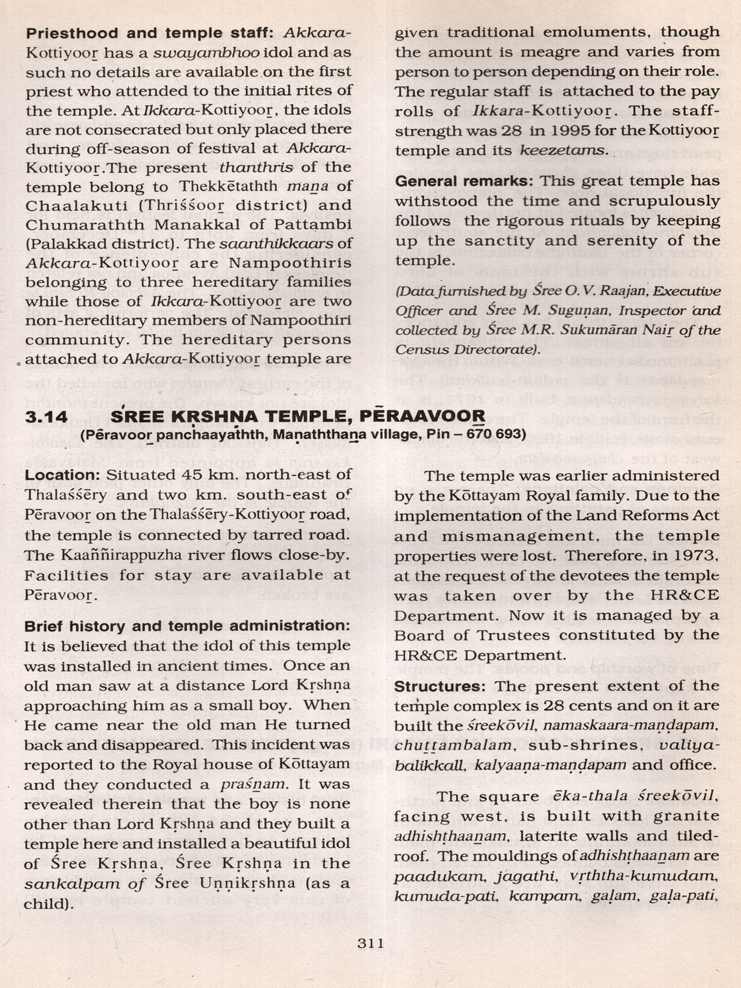 It is worthwhile to mention here the limitations of the data. The Informants, mainly temple authorities, were generally co-operative. However, some of them were reluctant to provide details fearing that their private temples might be taken over by the Government and they took the stand that those temples were exclusively used by family members and not open to public. On the other hand some insisted on having their temples enumerated hoping to get some financial assistance for their family temples at a later stage. Another difficulty encountered by the field staff was that very often they had to go to the same temple several times to collect details as the temples were kept open only for specified hours (either morning or noon or evening besides non-availability of reliable informants. Similarly it was difficult to verify the claim of informants on the data of antiquity and myths associated with those temples, In spite of these limitations every effort was made to collect detailed data. The field-survey of Kannoor district was done during 1993-95 and, therefore, subsequent changes on structures, idols etc. have not been Incorporated in this volume except in few cases where re-visits were done. The data thus collected through the field-survey is published in this volume. The earlier proposed title of the volume. ie.. Temple Directory (mentioned in the earlier monograph Temples of Kerala), had to be changed in the district monographs consequent on the introduction of a section dealing with the general background of temples of the district.
