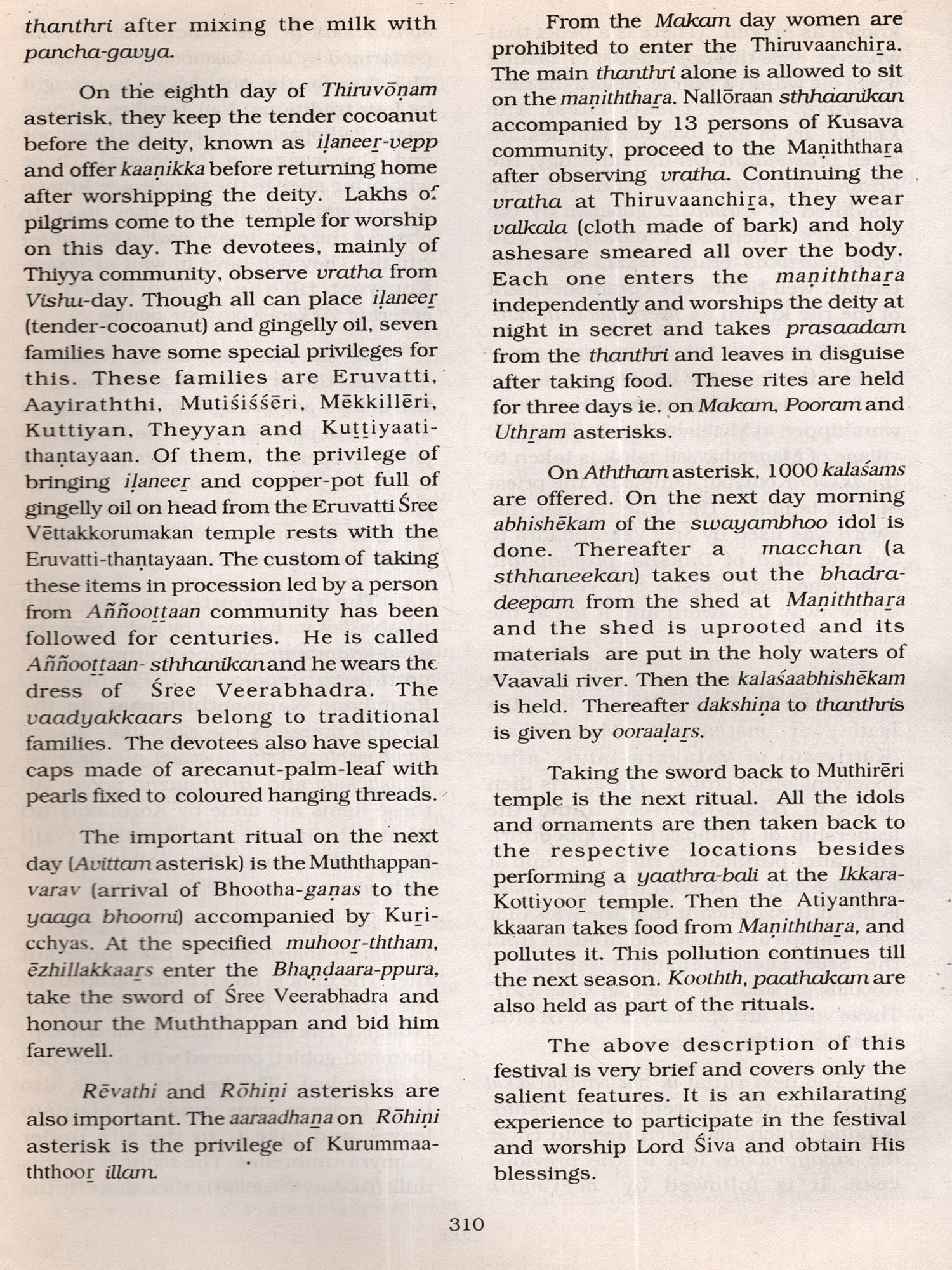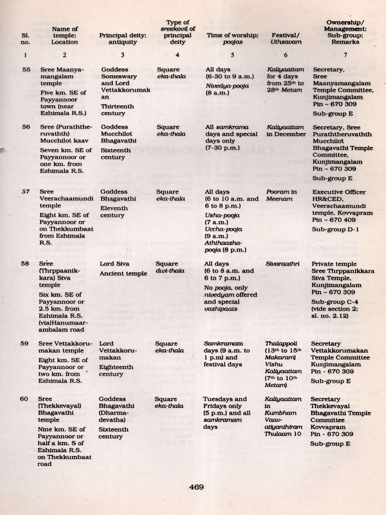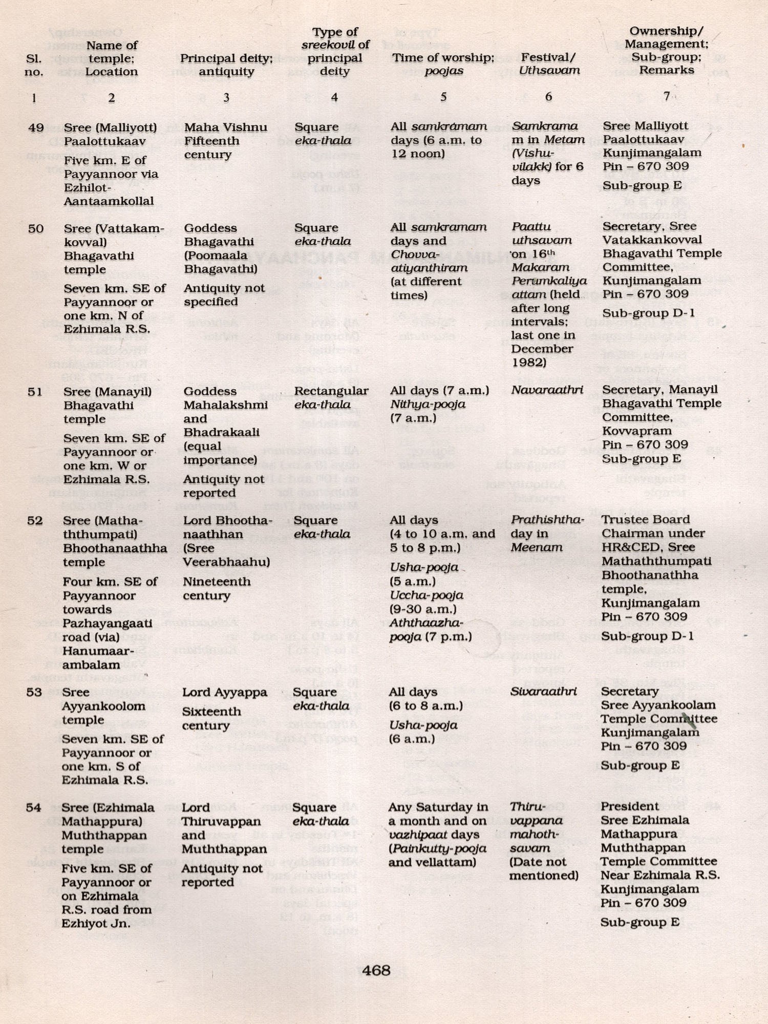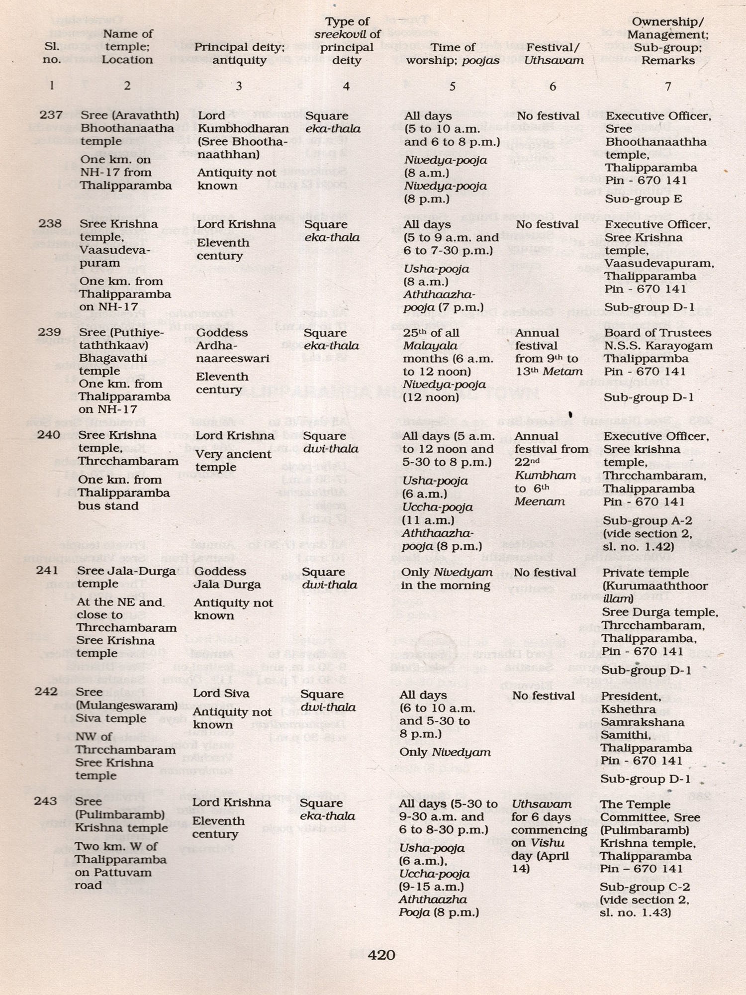 It is worthwhile to mention here the limitations of the data. The Informants, mainly temple authorities, were generally co-operative. However, some of them were reluctant to provide details fearing that their private temples might be taken over by the Government and they took the stand that those temples were exclusively used by family members and not open to public. On the other hand some insisted on having their temples enumerated hoping to get some financial assistance for their family temples at a later stage. Another difficulty encountered by the field staff was that very often they had to go to the same temple several times to collect details as the temples were kept open only for specified hours (either morning or noon or evening besides non-availability of reliable informants. Similarly it was difficult to verify the claim of informants on the data of antiquity and myths associated with those temples, In spite of these limitations every effort was made to collect detailed data. The field-survey of Kannoor district was done during 1993-95 and, therefore, subsequent changes on structures, idols etc. have not been Incorporated in this volume except in few cases where re-visits were done. The data thus collected through the field-survey is published in this volume. The earlier proposed title of the volume. ie.. Temple Directory (mentioned in the earlier monograph Temples of Kerala), had to be changed in the district monographs consequent on the introduction of a section dealing with the general background of temples of the district.