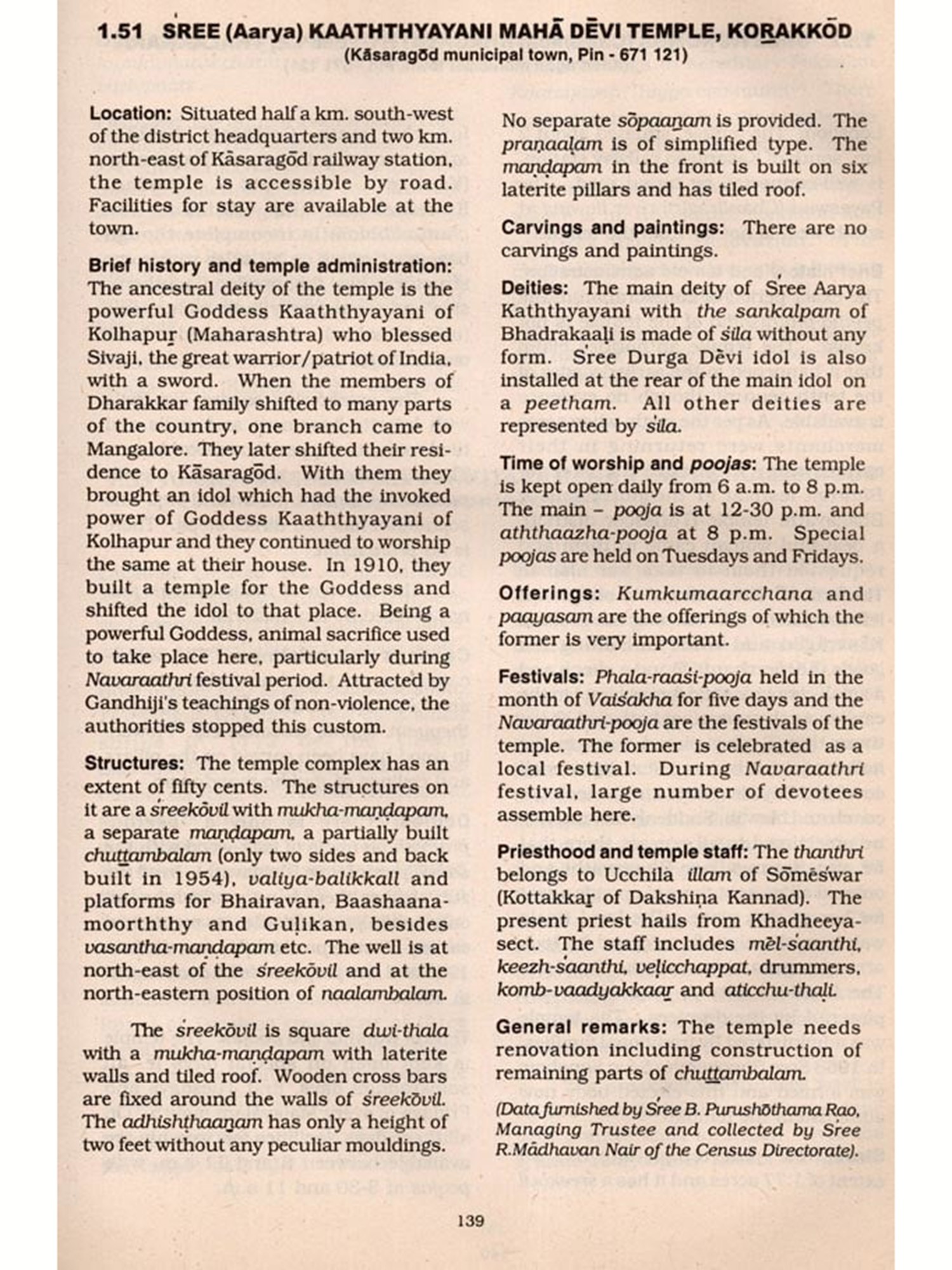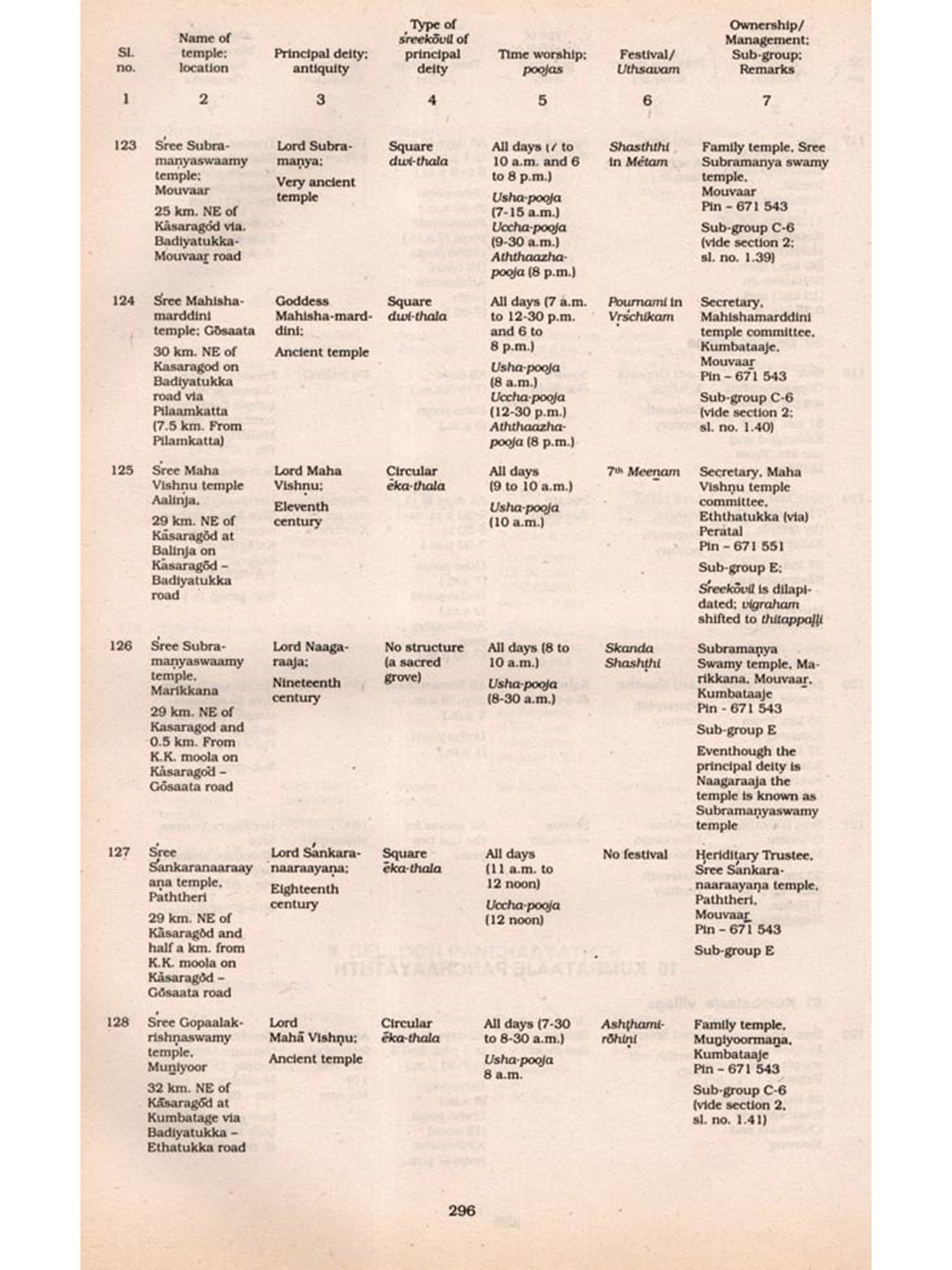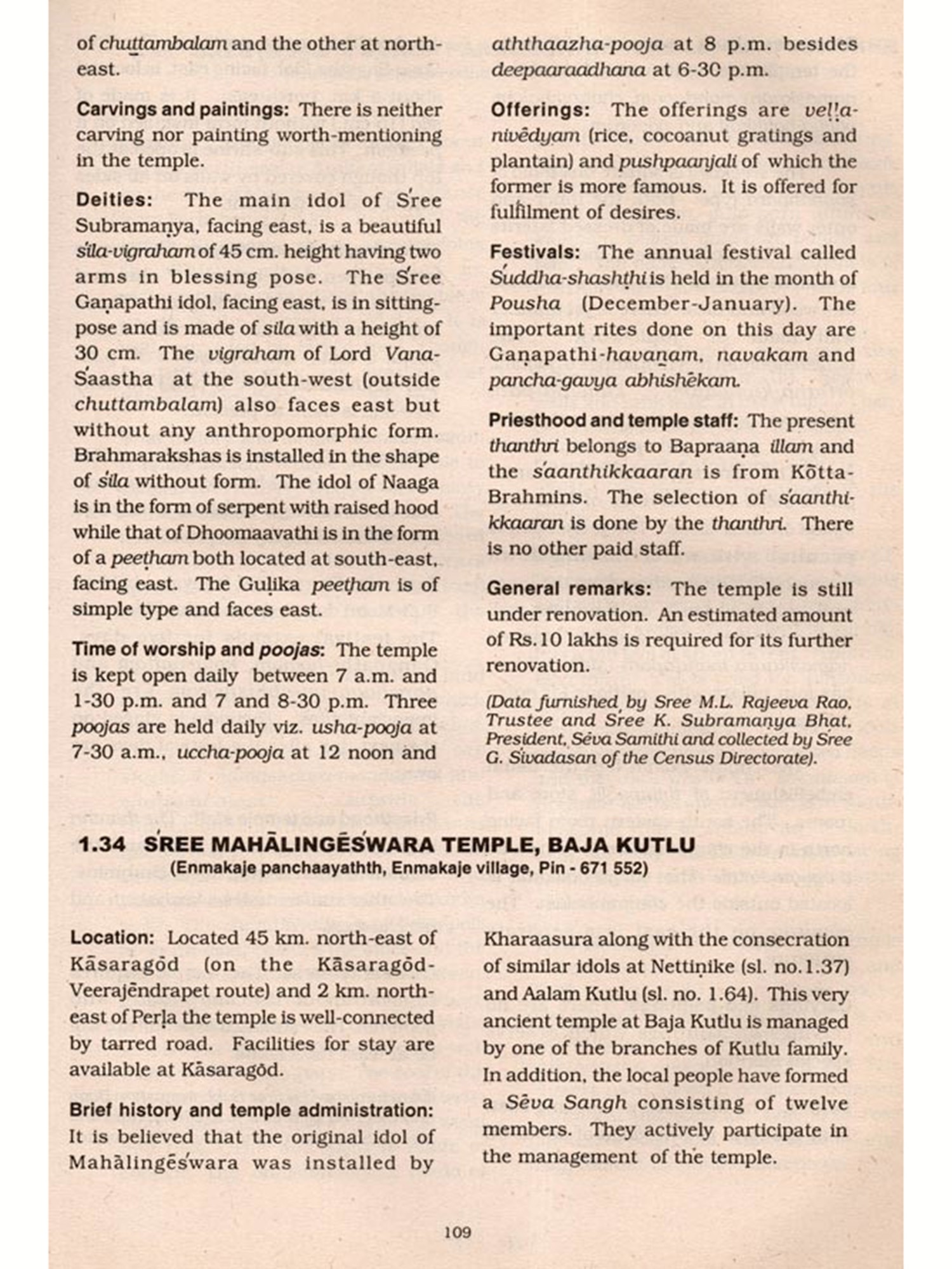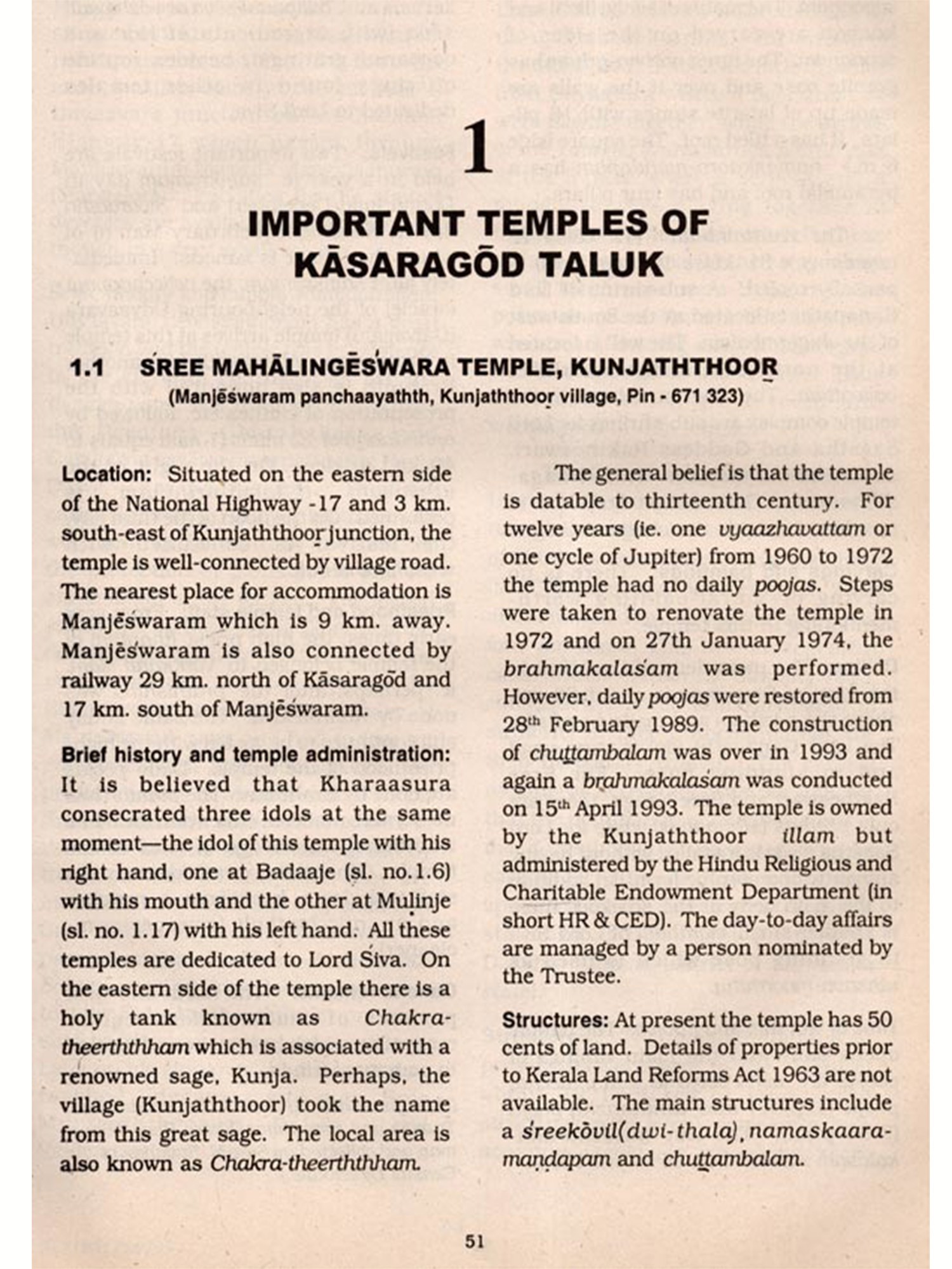 The data thus collected through the field survey is published in this volume. The earlier proposed title of the volume, etc.. Temple Directory (mentioned in the earlier monograph), had to be changed consequent on the introduction of a section dealing with the general background of temples of the district. Thus this volume has three sections iz. Section 1: General Background. Section 2: Sallent features on important temples and Section 3. Temple Directory (which covers list of temples in Kasaragod district falling in panchaayathths and statutory bodies).