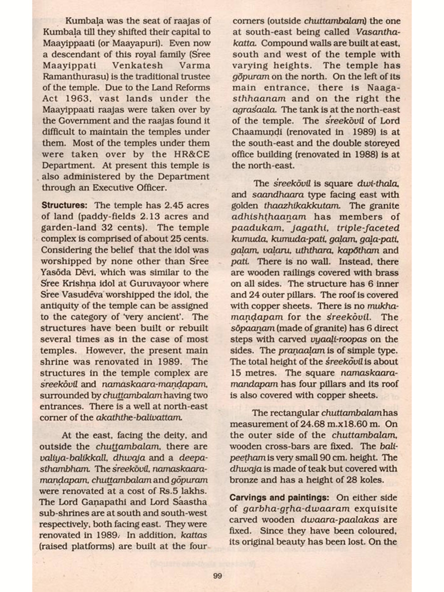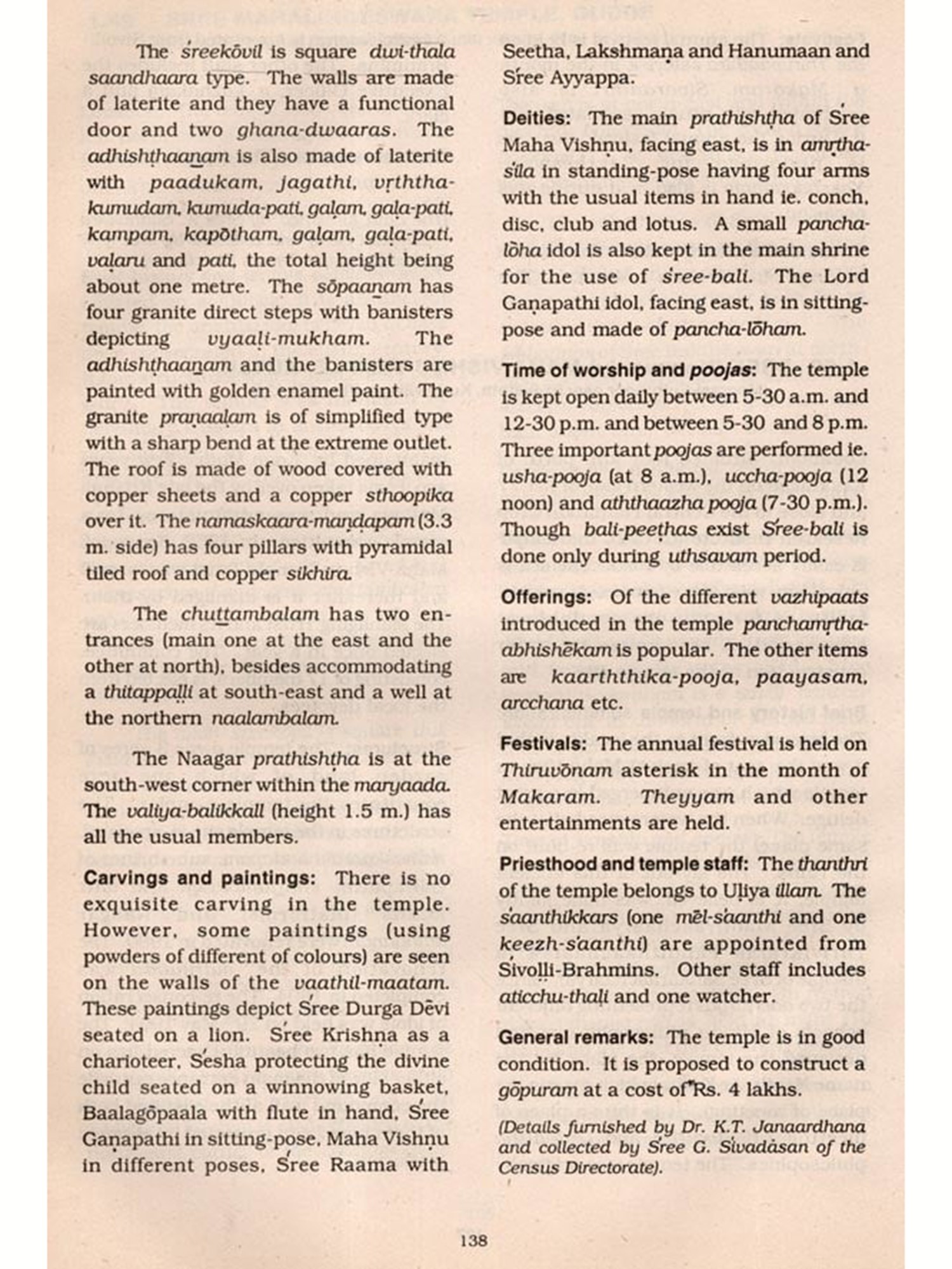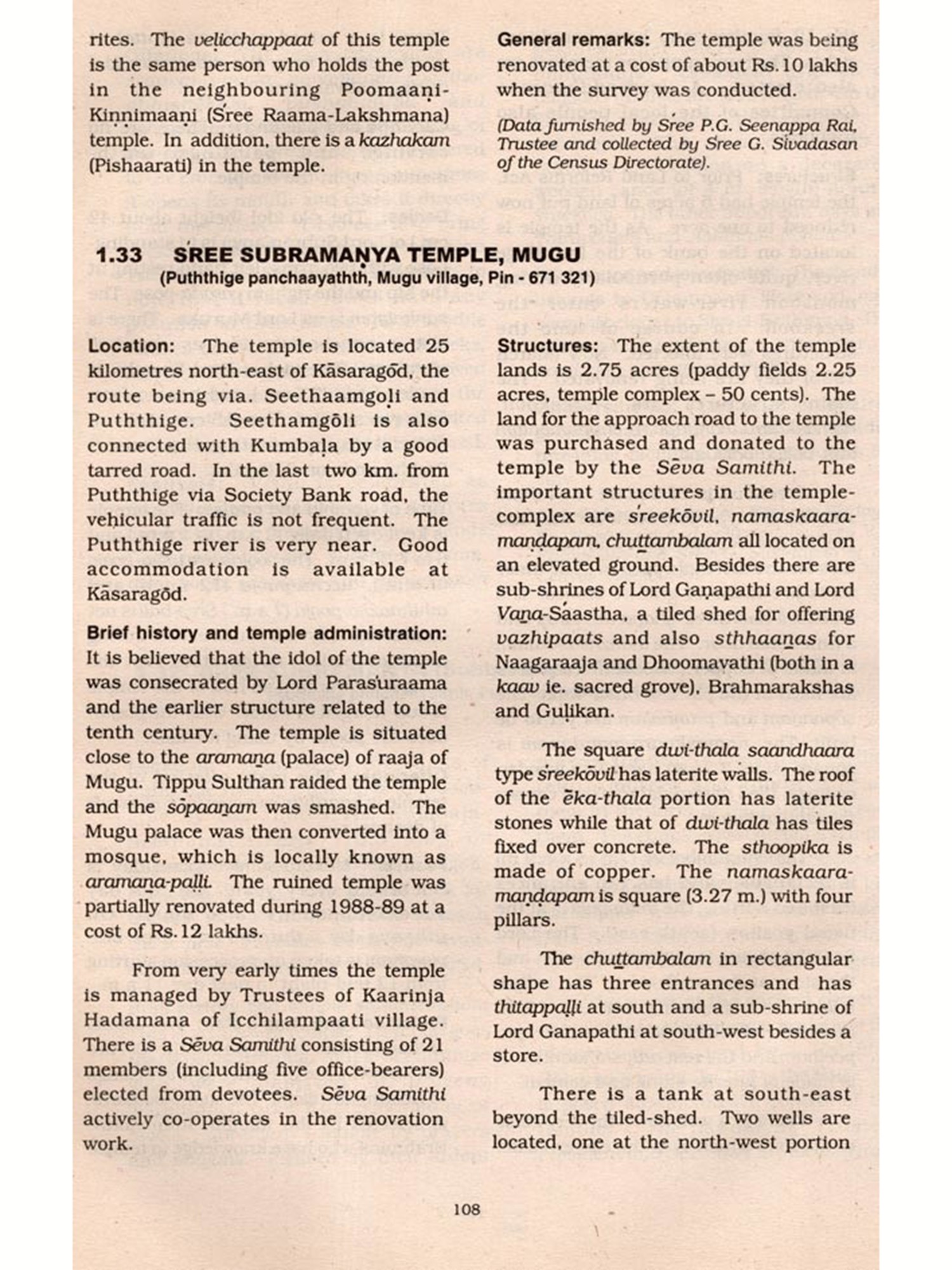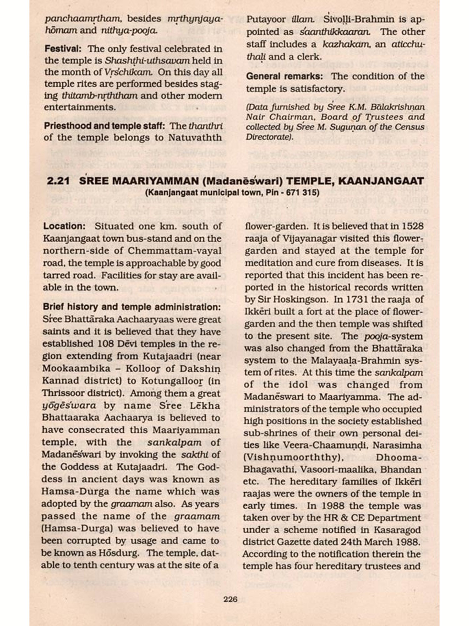 The data thus collected through the field survey is published in this volume. The earlier proposed title of the volume, etc.. Temple Directory (mentioned in the earlier monograph), had to be changed consequent on the introduction of a section dealing with the general background of temples of the district. Thus this volume has three sections iz. Section 1: General Background. Section 2: Sallent features on important temples and Section 3. Temple Directory (which covers list of temples in Kasaragod district falling in panchaayathths and statutory bodies).