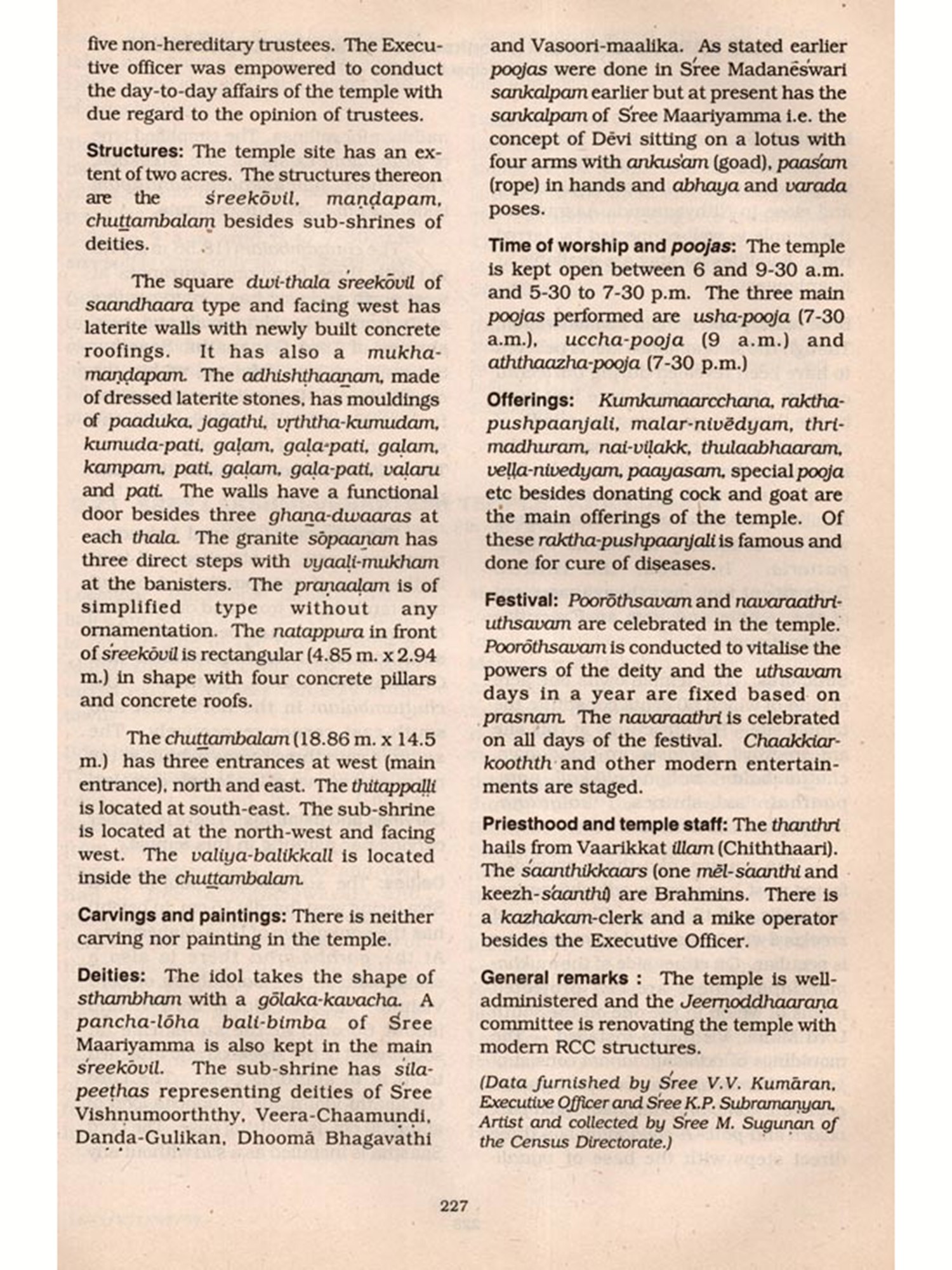 The procedure for the collection of data for the survey deserves special mention. The stall deputed for this study was directed to visit all panchaayathths, village offices and note down the names and location of all temples. They were then directed to visit all such temples located in every nook and corner of the panchaayathth, some of which situated even in dense forests and in areas inaccessible by roads, apart from making local enquiries on any possible omissions. These visits and enquiries helped them to prepare a directory of all temples open to public and collect data regarding the name. location, principal deity, antiquity, structural type of main sreckovd, time of worship and poojas, uthsawam/festival besides details on ownership/management. Further based on certain criteria, ie, all the temples having surayambhoo (self-revealed) idols and other Important temples depending on number of praaknaras, architectural excellence, number of pogas, antiquity and number of worshippers, were selected for detailed study It may be said that great care has been taken to include almost all important temples based on these criteria and the data so collected through a separate detailed schedule are presented in Section 2 of this volume. In this context it is to be noted that every effort was made to cover all important temples. This does not mean that other temples are unimportant But the more prominent ones based on the above mentioned specified criteria were given due weightage.