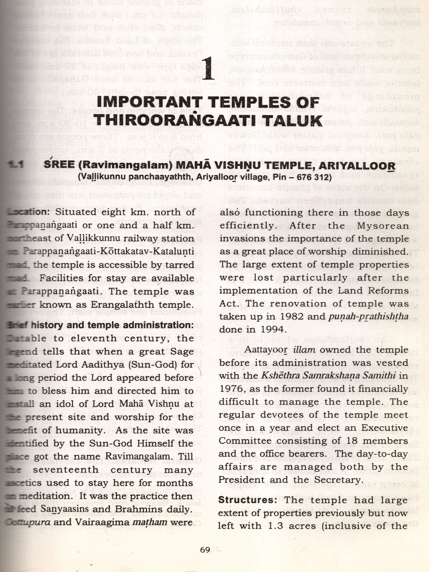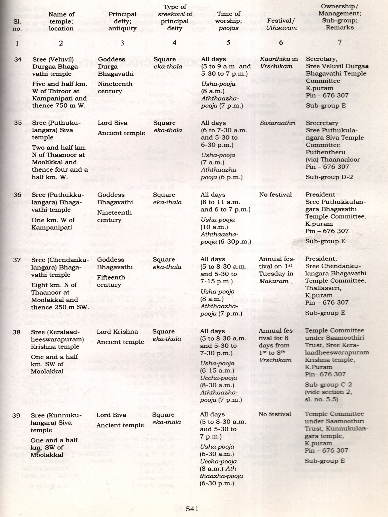 Further based on certain criteria ie., all the temples having swayambhoo (self-revealed) idols and other important temples depending on number of praakaaras, architectural excellence, number of poojas, antiquity and number of worshippers were selected for detailed study. It may be said that great care has been taken to include almost all important temples based on these criteria and the data so collected through a separate detailed schedule are presented in Section 2 (Salient features of important temples) of this monograph. This does not mean that other temples are unimportant. But the more prominent ones based on the above mentioned specified criteria were given due weightage. Section 1 gives an overall review and analysis on temples of Malappuram district with a backdrop on geographical setting, historical and other aspects.