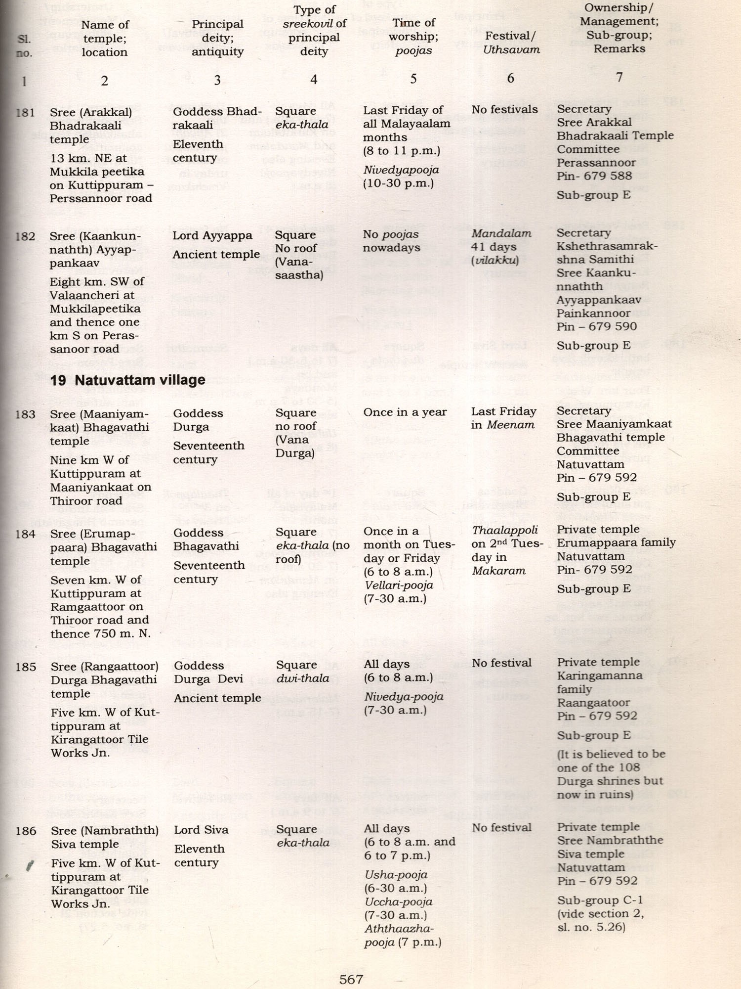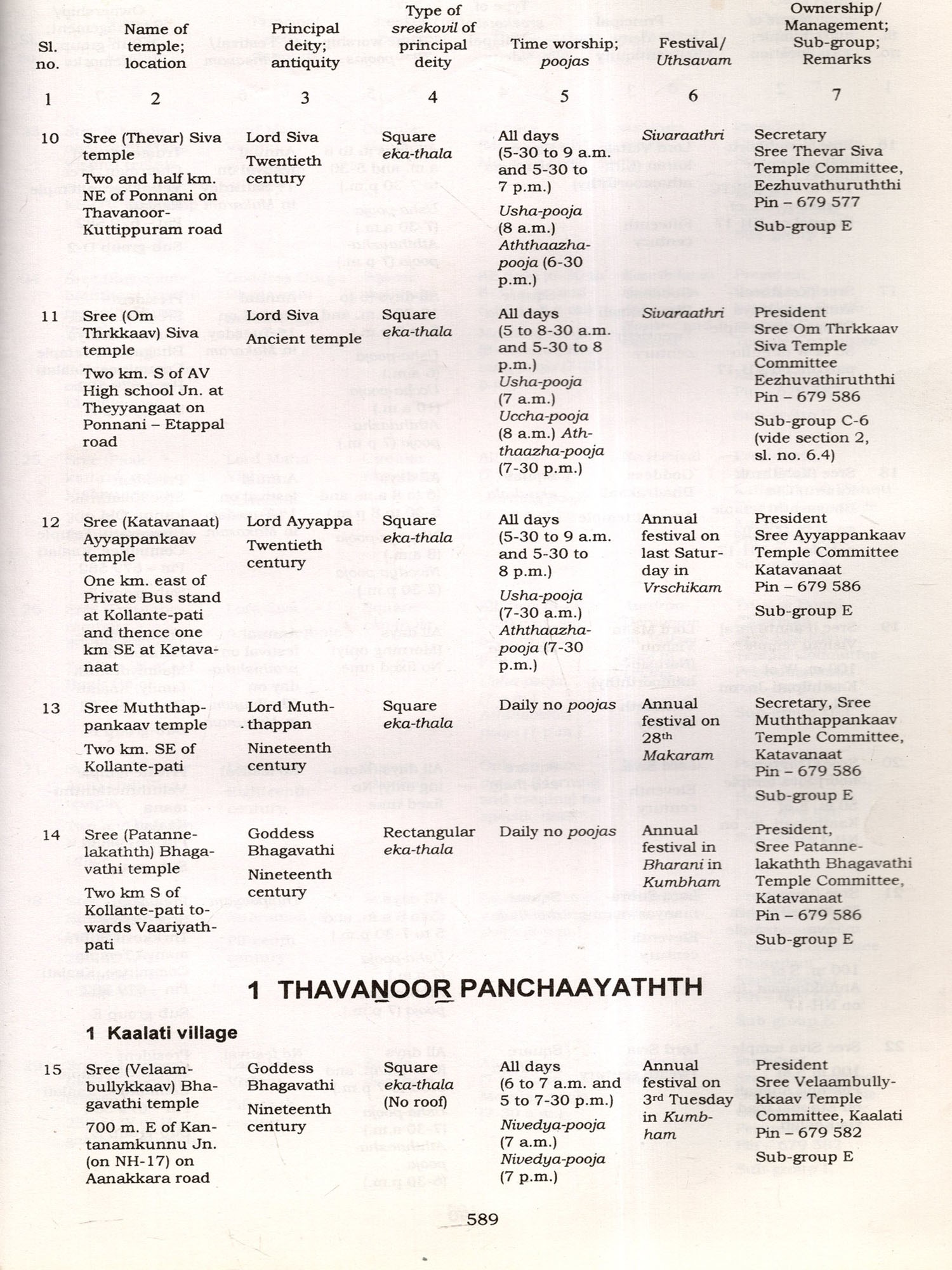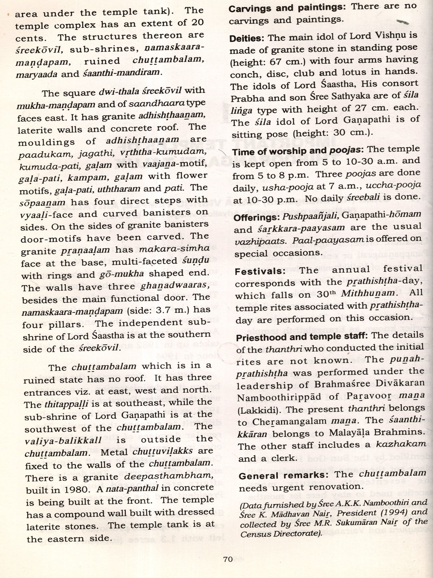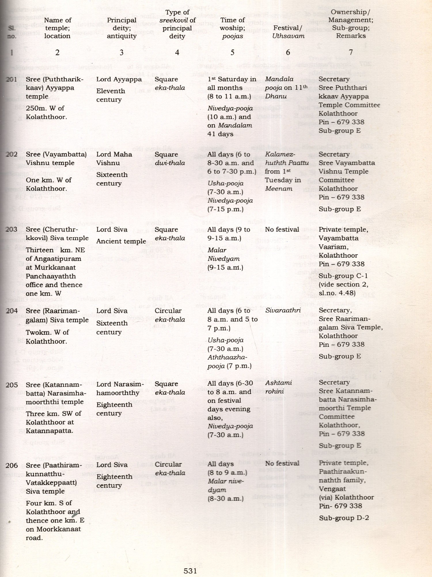 The procedure for the collection of data for the survey deserves special mention. The staff deputed for this study was directed to visit all panchaayathths, village offices and note down the names and location of all temples. They were then directed to visit all such temples located in every nook and corner of the panchaayathth, some of which situated even in dense forests and in areas inaccessible by roads, apart from making local enquiries on any possible omissions. These visits and enquiries helped them to prepare a Directory (presented as Section 3) of all temples open to public and collect data regarding the name, location, principal deity, antiquity, structural type of main śreekövil, time of worship and poojas, uthsavam/festival besides details on ownership/management.