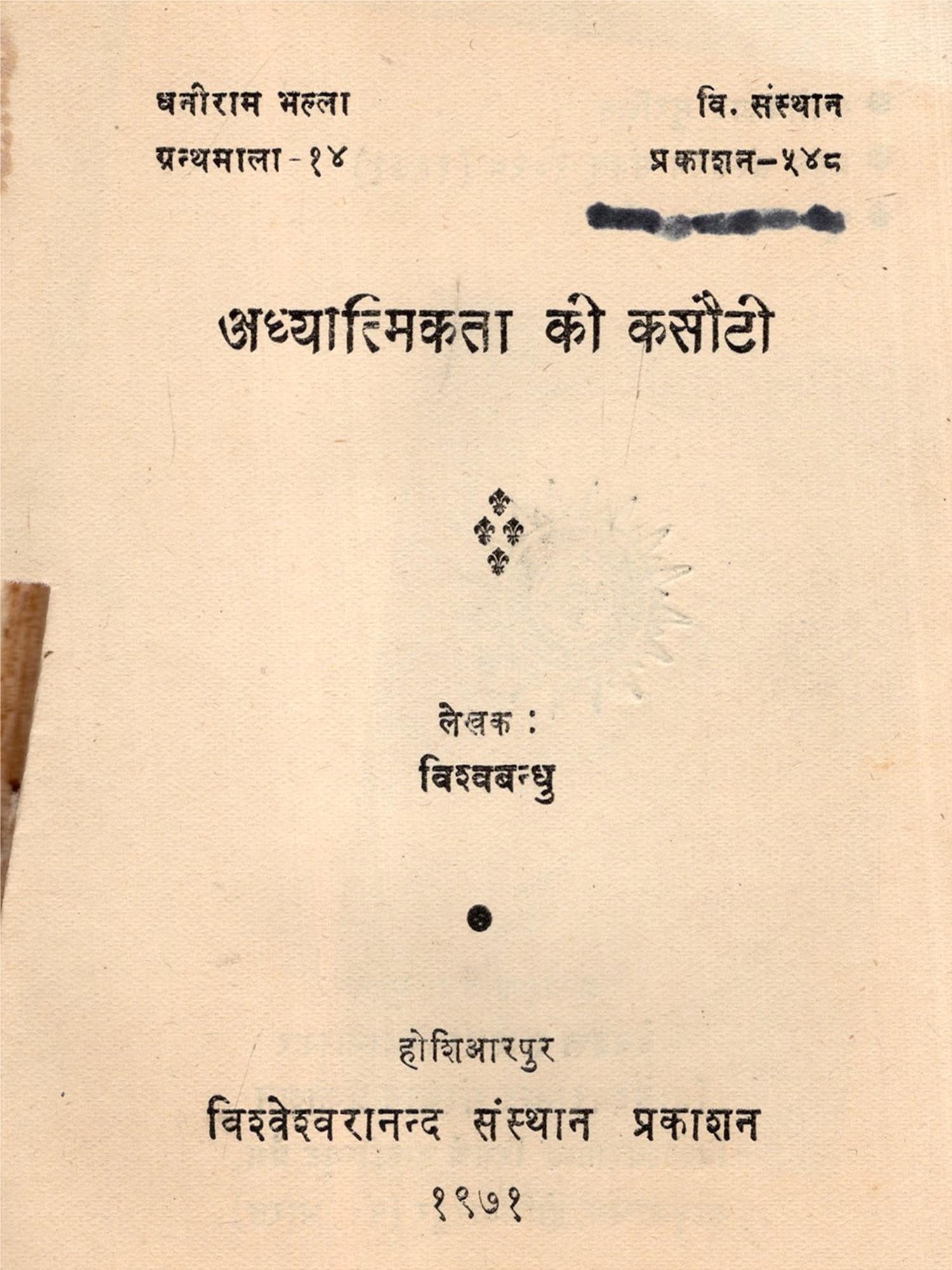स्वर्गीय भल्ला जी की पुण्य स्मृति में अप्रैल २६, १६५२ को उनकी दुबरसी के अवसर पर धनीराम भल्ला ग्रन्थमाला' का आरम्भ किया गया था। उस ग्रंथमाला का यह 'आध्यात्मिकता की कसौटी' चौदहवां पुष्प है।