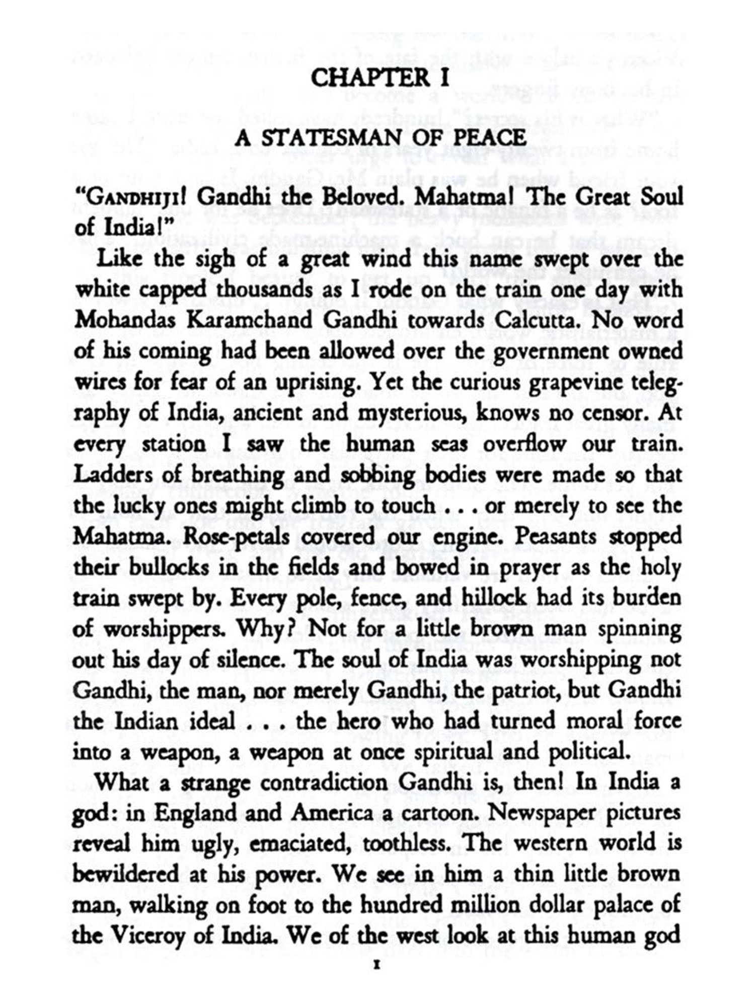 In presenting Indian problems as related to the Mahatma's life and work, I seek deliberately to view them through his eyes. Literature abounds giving the Anglo-Saxon bias, tone and argument. I try to turn us Anglo-Saxons around and reveal us to ourselves as the new, awakened, aggressive Indian patriots see us.