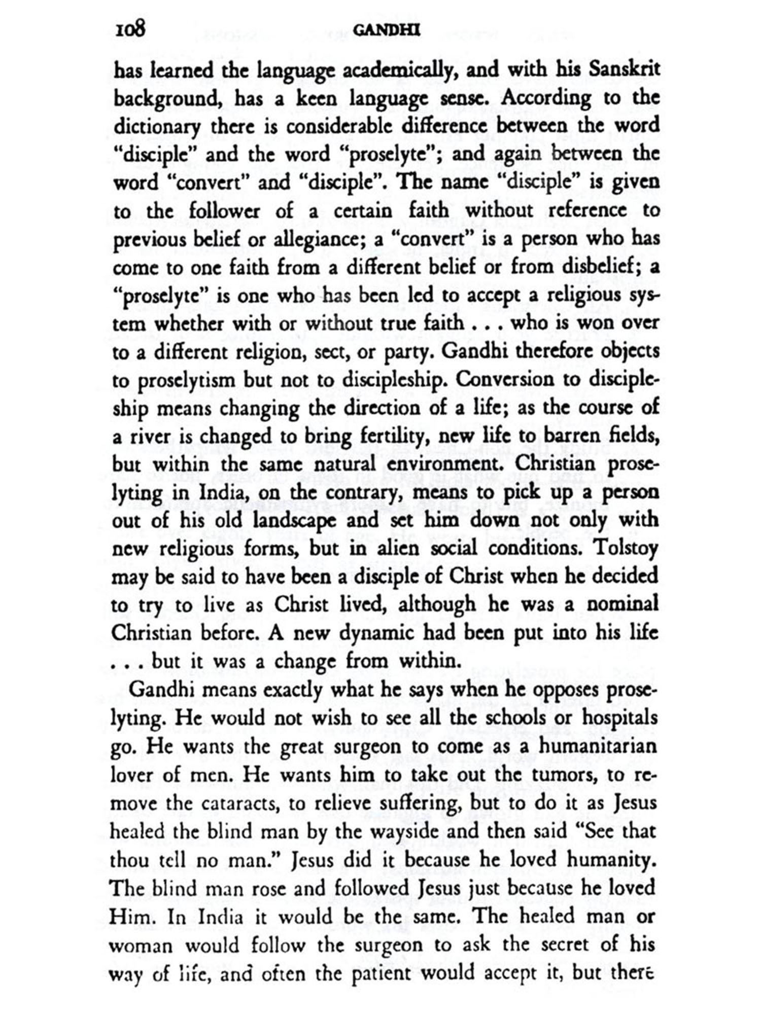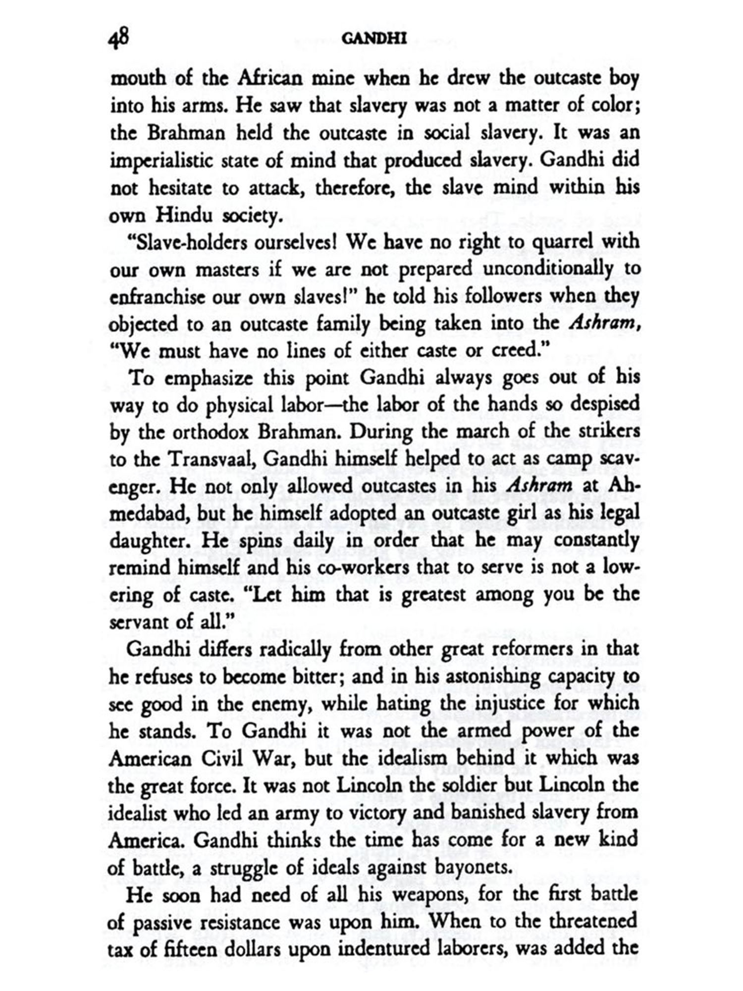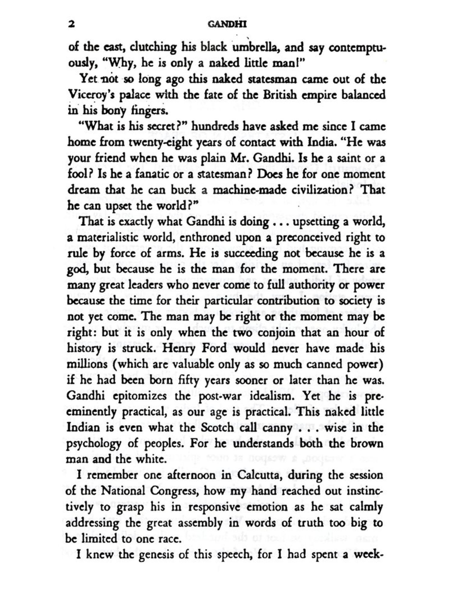 I use Mohandas Karamchand Gandhi as a telescope through which to view this balancing of forces because he is, without controversy, the outstanding personality of the new east. Without him, India, in fact the whole modern Orient, is like France without Napoleon, like America without Lincoln. I shall have failed in my purpose if I do not make you see behind the statesman, or politician, or ascetic, if you wish, Gandhi the man; the living, breathing, loving, serving, repenting, triumphant Gandhi, who is my friend.