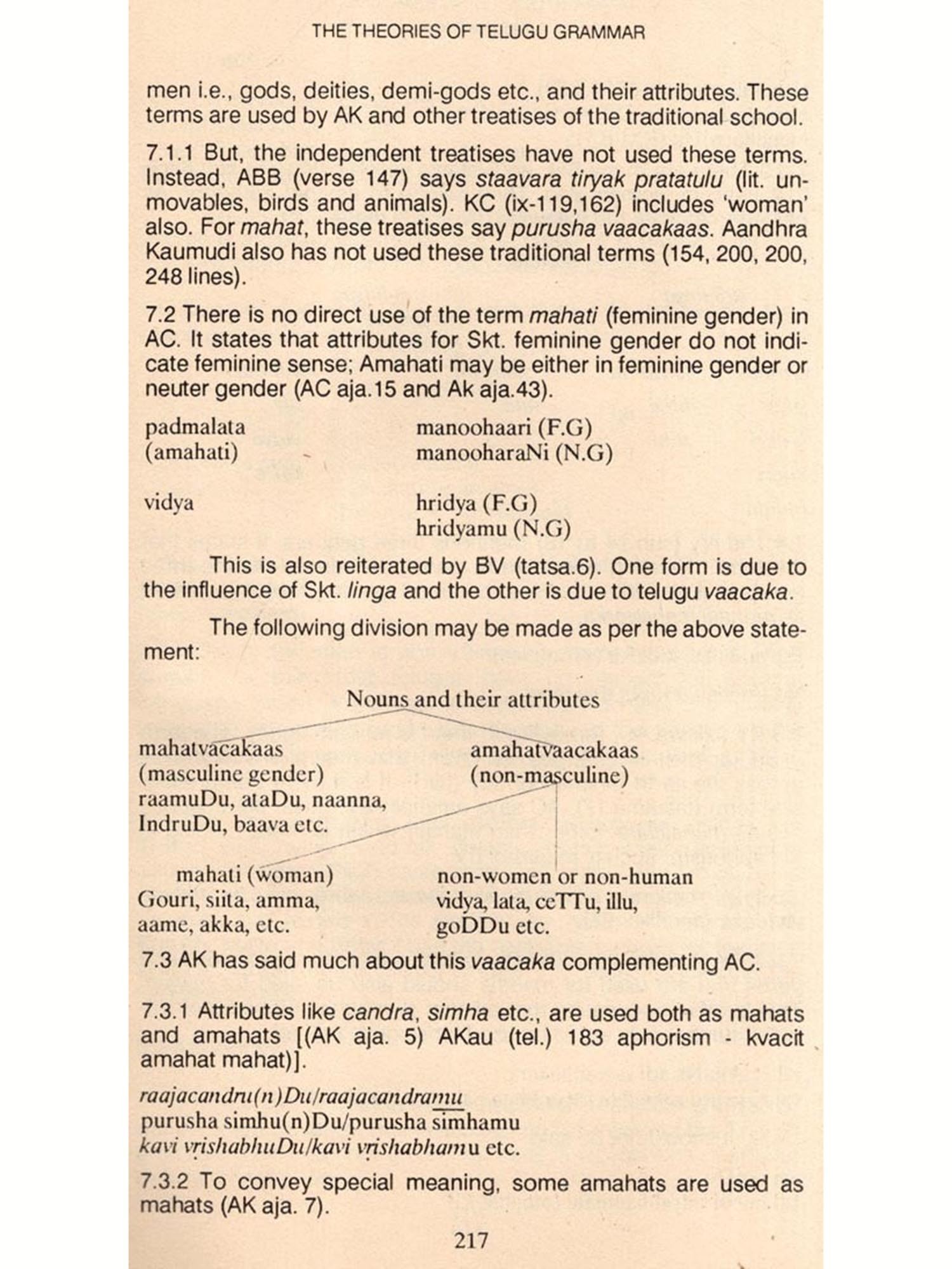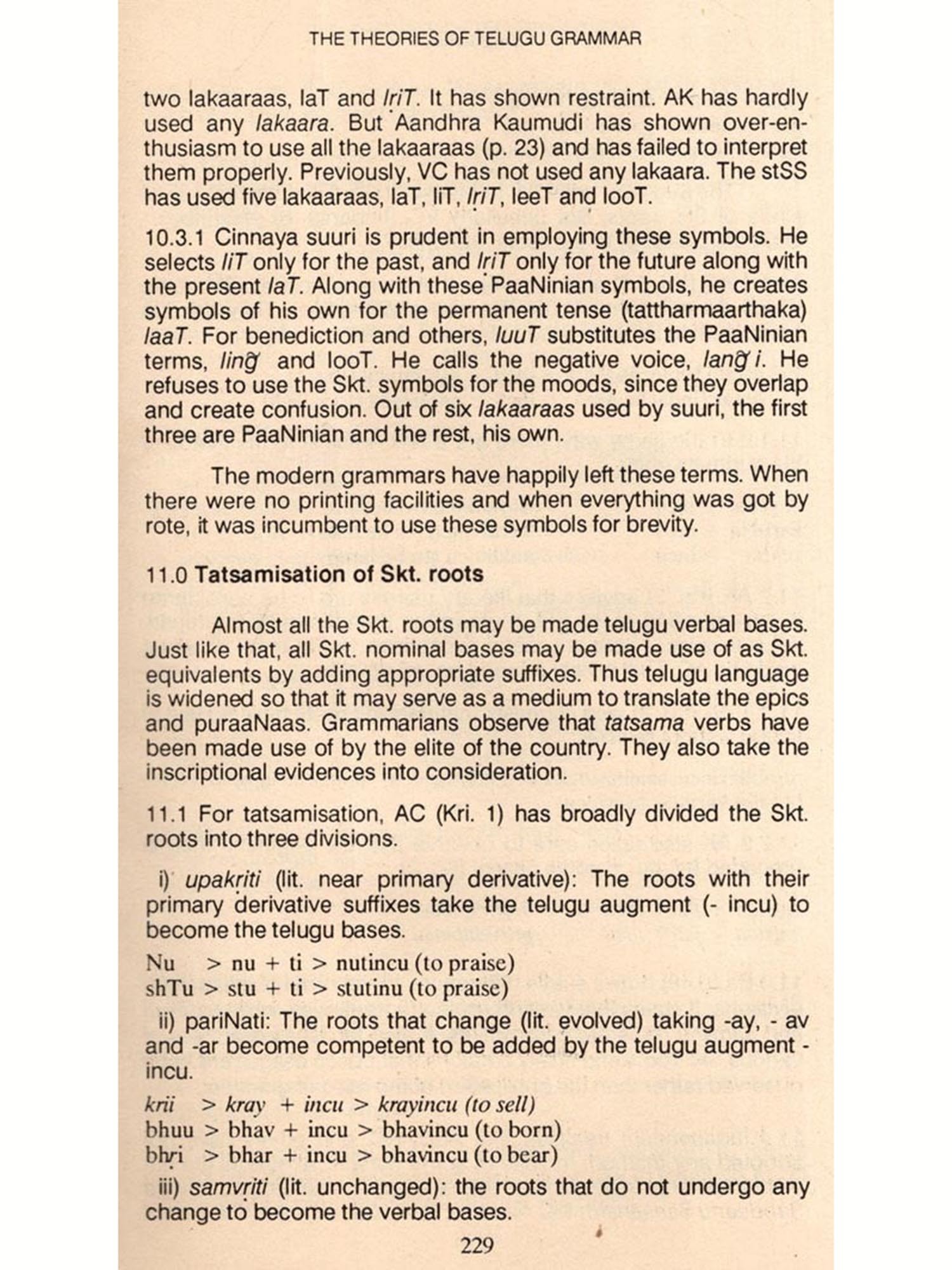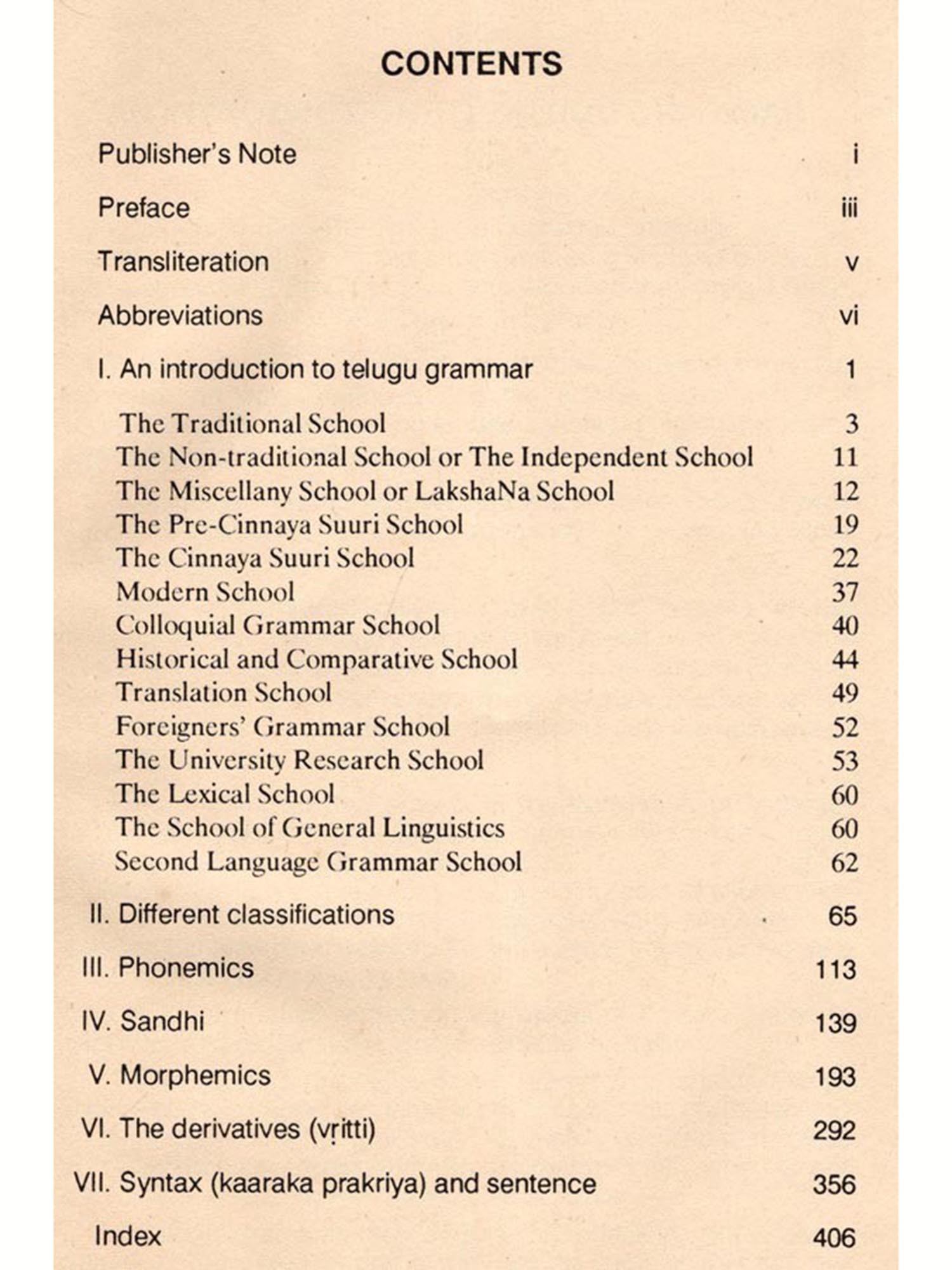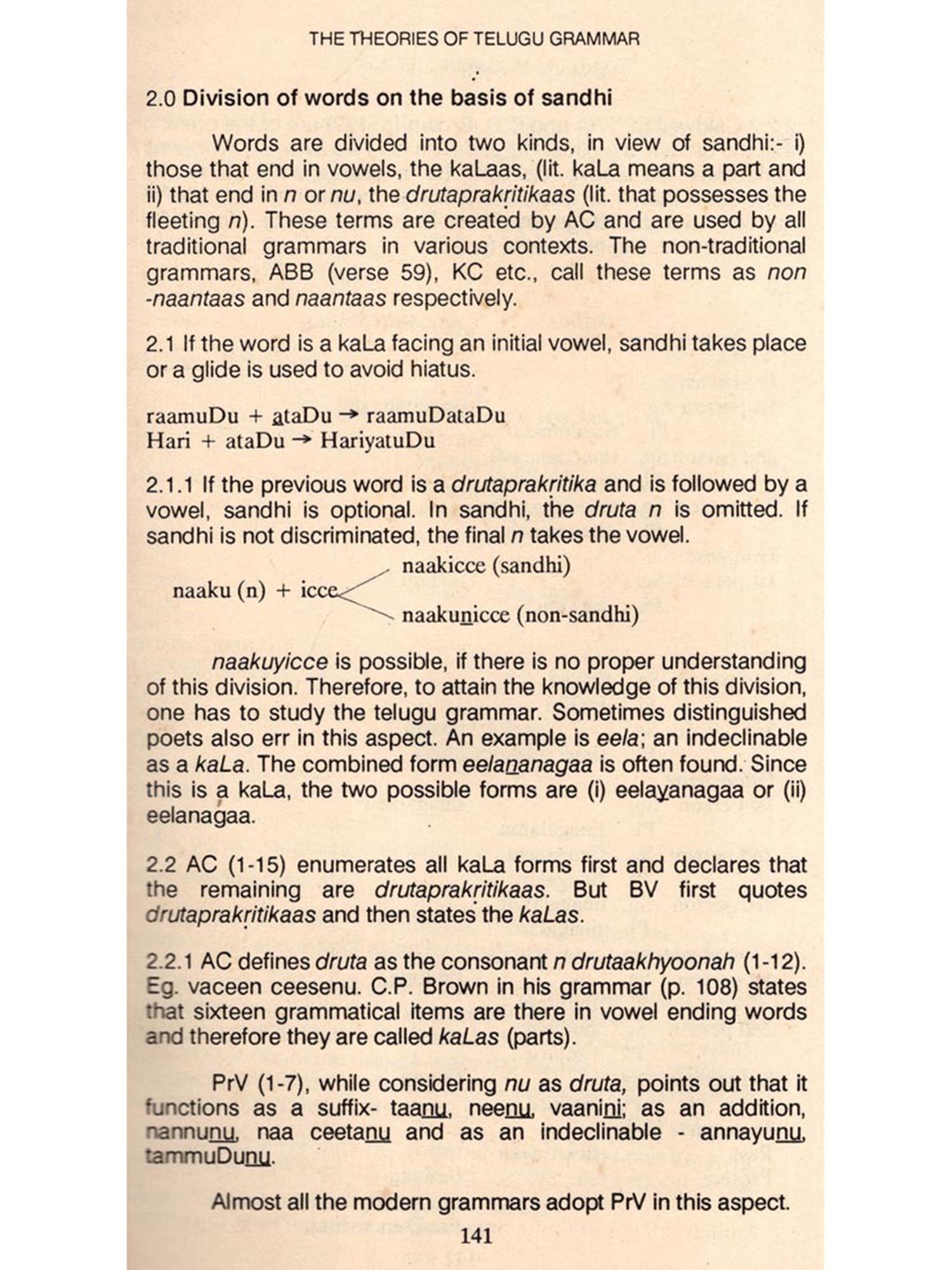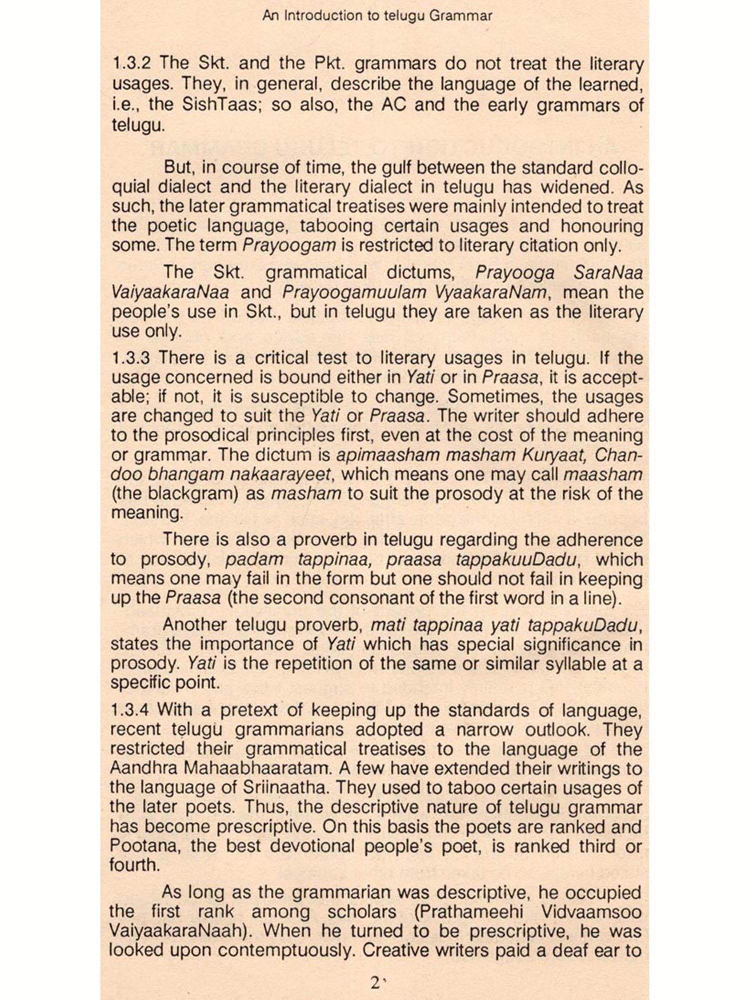 I do not prefer the term 'History' in the title of the work in cognizance of the never-ending disputes and arguments about the authorship and the age of the first two ancient grammatical treatises written in Sanskrit verse. These are descriptive gram-mars and the authorship and age are of little value. I have there-fore tried to interpret them, Schools of telugu Grammar, such as traditional, non traditional, mixed-traditional, modern, historical etc., on the basis of their approaches and treatments.