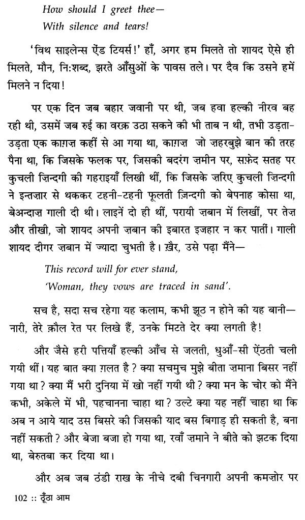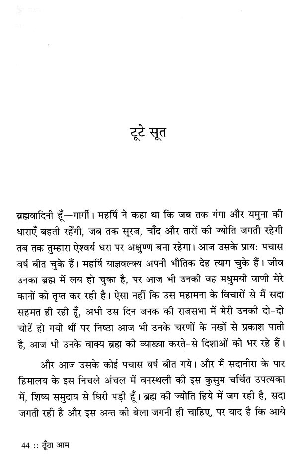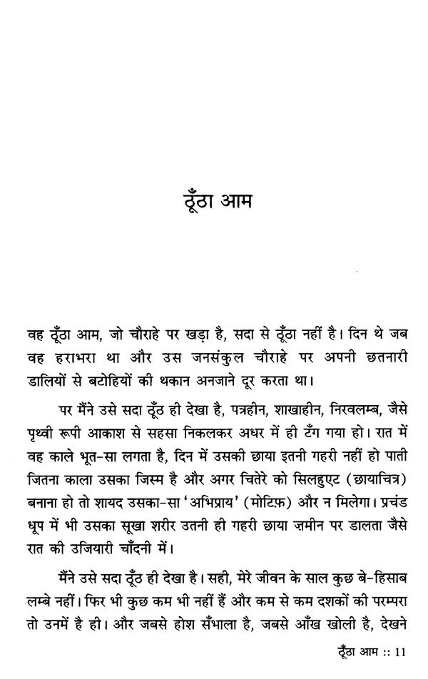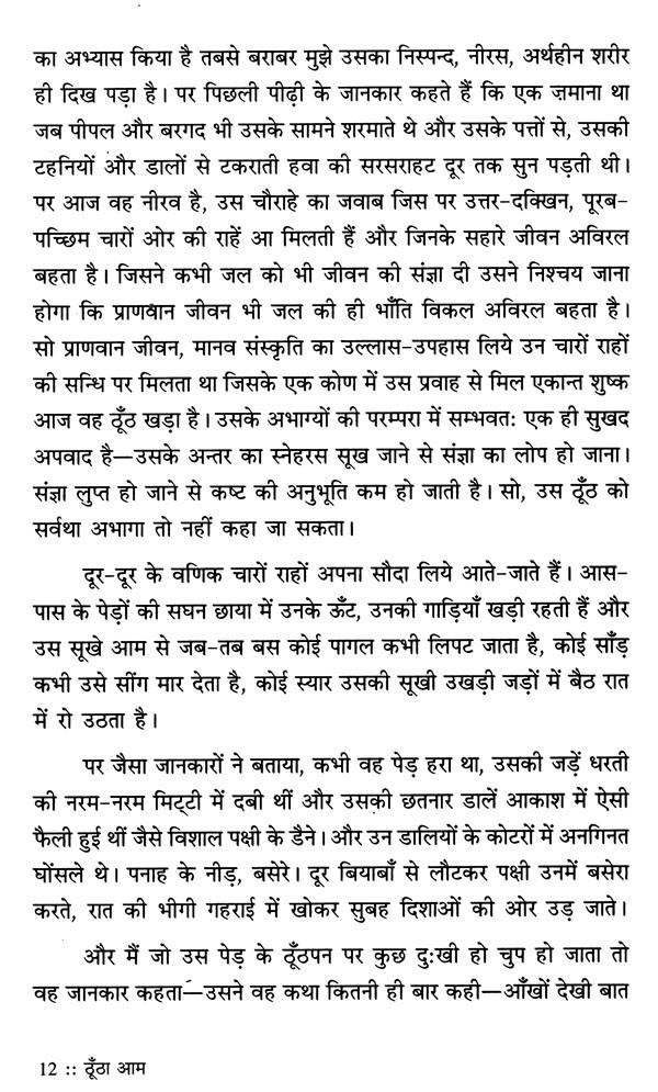 भारतीय सभ्यता, संस्कृति और समाज को प्रभावित करनेवाले कारकों का क्रिटीक है 'दूँठा आम'। कृतिकार भगवतशरण उपध्याय भारतीय गौरव के गुणगायक रहे हैं। उन्होंने अपने लेखन में विविध भंगिमाएँ अपनाकर भारतीय परम्परा को प्रतिष्ठित किया है। यह एक ऐसा विषय है जिसके निर्वाह में अति बौद्धिकता की शुष्कता आ जाने का खतरा मँडराता रहता है लेकिन भगवत जी एक ऐसी मनोरंजक भाषा और शिल्प का चुनाव करते हैं जिसमें विषय की गम्भीरता भी सर्वथा सुरक्षित रहती है। पौराणिक से ऐतिहासिक, साहित्यिक से सड़क छाप और पुरातात्त्विक से अनागत क्षेत्रों तक वे इस सहजता से यात्रा करते हैं कि भाषा और दृश्यों का एक विशिष्ट रूप निर्मित हो जाता है। बारह शीर्षकों में विभाजित इस संकलन में तत्कालीन अनेक विषयों पर स्केच और रिपोर्ताज हैं, किन्तु इन सभी का केन्द्रीय भाव भारतीय समय और समाज का विमर्श ही है जो आज भी अपनी प्रासंगिकता के साथ महत्त्वपूर्ण है। पाठकों के विशेष आग्रह पर एक लम्बे अन्तराल के बाद प्रस्तुत है पुनर्नवा श्रृंखला के अन्तर्गत इस बहुचर्चित पुस्तक का नया संस्करण, नये रूपाकार में।