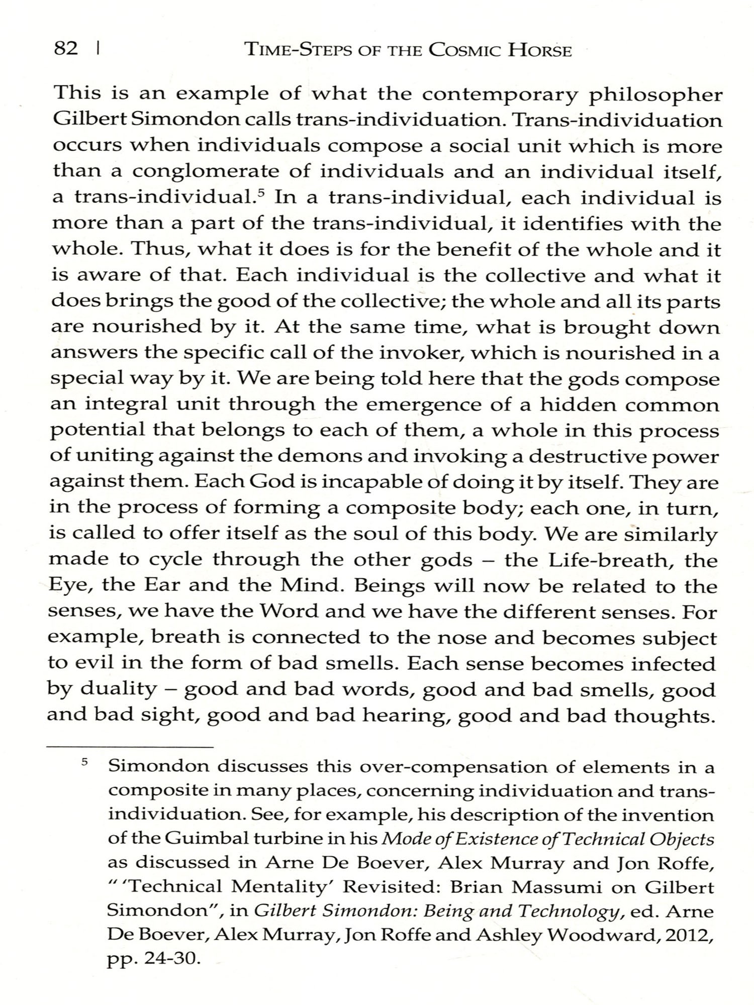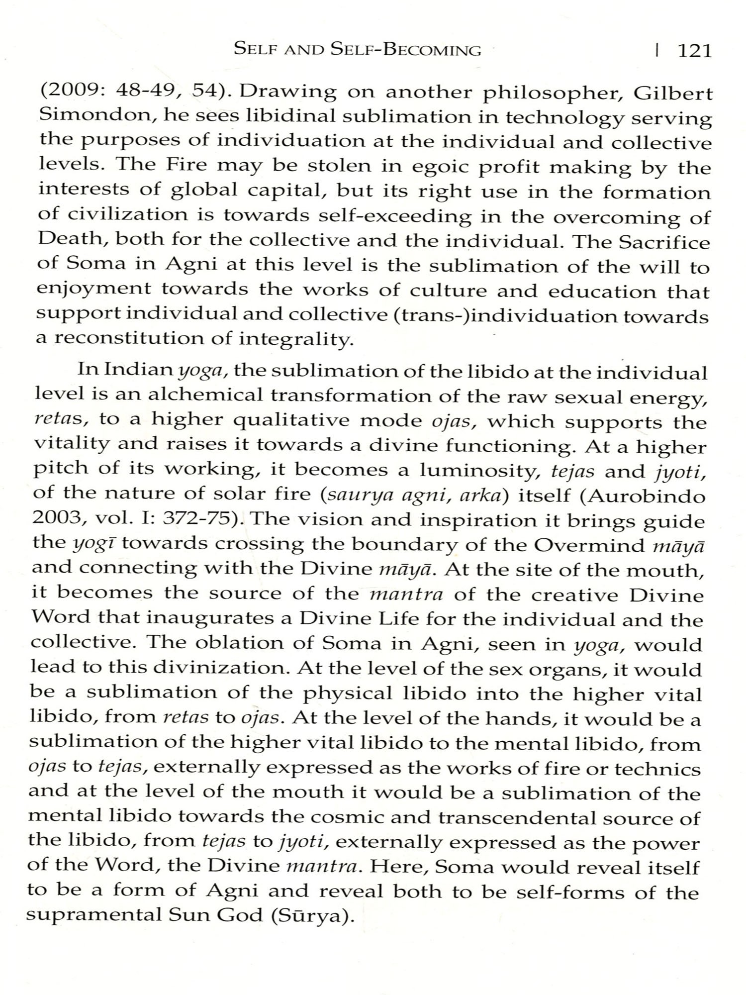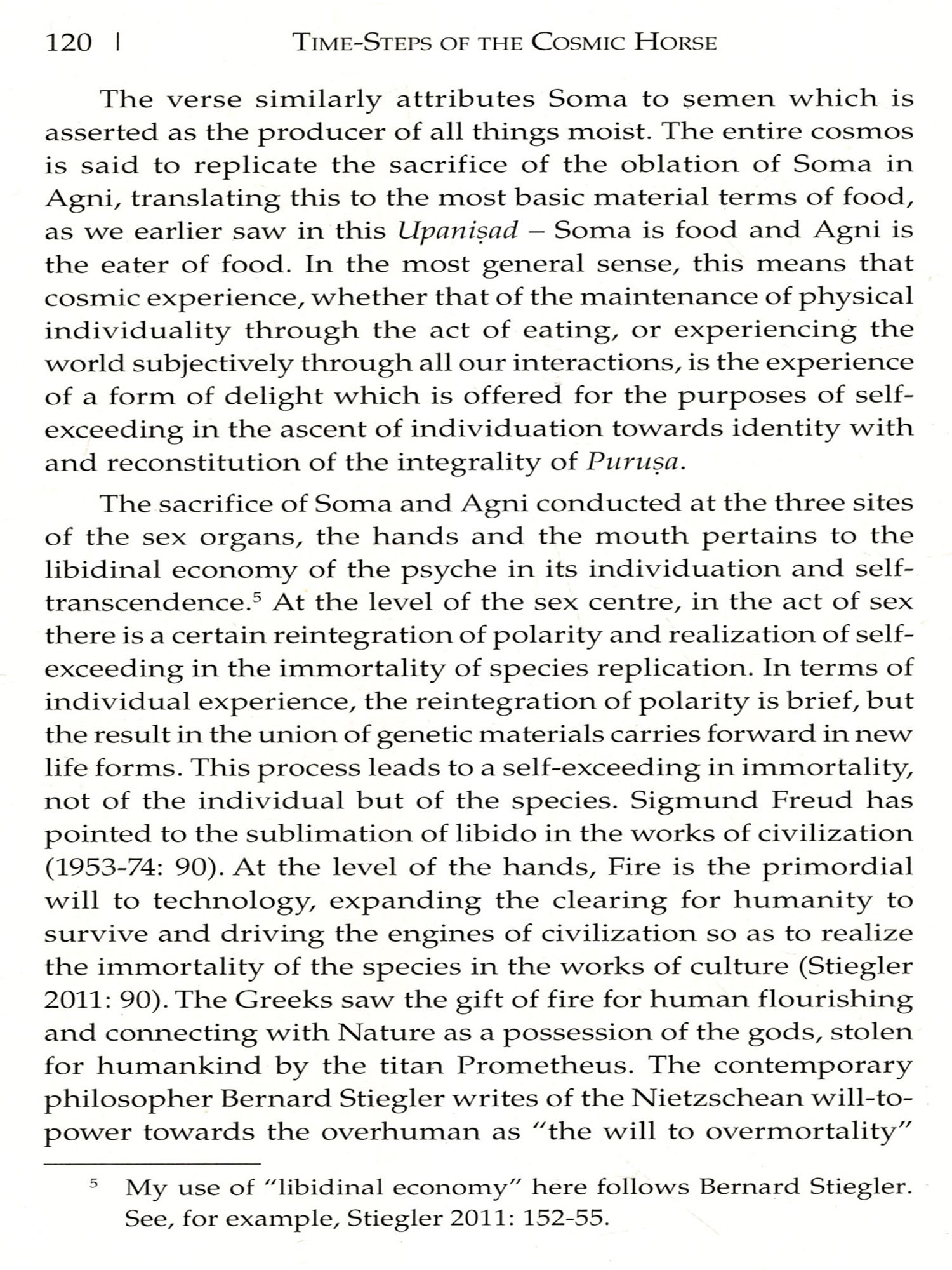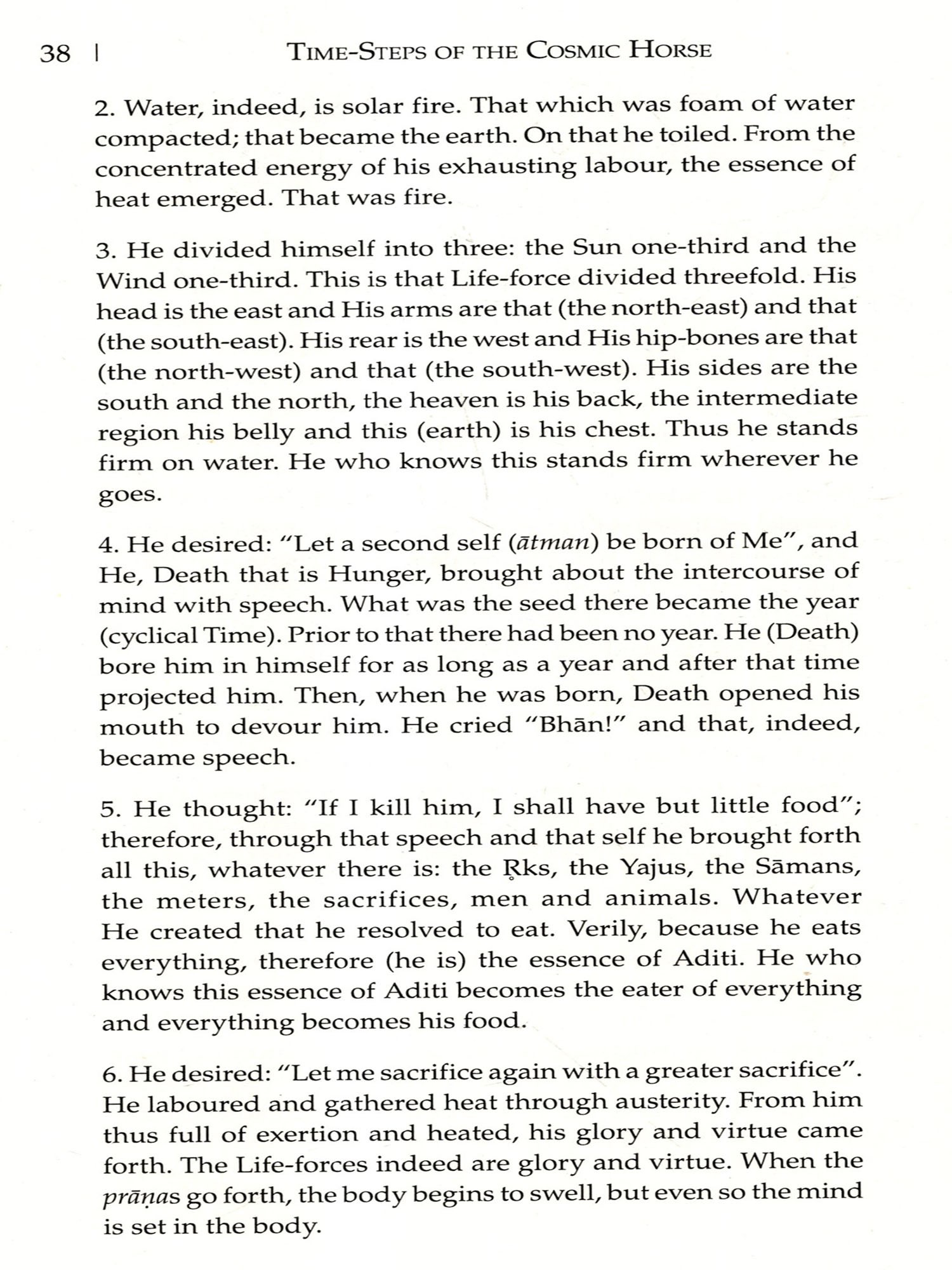 I CAME across Sri Aurobindo's translations and interpretations of the Upanisads in the 1970s, at a time when counterculture was "blowing in the wind" and the established and predictable answers to living had lost their taste. Not that these texts drew my attention sufficiently for me to delve into them at this time, but my contact with them was coloured by a freshness, not the deadweight of canonical literature. My own dissatisfaction with the expectations of life in which I found myself amplified by the mood of the time made me receptive to the creative power of Sri Aurobindo's translations and commentaries, even though I merely browsed these writings. The description of the sacrificial horse with which the Brhadaranyaka Upanisad begins made a particularly strong impact on me, a surreal and cosmic description that immediately expanded one's horizons. Within this remarkable description, there was a line that stopped the mind in its tracks with its unexpected implications: Time is the self of the horse sacrificial (BU 1.1.1, in Aurobindo 2001: 268) - a line that left a seed waiting to germinate. To the static image of a cosmic Being it bestowed a soul of Becoming, the time-steps of freedom and unpredictable change. In retrospect I realized how fortuitous this was, since had I encountered instead the more common translation of this line by established scholars such as Radhakrishnan (1968: 149) or more recently, Olivelle, (1998: 37) "The year is the body of the sacrificial horse", the wooden animal would have never left its musty stable in my mind.