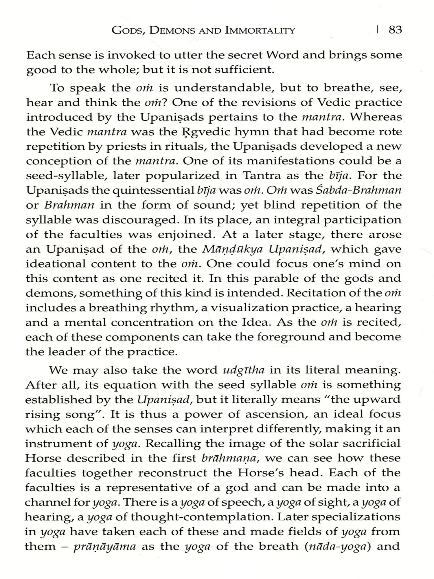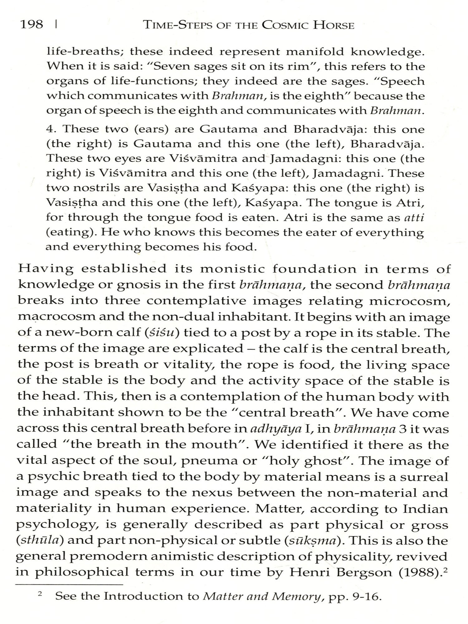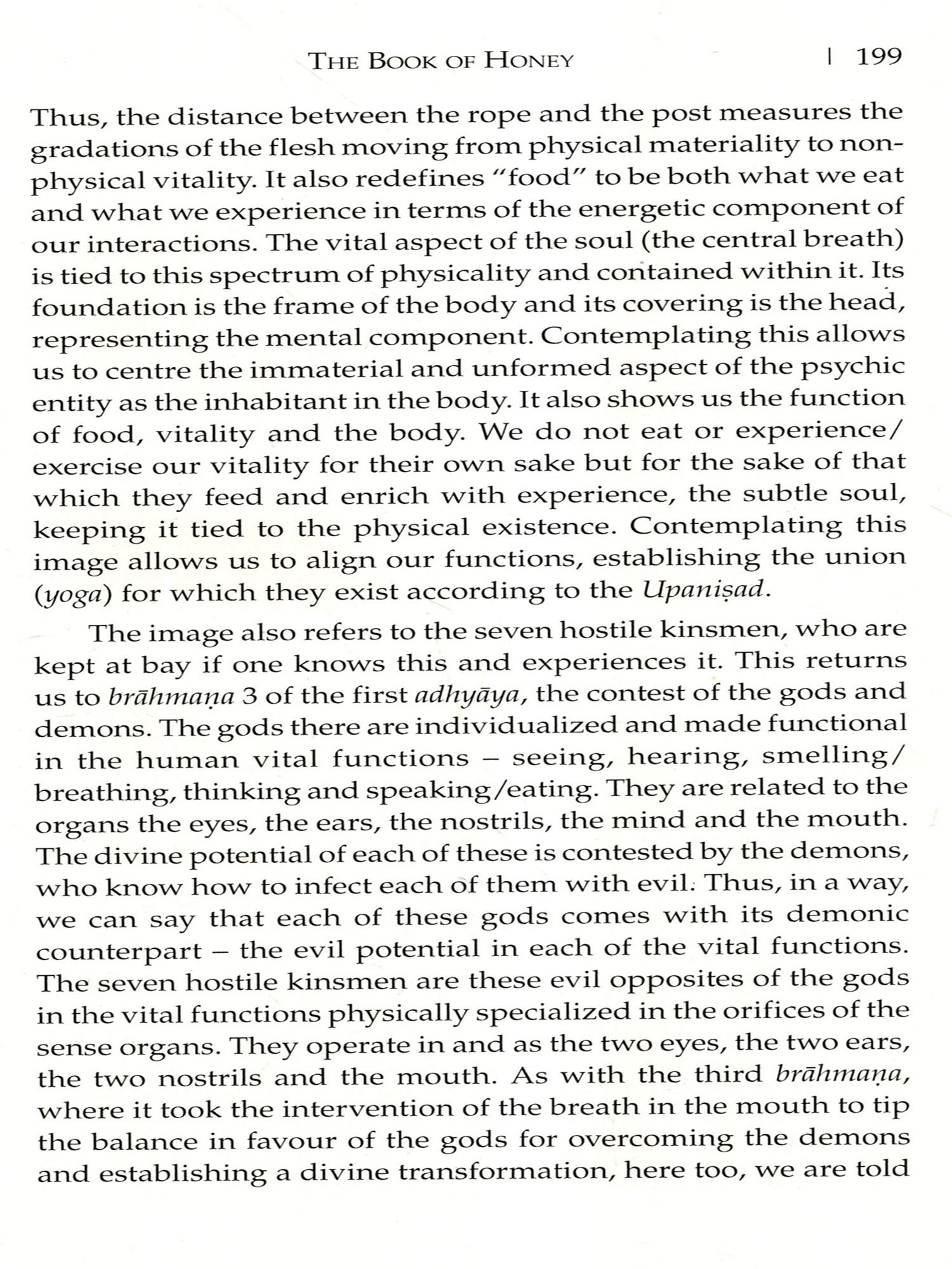 The Brhadaranyaka Upanisad is divided into six chapters (adhyayas), which are grouped in three volumes (kandas) - Madhu Kanda (volume of honey), Muni Kanda (volume of the ascetic) and Khila Kanda (supplementary volume/appendix). Honey in the Veda (see RV 1.90) and early Upanisads (BU II.5) is a synonym for bliss. The fifth section (brahmana) of the second adhyaya of the Brhadaranyaka Upanisad is a paean to bliss as the essence of macrocosmos and microcosmos, ending with the self (Atman) as the source of both. Muni Kanda, sometimes called Yajnavalkya Kanda, consists mostly of the interactions of Yajnavalkya with King Janaka and the advisors of his court, debating matters of conventional knowledge with unconventional twists, not without humour and sometimes with lethal consequences. The term muni, related to mauna, which means self-imposed silence, refers to one who practises asceticism. Both madhu and muni are terms related to the forest or wilderness and highlight the kinship of the Upanisad and its eponymous description to the forest. The Madhu Kanda consists of two Brahmanas, the first set in cosmological space-time and the second set in a liminal space-time between domesticity and renunciation. The present text deals with the Madhu Kanda, which distills the mystic and contemplative philosophy of the Upanisad. The Muni Kanda, dealing with the colloquies of Yajnavalkya, is set in the courtly space-time of the polis, but as evident in the title, this is also a liminal courtly setting, visited by the figure of a muni who transits between and is equally at home in the court and the forest. The Vedas (literally, Knowledge) are considered to be four in number, Rg, Yajus, Sama and Atharva and each of these is divided into four classes of texts, the Samhitas, Brahmanas, Aranyakas and Upanisads. The Samhitas constitute hymns or poems addressed to a variety of gods, the Brahmanas include mythological passages and ritual instructions, the Aranyakas dwell on symbolic explanations and the Upanisads deal with proto-philosophical interpretations. Taken as a single body of Vedic literature, these divisions have been related to the four stages of Hindu life (asrama dharma), the Samhitas meant for the student stage (brahmacarya), the Brahmaņas for the householder (grhasthya), the Aranyakas for those leaving social life (sarhsara) to retreat to the forest (vänaprastha) and the Upanisads for renouncers of samsara (samnyasa).
