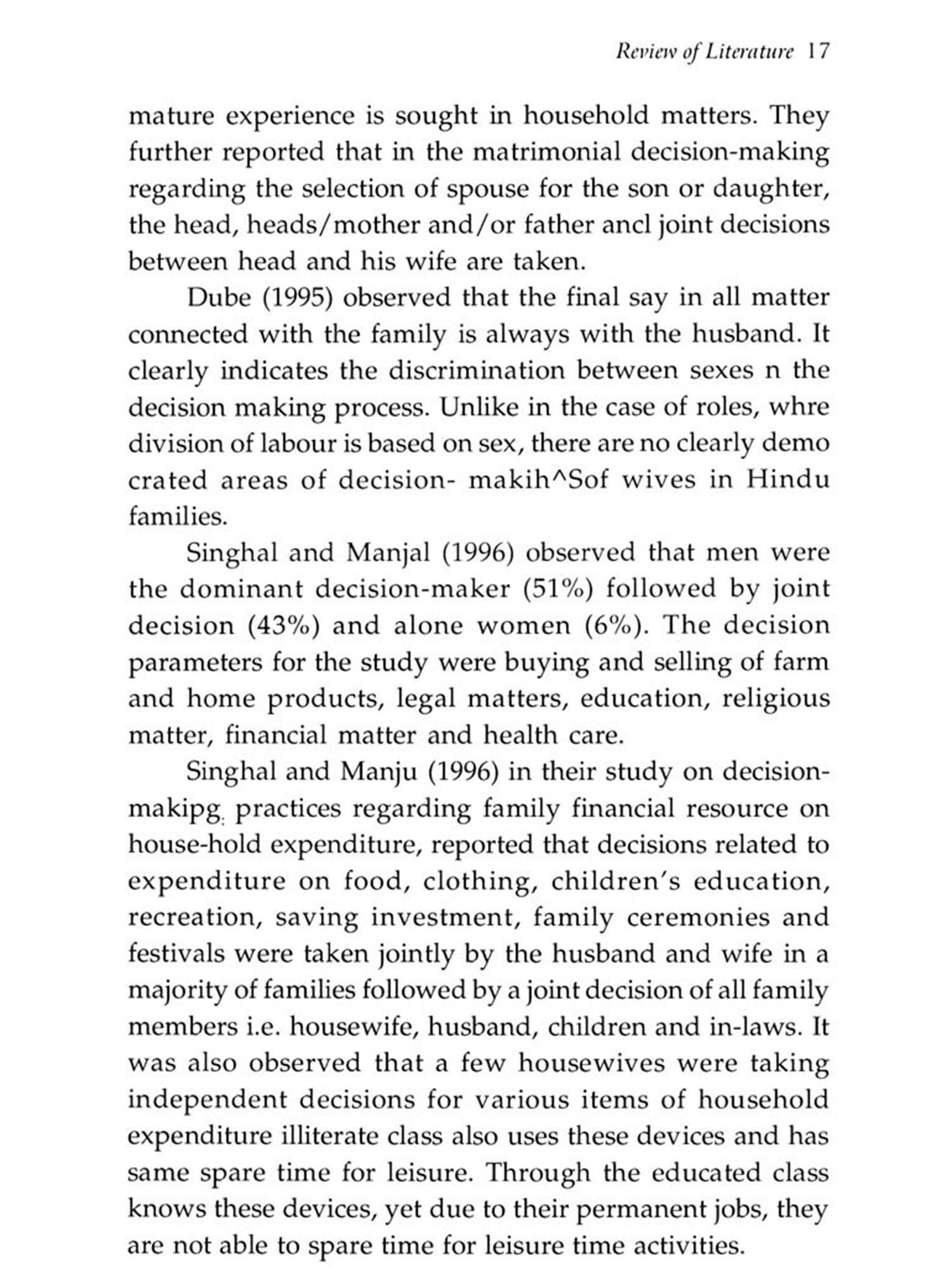 Home management is the means of using resources for the attainment of family goals. As the management of resources available for family use proceeds through its sequence of managerial activities or steps-planning, organizing, controlling and evaluating. One must choose between desires and attainments and the number of choices may be multitudinals. At each step, home-maker must face problems and situations that call for decisions. Decision-making is important in home management, because it is the way one makes things happen instead of just letting them happen. Each day brings numerous problems that require conscious decision making. For some time writer on the family and those engaged in home management research have been concerned with the question of who makes decisions in the family. Investigative reports suggest that women appeared to be most active in home management and men in money management.
