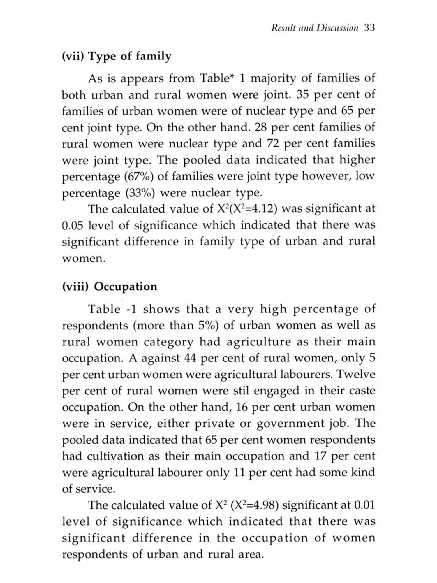 A women plays multifarious socio-economic roles inside as well as outside the home women work harder than men in rural society. They are not only homemakers but also food-providers, baring land preparation, irrigation and plant protection, they do all the form jobs and are entirely incharge of kitchen gardening and animal keeping. Their involvement in agriculture is 80 percent. Men, however, attend to 61 percent of the animal husbandary work-women share abundant responsibilities and perform a wide spectrum of duties in running the household and the family like child care collection of fodder and fuel, cooking, working and sowing as well as attending the farm activities, daily, animal husbandary and extending a helping hand in artisanship and handicrafts.