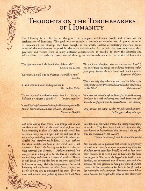 For years, I have collected documents and images on the outstanding figures of various religions and spiritual paths. Towards the end of the 20th century, countless volumes were published on the lives and works of great spiritual figures all over the world, yet there was no book on my shelf that featured all the great masters and saints of the various religions. I searched for this book in the spiritual bookshops of India and Germany and the various Catholic and Orthodox devotional stores across the globe, yet to no avail. The books and encyclopedias on the religions of the world (including the works of Helmuth von Glasenapp or Lajos Szimonidesz) were not focused on the lives on the great figures of spiritual life. All the great religions have their own collections and encyclopedias featuring their own saints yet there was no single, joint volume of the great figures of all the various religions. This marked the beginning of my work as I set our to collect images of the various saints and masters and compile them in a single volume entitled Spiritual Gallery. This work later extended to collecting various quotes and biographical details of these great figures. This process led to the creation of the encyclopedia later named the Torchbearers of Humanity, which was supported by a growing number of assistants. It soon became clear that the task far exceeded my personal passion for collecting such derails.