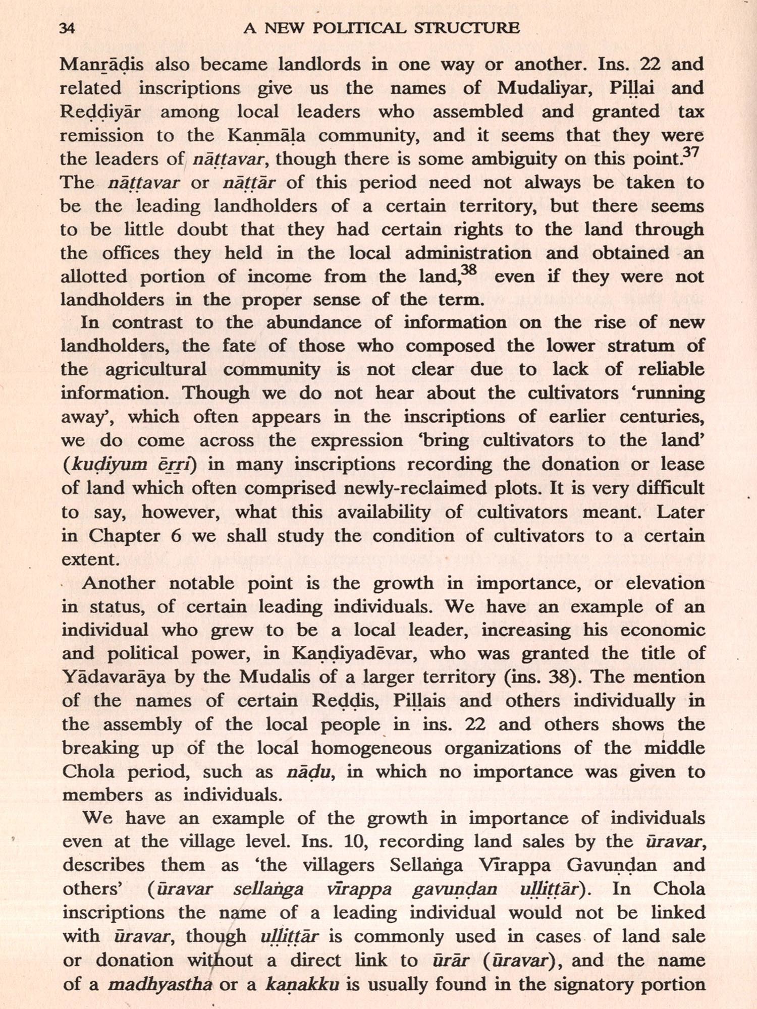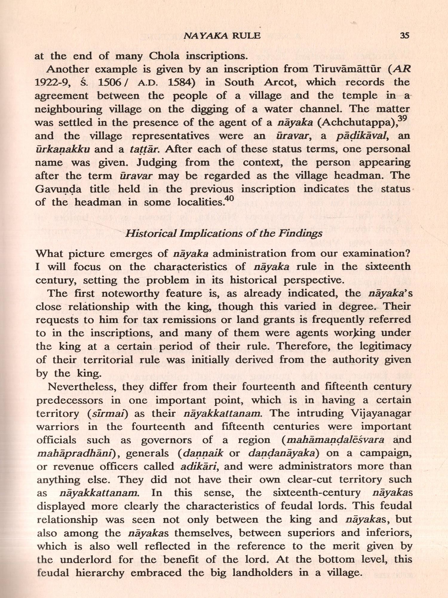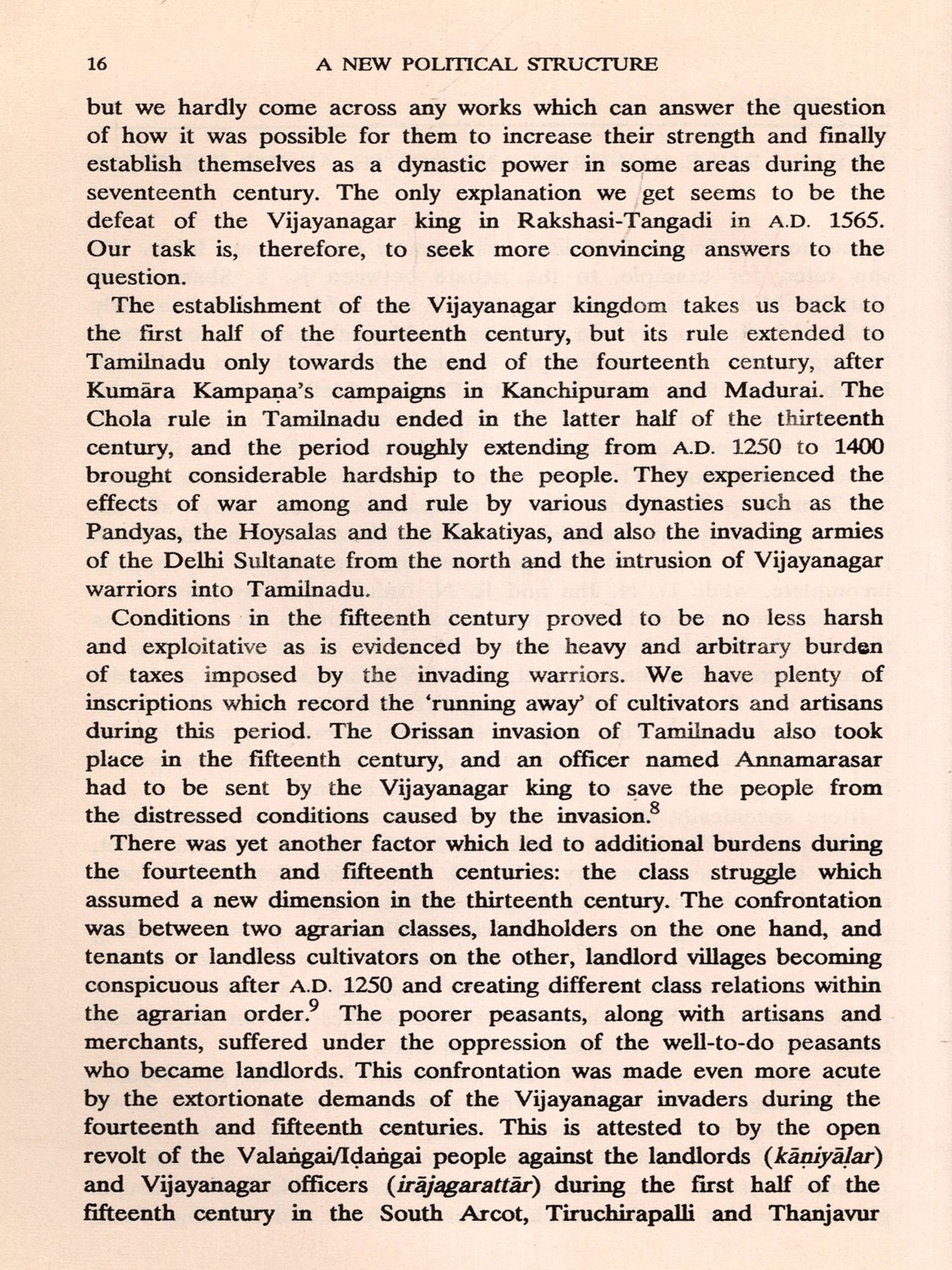 In my South Indian History and Society, a collection of thirteen papers, I discussed the socio-economic changes that could be identified during the Chola period. I argued that private landholdings were common at the last stage of Chola rule in contrast with the apparent prevalence of communal landholdings in the earlier stages. The emergence of big landholders towards the end of Chola rule was also pointed out. Though the main focus was on Chola society, one chapter related to a problem of the Vijayanagar period and in the introduction I suggested the emergence of a new social formation in the Tamil country during the Vijayanagar period.