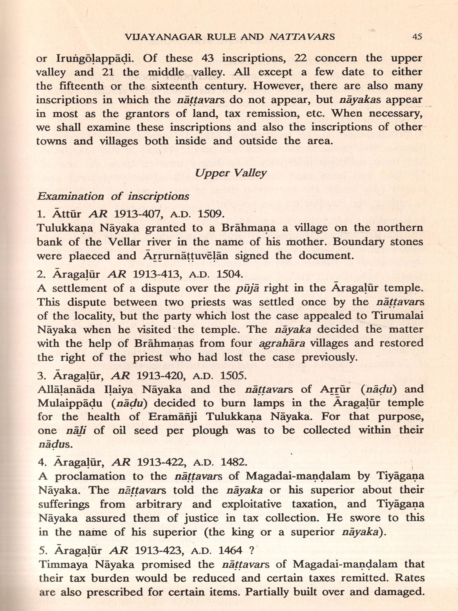 Part Two, entitled 'Socio-economic Development under Vijayanagar Rule', contains five chapters which examine the socio-economic conditions in northern and central Tamilnadu during the Vijayanagar period. They focus on the conditions of the producers who rose in open revolt in 1429 against the Vijayanagar government and the landholders; and the encouragement given to artisans and merchants by nayakas during the sixteenth century. Chapter 6 discusses the loss of land and power by Brahmanas who had flourished during the Chola period and the emergence during the fourteenth and fifteenth centuries of non-Brahmanas as local magnates holding such titles as arayan, udaiyan, etc. It also discusses the condition of agriculture: local magnates seem to have employed adimais (slaves) for cultivation of their estates, but slavery does not seem to have been a basic relation of production, and kudis as occupant cultivators seem to have been the mainstay of cultivation during the Vijayanagar period.