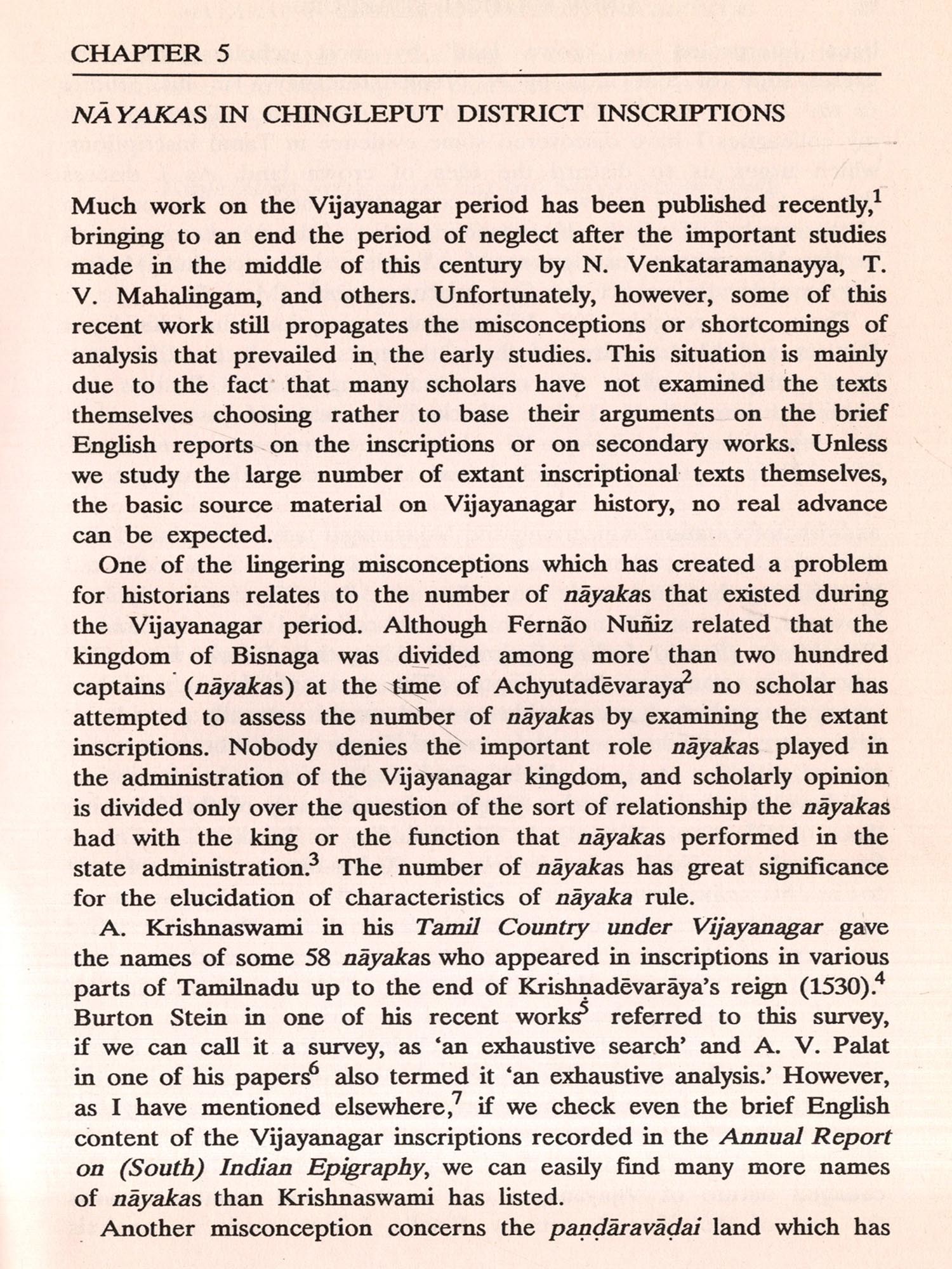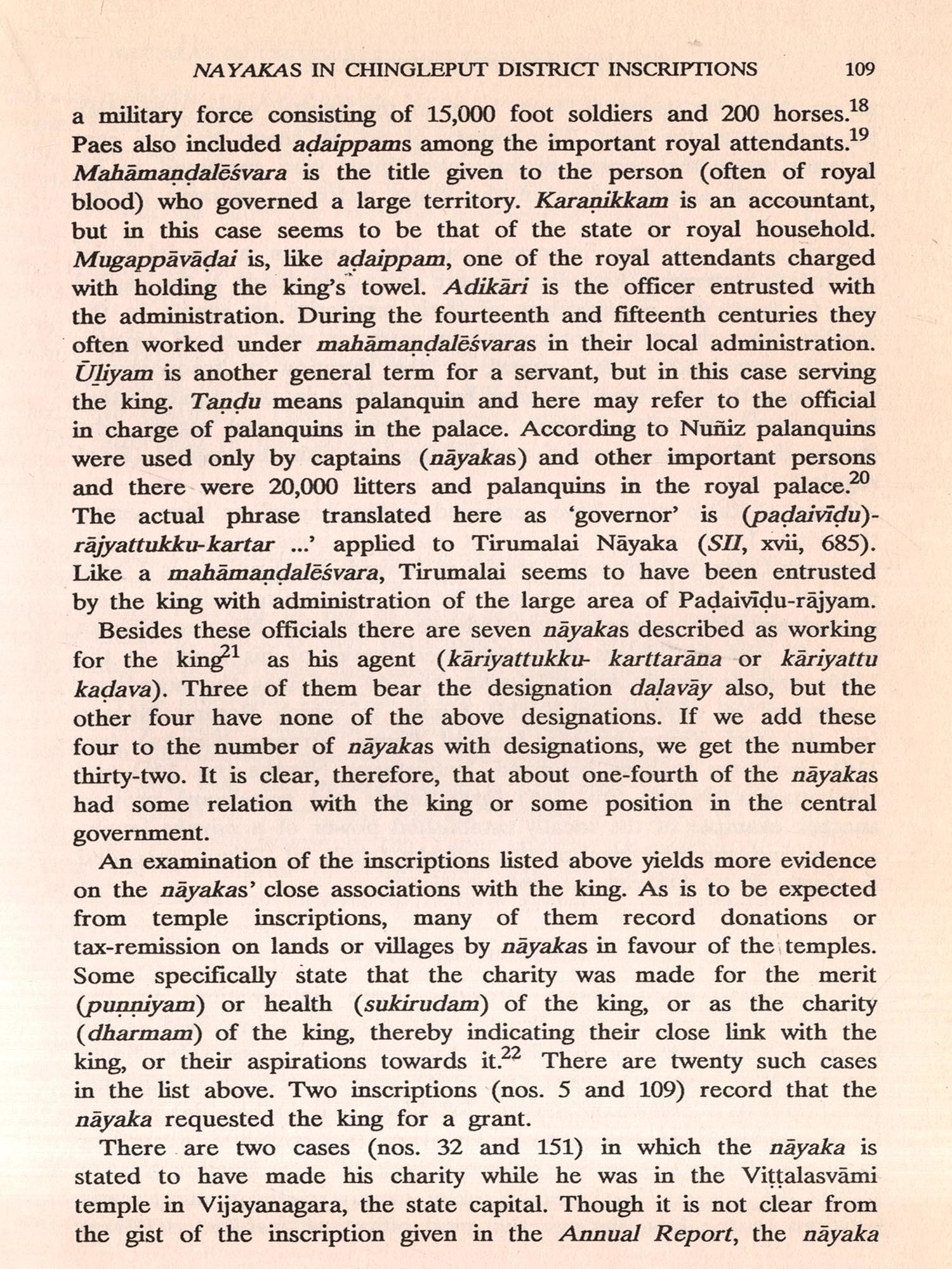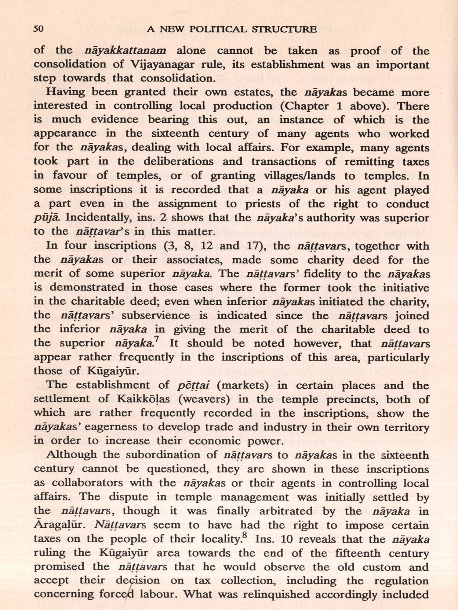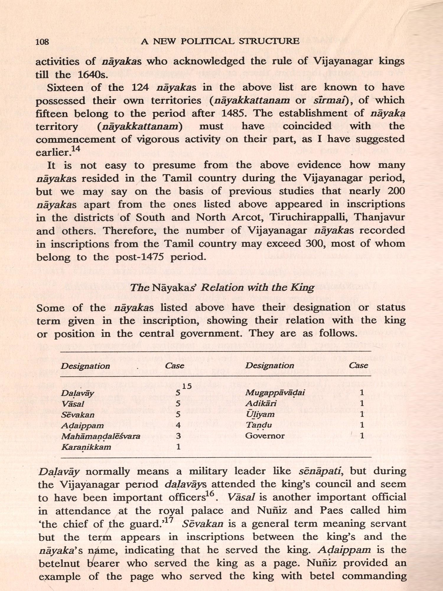 Chapter 5 examines the number of individual nayakas appearing in Chingleput District inscriptions. Of 124 nayakas, 118 belonged to the post-1475 period, which reinforces the conclusion mentioned above, that the nayaka system was established only towards the end of the fifteenth century. One-fourth of the 124 nayakas either served the king directly in the capital or held important positions in the central government. rnment. Others seem to have controlled local production in their own territory as the king's agents or in the territory of their overlords as their agents.