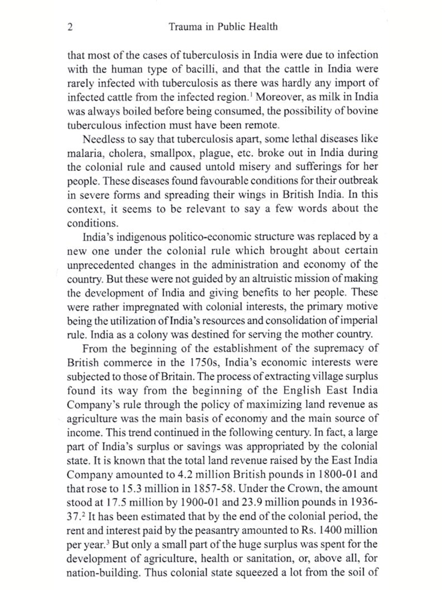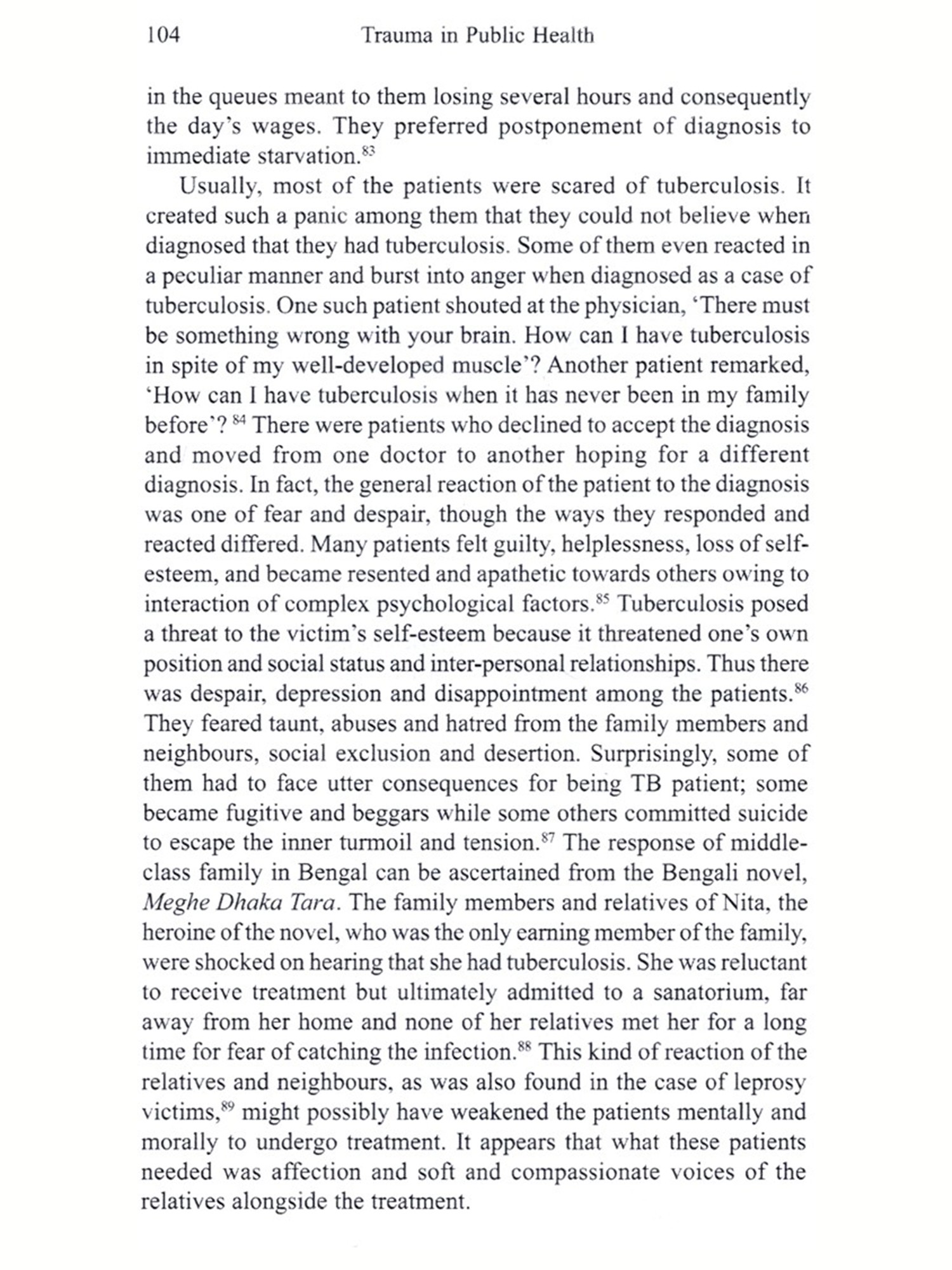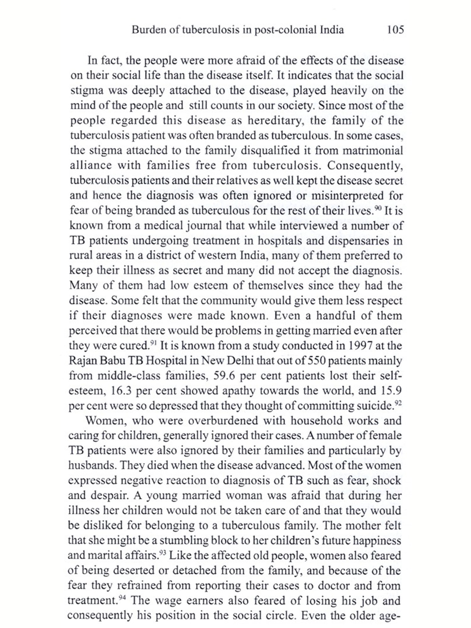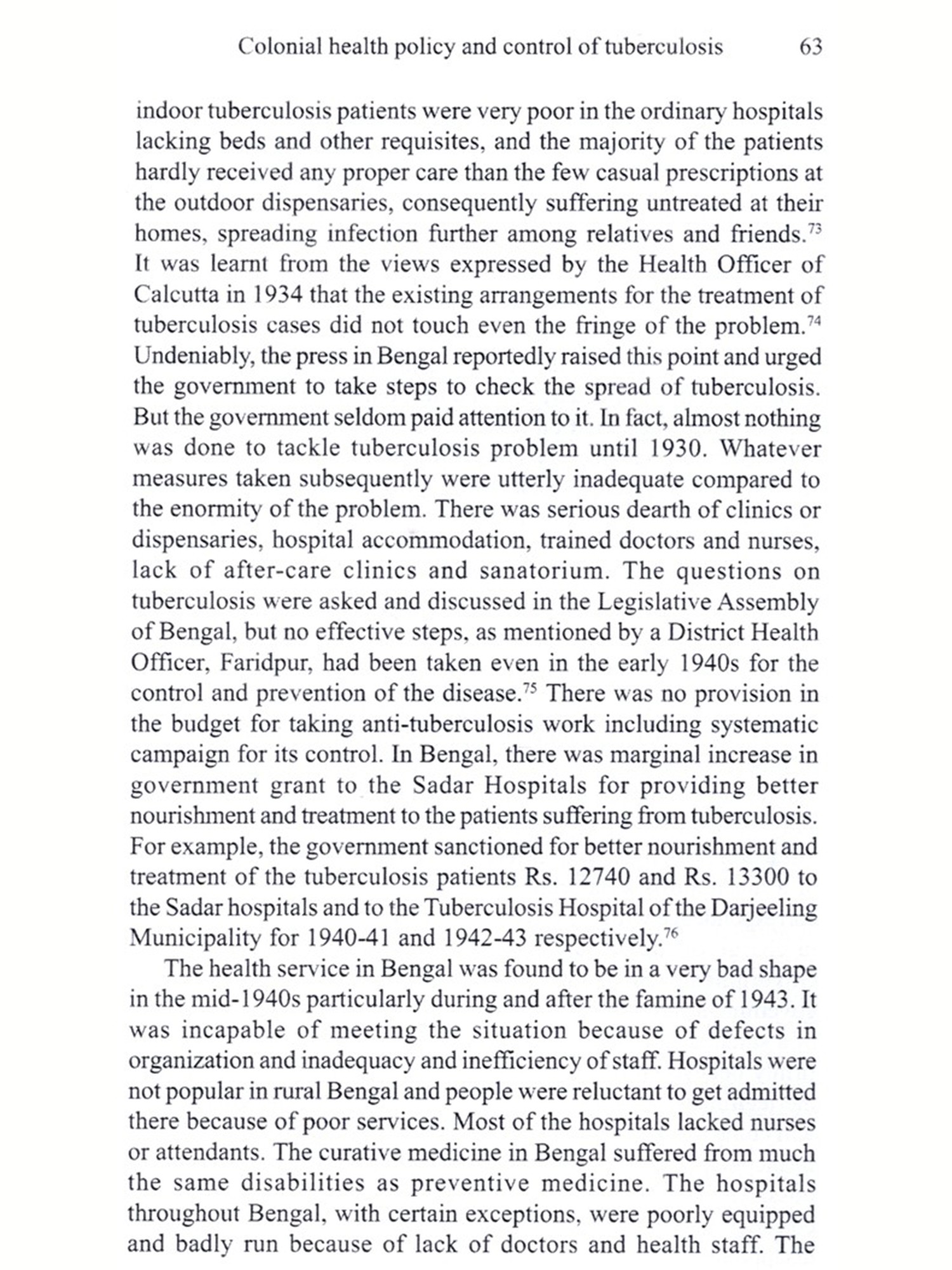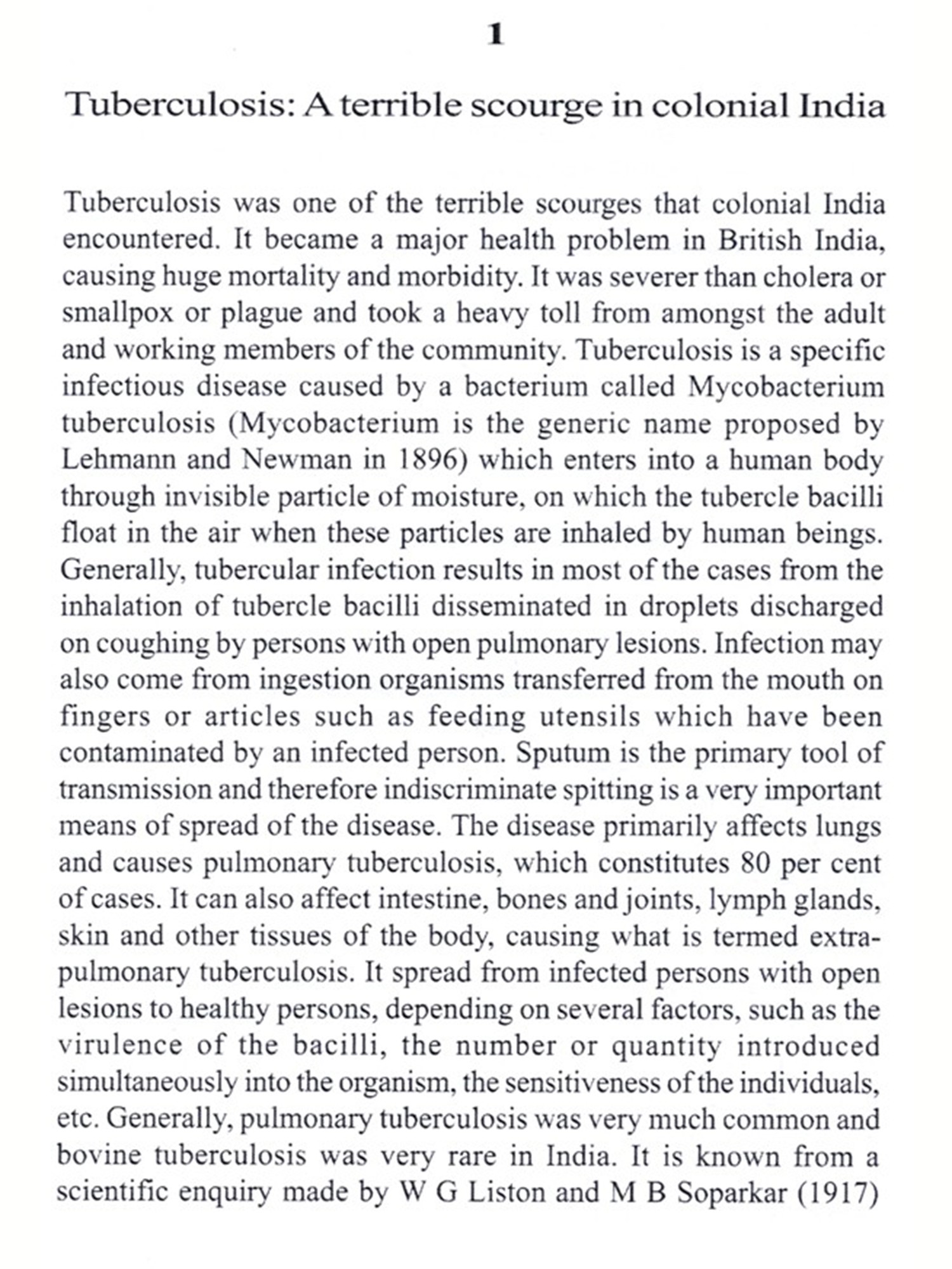 Historical scholarship has been engaged in the study of the social history of disease and medicine in colonial India for the last two-three decades. The subject has gripped the attention of a number of Indian and Western scholars and consequently, a number of works of very high quality have come out, which throw light on the socio-political significance of the developing concept of disease and public health in British India and helps see through the nature of development or underdevelopment of a given society at a specified time. However, unlike cholera, malaria, smallpox, or plague, tuberculosis in India has so far failed to receive the attention of the scholars. It is very recently that tuberculosis in India has become the subject of historical study.