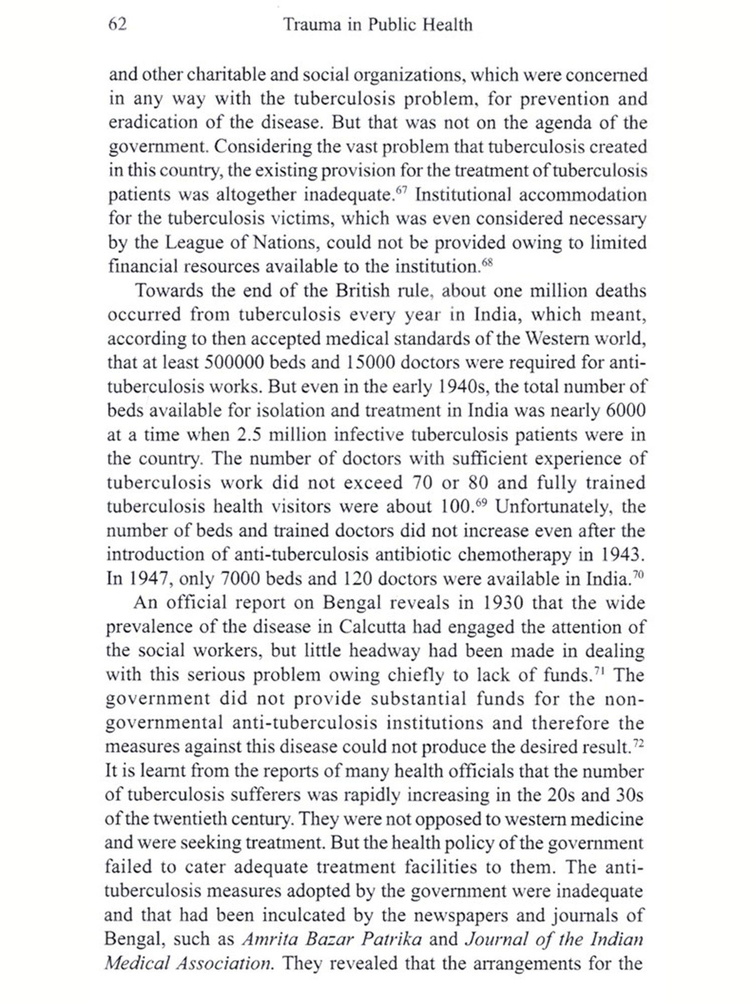 Tuberculosis became a major health problem in British India and was considered a serious constraint to public health in India. Despite the availability of effective chemotherapy, modern medical technology and their successful use in tuberculosis cases, the disease could not be checked satisfactorily. It is argued that governmental measures to control it were inadequate and callous. The British India Government was concerned with the health of the army and of white civilians. The bulk of the Indian people were neglected and left to their fate. Arguably, tuberculosis had instantly become a disease of the poor and continues to be so to this day. In fact, there is still a raging debate on whether poverty is the root cause of this disease and if nutrition and improved standard of living had any bearing on reducing its occurrence and death due to it. The present work seeks to investigate these aspects and attempts to supplement the findings of the scholars who have already worked on it