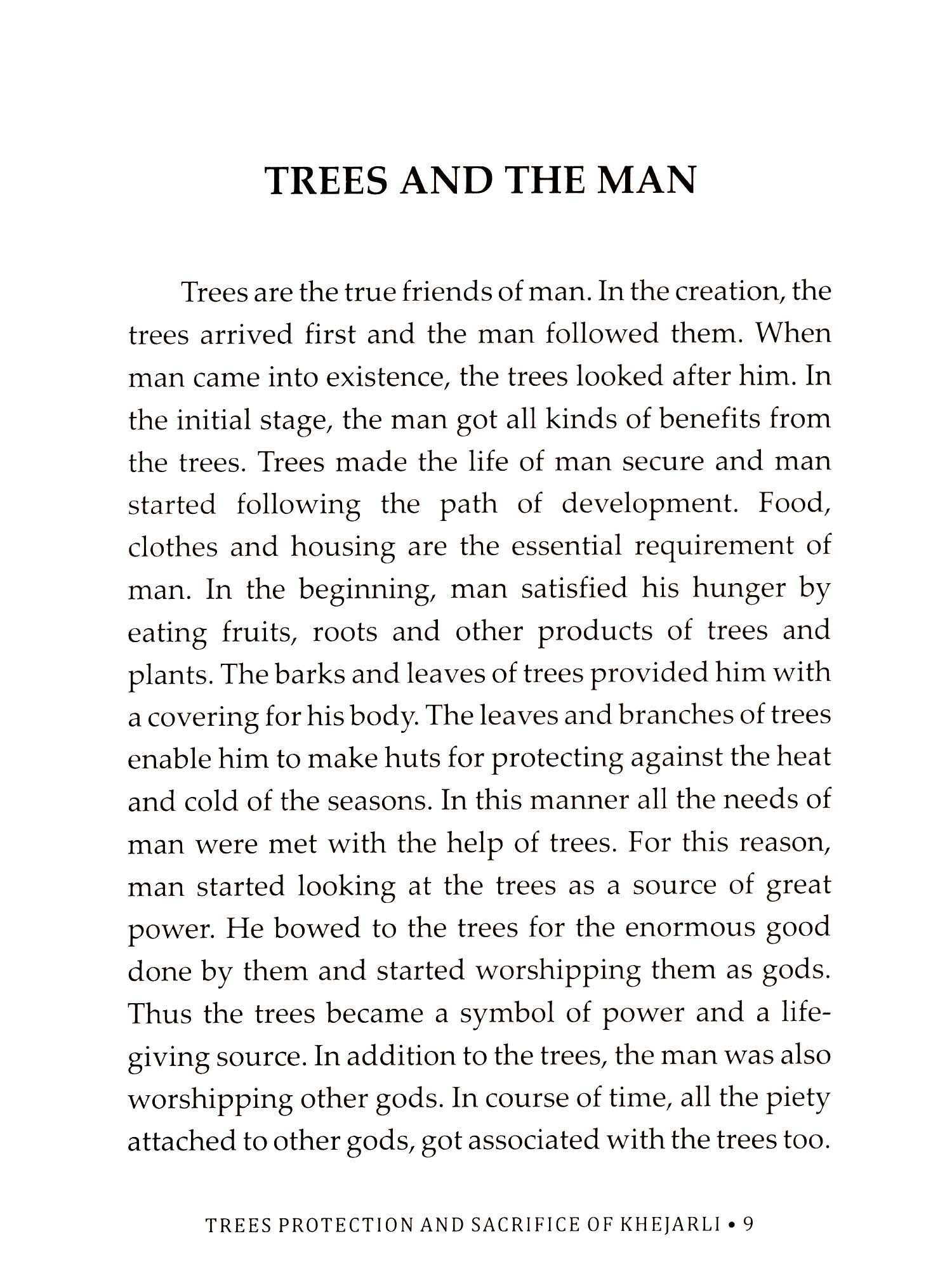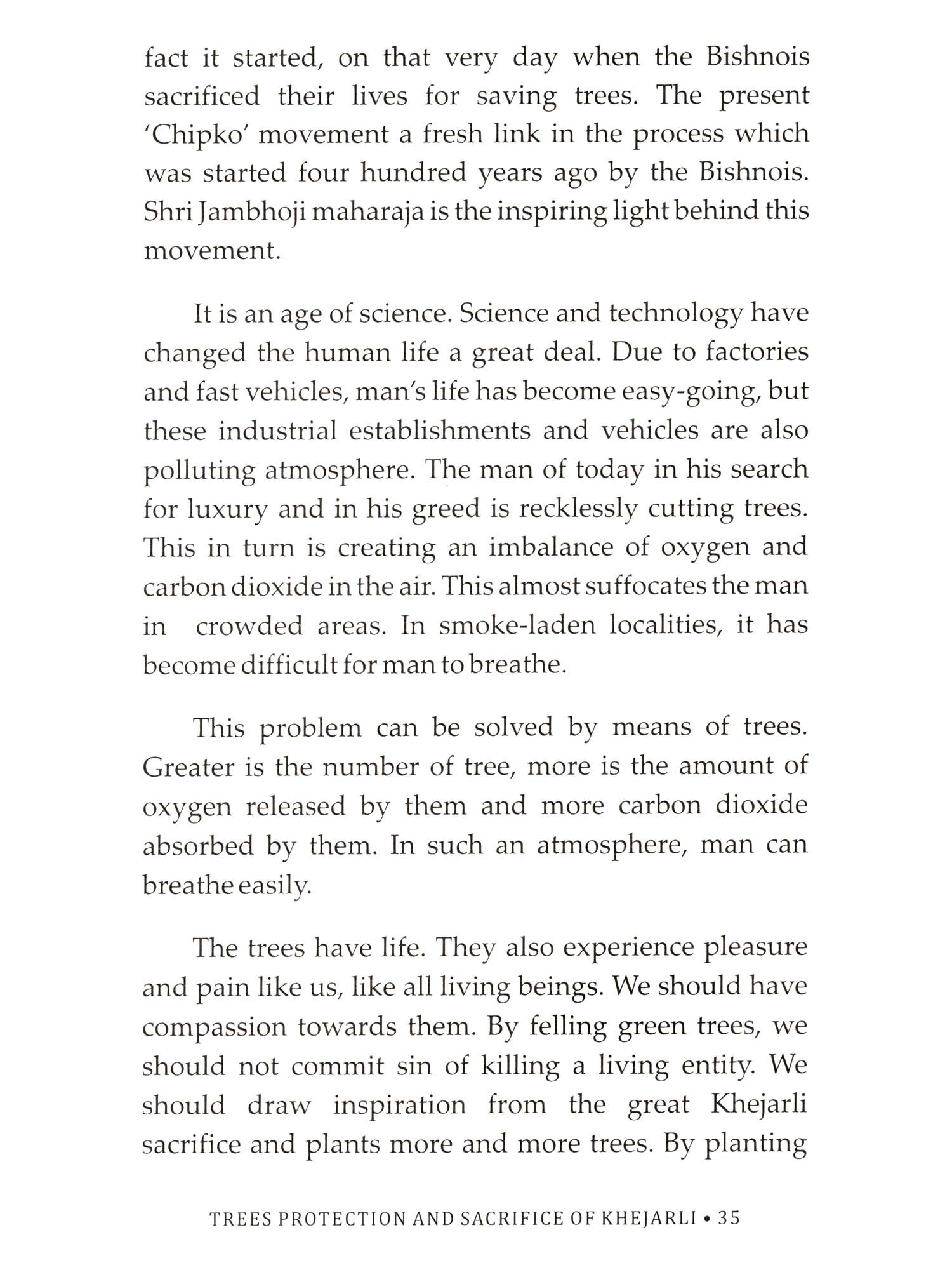 The man and the trees have a very old relationship. Right from the beginning, man has been depending heavily upon the trees to meet his needs. To destroy such a useful friend is the height of human folly. It is because of indiscriminate felling of trees that the environment is getting polluted, and the man's very existence is threatened. The Bishnois followed the dictate that even if their own life was sacrificed to save a tree, it was a worthwhile bargain. Guided by this ethos, they willingly and cheerfully allowed their own heads to be cut, rather than let the trees be felled. In the history of the entire world, there is the unique instance, in which the Bishnois in very large numbers, at least 363 to be precise, made the supreme sacrifice of their lives at Khejarli, a village near Jodhpur, but did not let the trees to be cut. It is indeed pathetic that man, instead of drawing inspiration from that unparalleled example of saving tree, is merrily cutting green trees. This is aggravating the problem of pollution.